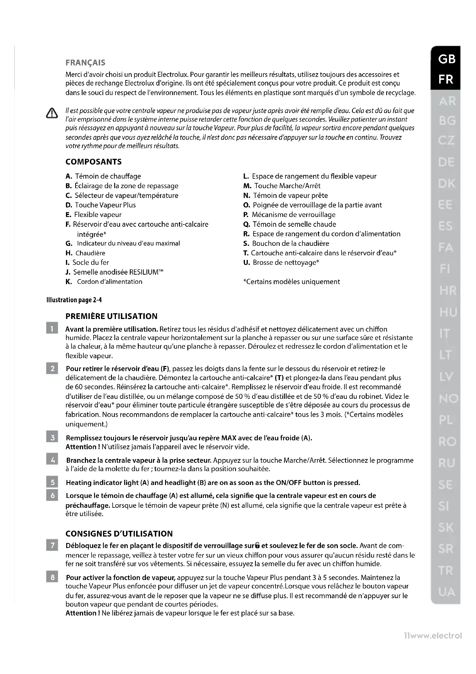 FRANÇAIS Merci d’avoir choisi un produit Electrolux. Pour garantir les meilleurs résultats, utilisez toujours des accessoires et pièces de rechange Electrolux d’origine. Ils ont été spécialement conçus pour votre produit. Ce produit est conçu dans le souci du respect de l’environnement. Tous les éléments en plastique sont marqués d’un symbole de recyclage. Il est possible que votre centrale vapeur ne produise pas de vapeur juste après avoir été remplie d’eau. Cela est dû au fait que l’air emprisonné dans le système interne puisse retarder cette fonction de quelques secondes. Veuillez patienter un instant puis réessayez en appuyant à nouveau sur la touche Vapeur. Pour plus de facilité, la vapeur sortira encore pendant quelques secondes après que vous ayez relâché la touche, il n’est donc pas nécessaire d’appuyer sur la touche en continu. Trouvez votre rythme pour de meilleurs résultats. COMPOSANTS A. Témoin de chauage B. Éclairage de la zone de repassage C. Sélecteur de vapeur/température D. Touche Vapeur Plus E. Flexible vapeur F. Réservoir d’eau avec cartouche anti-calcaire intégrée*