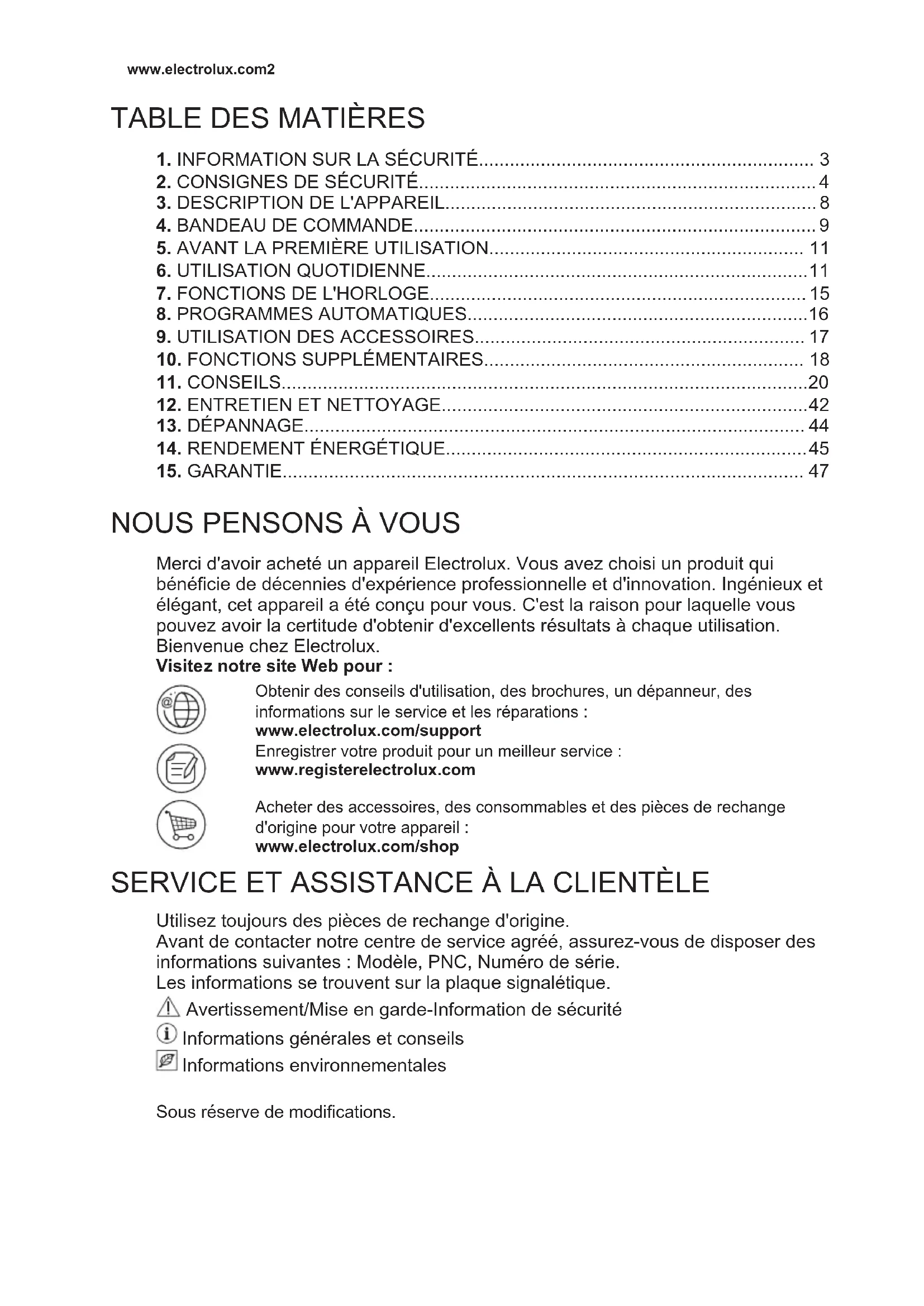 Merci d'avoir acheté un appareil Electrolux. Vous avez choisi un produit qui bénéficie de décennies d'expérience professionnelle et d'innovation. Ingénieux et élégant, cet appareil a été conçu pour vous. C'est la raison pour laquelle vous pouvez avoir la certitude d'obtenir d'excellents résultats à chaque utilisation. Bienvenue chez Electrolux. Visitez notre site Web pour : Obtenir des conseils d'utilisation, des brochures, un dépanneur, des informations sur le service et les réparations : www.electrolux.com/support Enregistrer votre produit pour un meilleur service : www.registerelectrolux.com Acheter des accessoires, des consommables et des pièces de rechange d'origine pour votre appareil : www.electrolux.com/shop