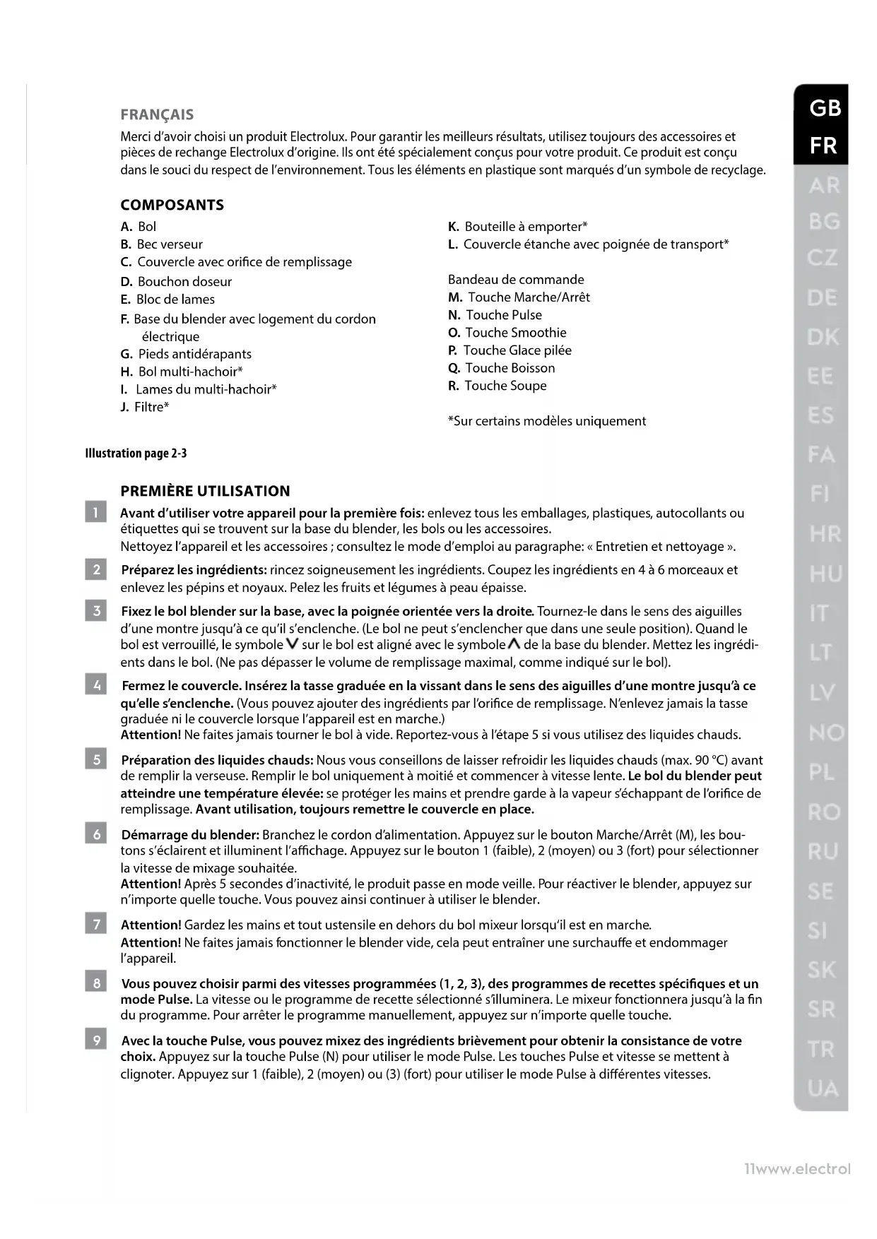 FRANÇAIS Merci d’avoir choisi un produit Electrolux. Pour garantir les meilleurs résultats, utilisez toujours des accessoires et pièces de rechange Electrolux d’origine. Ils ont été spécialement conçus pour votre produit. Ce produit est conçu dans le souci du respect de l’environnement. Tous les éléments en plastique sont marqués d’un symbole de recyclage. COMPOSANTS A. Bol B. Bec verseur C. Couvercle avec orice de remplissage D. Bouchon doseur E. Bloc de lames F. Base du blender avec logement du cordon électrique G. Pieds antidérapants H. Bol multi-hachoir*