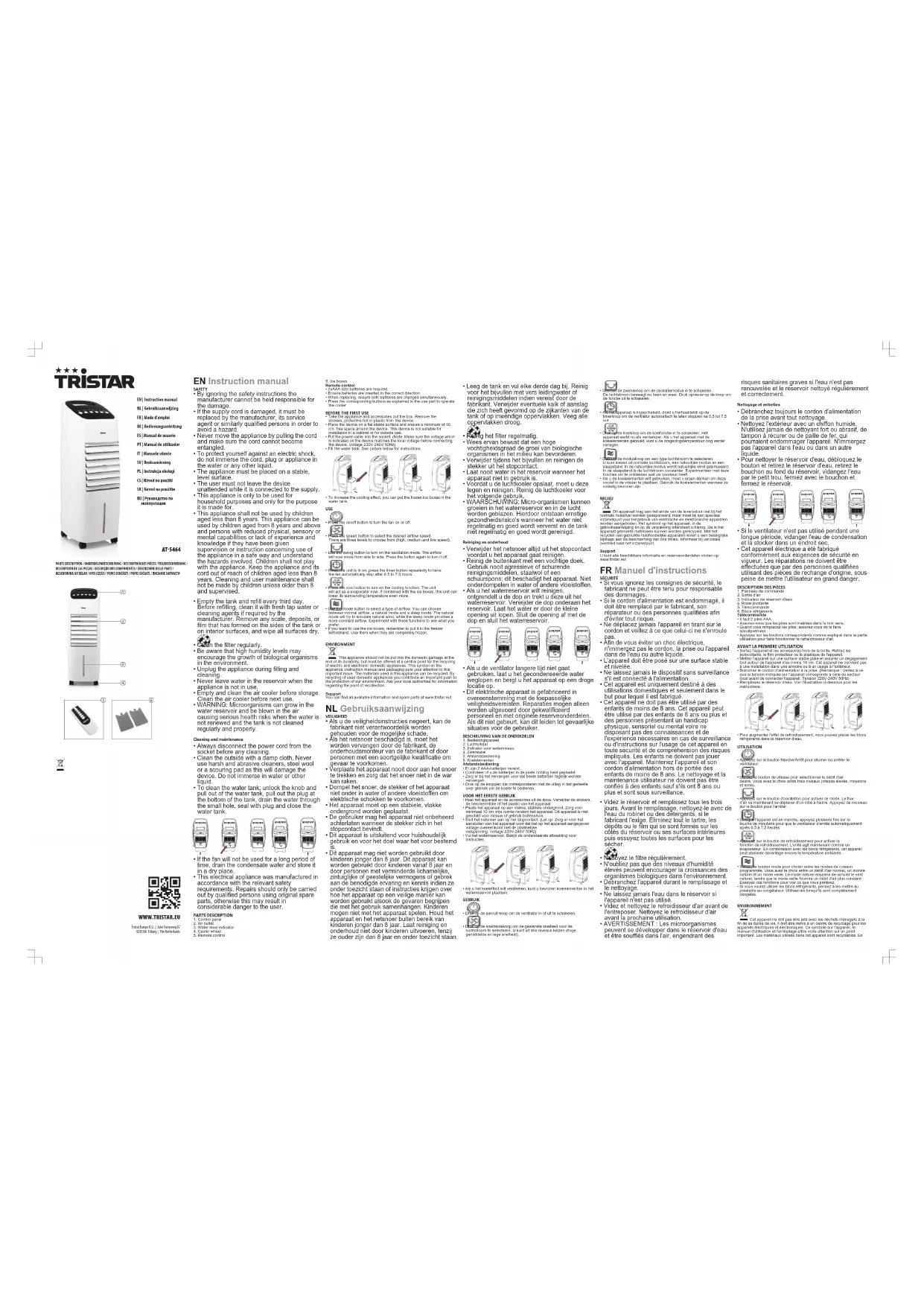- Cet appareil électrique a été fabriqué conformément aux exigences de sécurité en vigueur. Les réparations ne doivent être effectuées que par des personnes qualifiées utilisant des pièces de rechange d'origine, sous peine de mettre l'utilisateur en grand danger. DESCRIPTION DES PIÈCES1. Panneau de commande2. Sortie d'air3. Indicateur de réservoir d'eau4. Roue pivotante5. Télécommande6. Blocs réfrigérantsTélécommande• Il faut 2 piles AAA.• Assurez-vous que les piles sont insérées dans le bon sens.• Quand vous remplacez les piles, assurez-vous de le fairesimultanément.• Appuyez sur les boutons correspondants comme expliqué dans la partieutilisation pour faire fonctionner le rafraîchisseur d'air.AVANT LA PREMIÈRE UTILISATION• Sortez l'appareil et les accessoires hors de la boîte.Retirez lesautocollants, le film protecteur ou le plastique de l'appareil.• Mettez l'appareil sur une surface stable plate et assurez un dégagementtout autour de l'appareil d'au moins 10 cm. Cet appareil ne convient pasà une installation dans une armoire ou à un usage à l'extérieur.• Branchez le cordon d’alimentation à la prise.(Remarque: Veillez à ceque la tension indiquée sur l’appareil corresponde à celle du secteurlocal avant de connecter l'appareil.Tension220V-240V 50Hz)• Remplissez le réservoir d'eau. Voir l'illustration ci-dessous pour lesinstructions.• Pour augmenter l'effet de refroidissement, vous pouvez placer les blocsréfrigérants dans le réservoir d'eau.UTILISATION• Appuyez sur le bouton Marche/Arrêt pour allumer ou arrêter leventilateur.• Utilisez le bouton de vitesse pour sélectionner le débit d'airdésiré. Vous avez le choix entre trois niveaux (vitesse élevée, moyenneet lente).• Appuyez sur le bouton d'oscillation pour activer ce mode. Le fluxd'air va maintenant se déplacer d'un côté à l'autre. Appuyez de nouveausur le bouton pour l'arrêter.• Lorsque l'appareil est en marche, appuyez plusieurs fois sur latouche de minuterie pour que le ventilateur s'arrête automatiquementaprès 0,5 à 7,5 heures.• Appuyez sur le bouton de refroidissement pour activer lafonction de refroidissement. L'unité agit maintenant comme unévaporateur. En combinaison avec les blocs réfrigérants, cet appareilpeut abaisser davantage encore la température ambiante.• Utilisez le bouton mode pour choisir entre les modes de cuissonprogrammés. Vous avez le choix entre un débit d'air normal, un mondenaturel et un mode veille. Le mode naturel essaiera de simuler le ventnaturel, tandis que le mode veille fournira un débit d'air plus constant.Essayez ces fonctions pour voir ce que vous préférez.• Si vous voulez utiliser les blocs réfrigérants, pensez à les mettre aupréalable au congélateur. Utilisez-les lorsqu'ils sont complètementcongelés.ENVIRONNEMENTCet appareil ne doit pas être jeté avec les déchets ménagers à lafin de sa durée de vie, il doit être remis à un centre de recyclage pour lesappareils électriques et électroniques. Ce symbole sur l'appareil, lemanuel d'utilisation et l'emballage attire votre attention sur un pointimportant. Les matériaux utilisés dans cet appareil sont recyclables. Enrecyclant vos appareils, vous contribuez de manière significative à la protection de notre environnement. Renseignez-vous auprès des autorités locales pour connaître les centres de collecte des déchets. Support Vous retrouvez toutes les informations et pièces de rechange sur www.tristar.eu! DEBedienungsanleitung SICHERHEIT