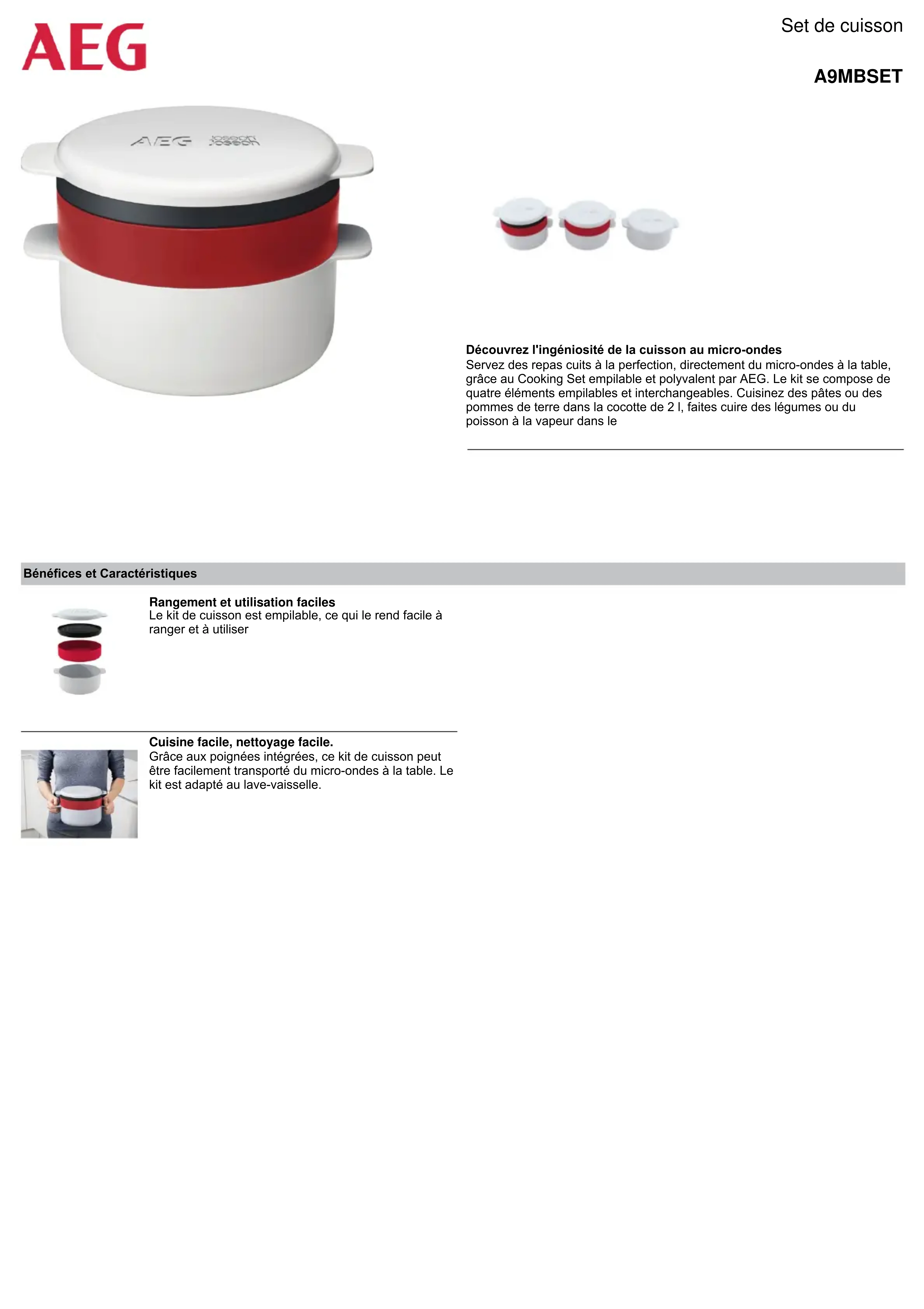 Cuisine facile, nettoyage facile. Grâce aux poignées intégrées, ce kit de cuisson peut être facilement transporté du micro-ondes à la table. Le kit est adapté au lave-vaisselle. Rangement et utilisation faciles Le kit de cuisson est empilable, ce qui le rend facile à ranger et à utiliser Découvrez l'ingéniosité de la cuisson au micro-ondes Servez des repas cuits à la perfection, directement du micro-ondes à la table, grâce au Cooking Set empilable et polyvalent par AEG. Le kit se compose de quatre éléments empilables et interchangeables. Cuisinez des pâtes ou des pommes de terre dans la cocotte de 2 l, faites cuire des légumes ou du poisson à la vapeur dans le Bénéfices et Caractéristiques Set de cuisson A9MBSETpartCode