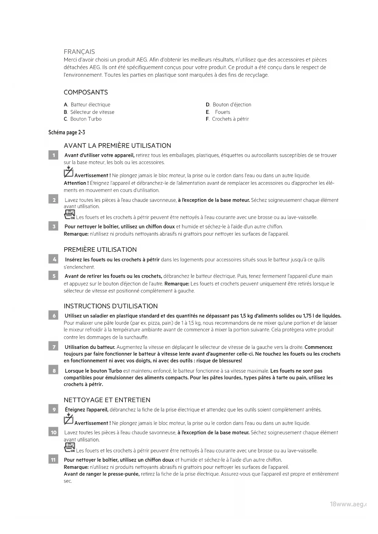 9 Éteignez l’appareil, débranchez la che de la prise électrique et attendez que les outils soient complètement arrêtés. Avertissement ! Ne plongez jamais le bloc moteur, la prise ou le cordon dans l’eau ou dans un autre liquide. 10 Lavez toutes les pièces à l’eau chaude savonneuse, à l’exception de la base moteur. Séchez soigneusement chaque élément avant utilisation. Les fouets et les crochets à pétrir peuvent être nettoyés à l’eau courante avec une brosse ou au lave-vaisselle. 11 Pour nettoyer le boîtier, utilisez un chion doux et humide et séchez-le à l’aide d’un autre chion. Remarque: n’utilisez ni produits nettoyants abrasifs ni grattoirs pour nettoyer les surfaces de l’appareil. Avant de ranger le presse-purée, retirez la che de la prise électrique. Assurez-vous que l’appareil est propre et entièrement sec.19www.aeg.com