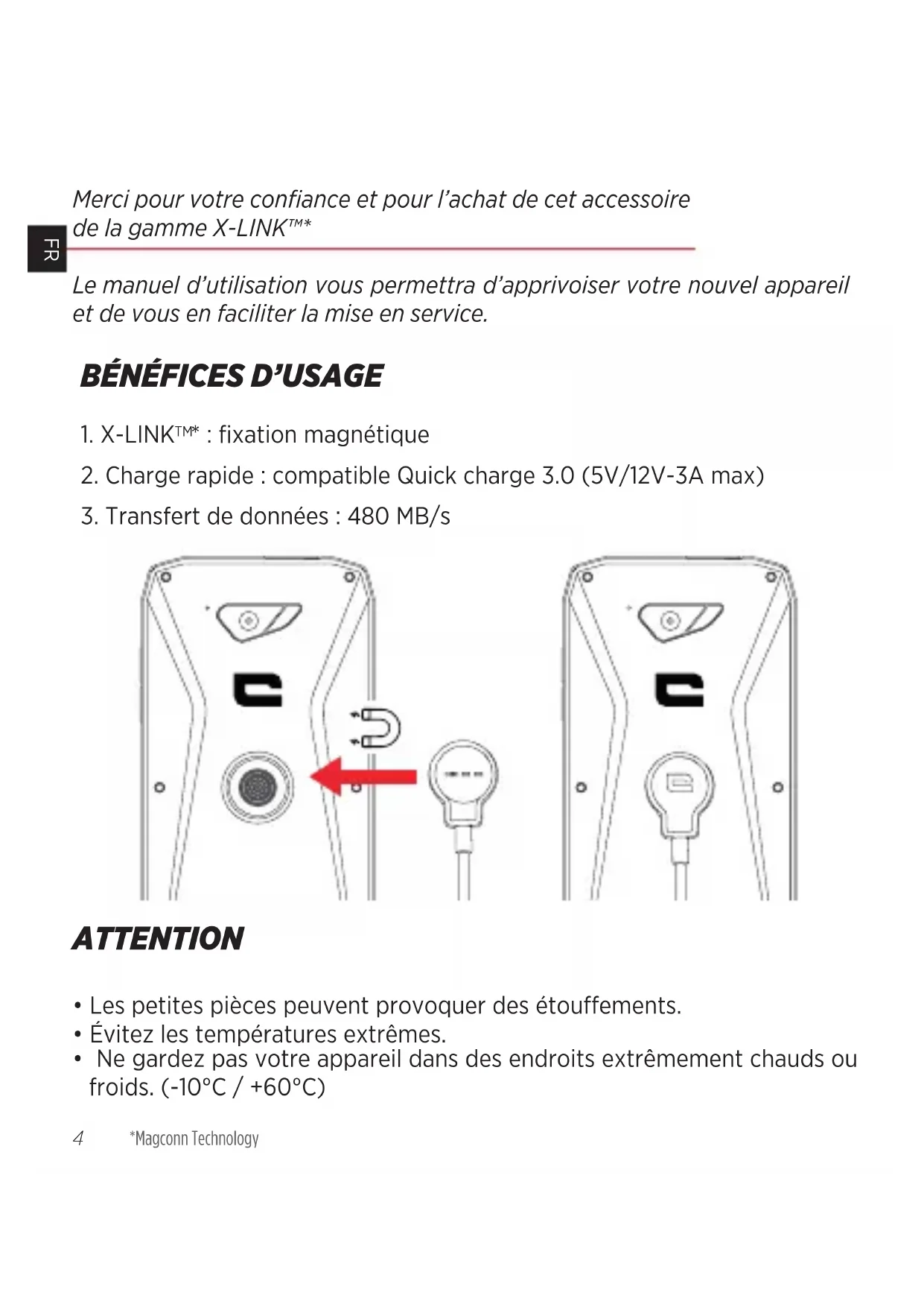 - Ne gardez pas votre appareil dans des endroits extrêmement chauds ou froids. (-10°C / +60°C) *Magconn Technology5