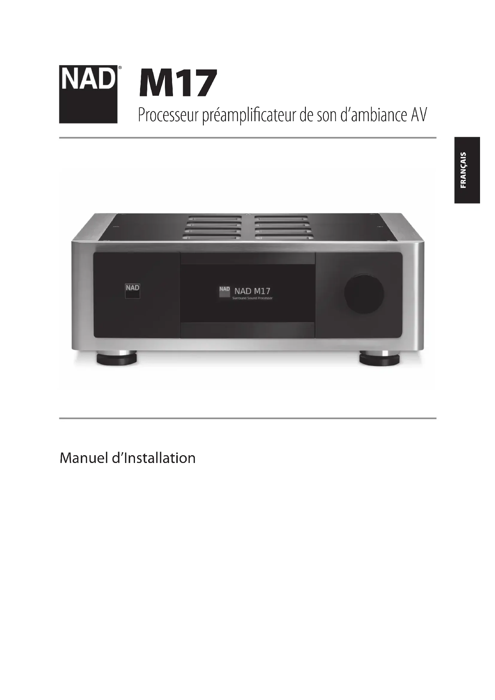 Dimensions de l’appareil (L x H x P) 435 x 156 x 386 mm 17 ⁄ x 6 / x 15 ¼ po Poids emballé 17,5 kg (38,6 lbs) Les caractéristiques de ce matériel peuvent être modifiées sans préavis. Pour la documentation au dernier indice et les caractéristiques les plus récentes concernant le M17, veuillez vous connecter à www. nadelectronics.com. Fabriqué sous licence sous les brevets US N°s : 5,451,942; 5,956,674; 5,974,380;5,978,762; 6,226,616; 6,487,535; 7,212,872; 7,333,929; 7,392,195; 7,272,567 ainsi que d’autres brevets U.S. et internationaux établis ou en cours. DTS est une marque déposée commerciale ; les logos et le Symbole DTS, DTS-HD et DTS-HD Master Audio sont des marques commerciales de la soiciété DTS, Inc. ©1996-2009 DTS, Inc. Tous Droits Réservés.Fabriqué sous licence de Dolby Laboratories. « Dolby », « Dolby Atmos » et le symbole double-D sont des marques déposées de la société Dolby Laboratories. HDMI, le logo HDMI et la désignation High-Definition Multimedia Interface sont des marques commerciales ou des marques déposées de la société HDMI Licensing LLC. Ce produit intègre une technologie de protection des droits d’auteur qui est protégée par les revendications de procédé de certains brevets américains et par d’autres droits de propriété intellectuelle détenus par Macrovision Corporation et par d’autres titulaires de droits. L’utilisation de cette technologie de protection des droits d’auteur doit être autorisée par Macrovision Corporation. Cette technologie est uniquement destinée à un usage domestique et à d’autres utilisations limitées sauf autorisation de Macrovision Corporation. Il est interdit de procéder à toute ingénierie inverse ou à tout désassemblage.