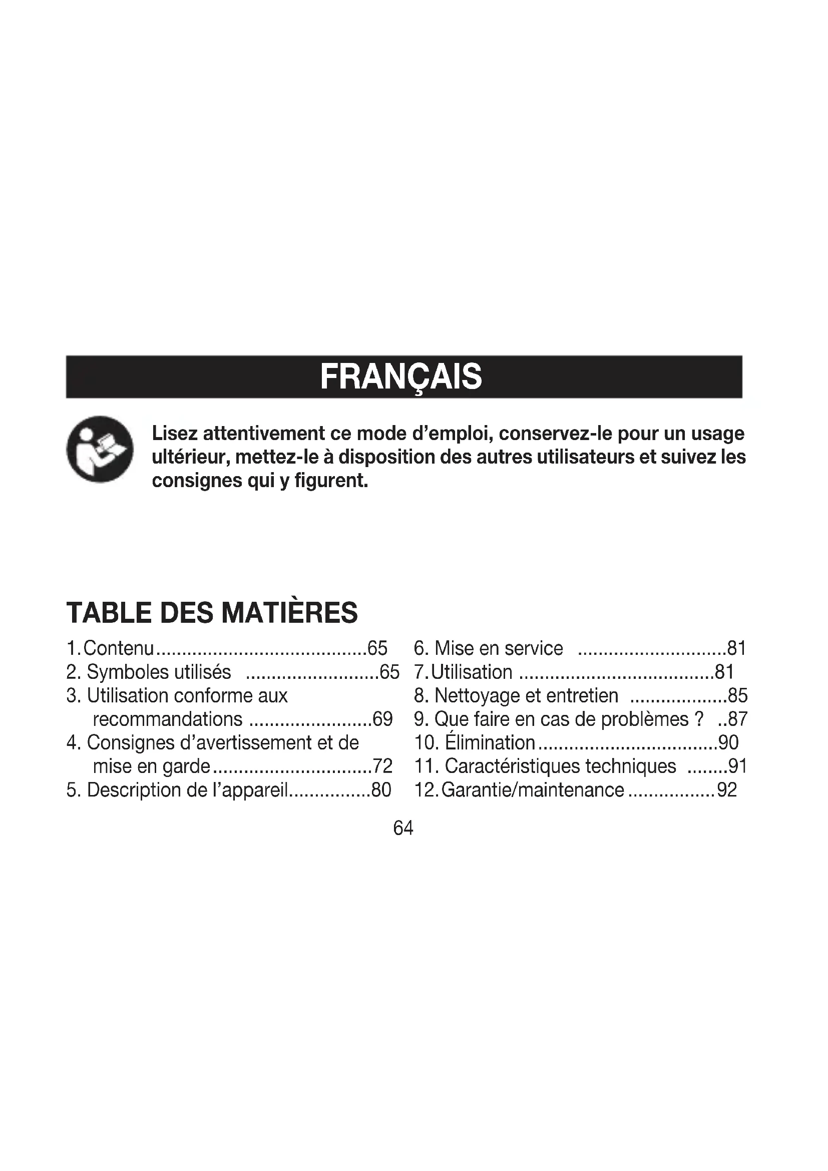 - Pour utiliser l’appareil seul, l’utilisateur doit avoir au moins 12ans. L’utilisation chez les enfants de moins de 12ans ne doit se faire que sous la surveillance ou l’assistance d’un adulte.73