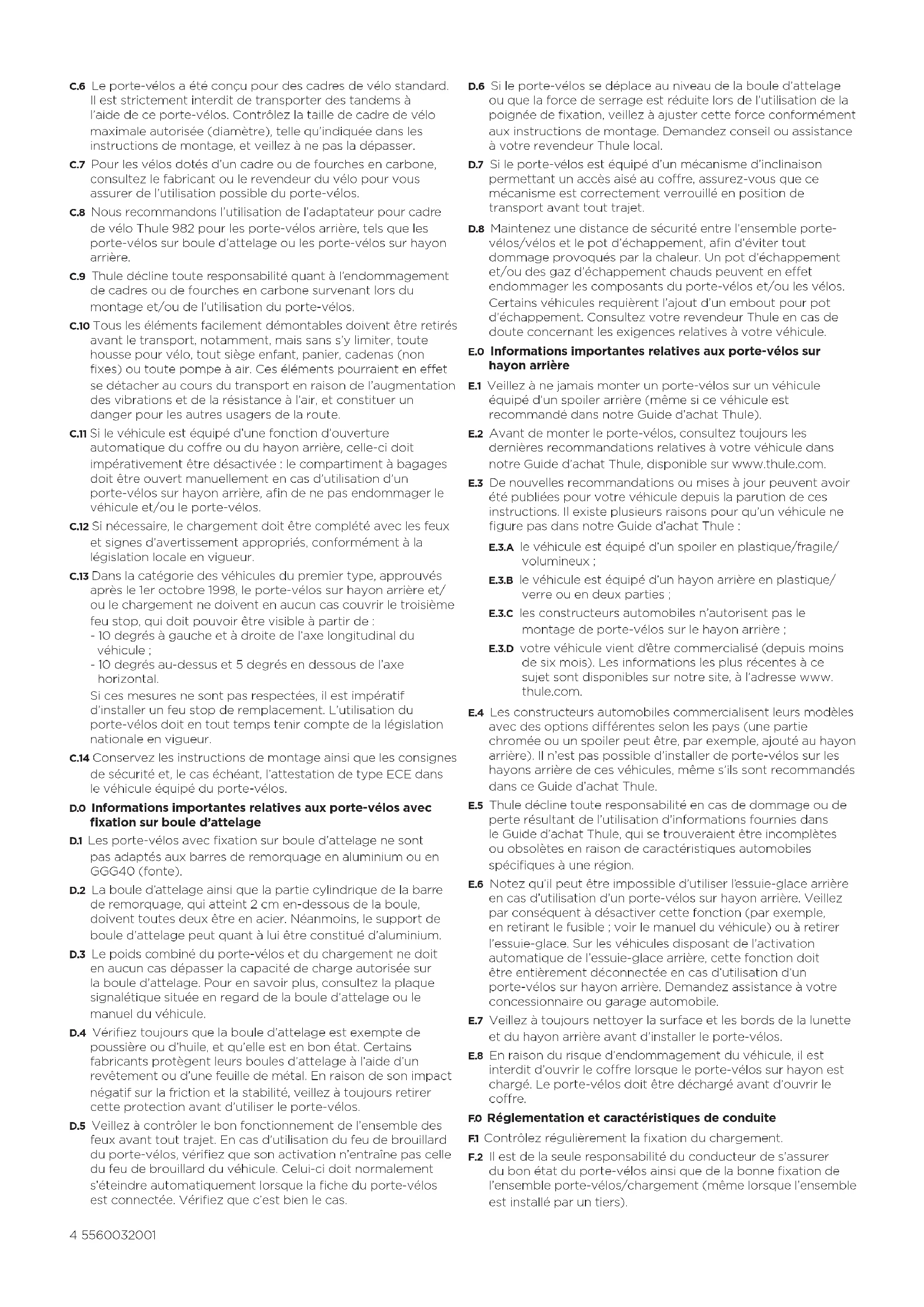 A.0 Informations générales A.1 Thule décline toute responsabilité en cas de dommages corporels, de dommages matériels de biens mobiliers ou immobiliers, de perte de profit, ou de tout autre dommage ou perte résultant du montage ou de l’utilisation inappropriés du porte-vélos, notamment, mais sans s’y limiter, en cas de montage ou d’utilisation ne respectant pas les instructions d’assemblage ou de montage, ou toute autre instruction, écrite ou verbale, formulée par Thule ou un revendeur Thule. A.2 Le porte-vélos et l’ensemble des pièces qui le composent ne doivent en aucun cas être modifiés. A.3 Consultez votre revendeur Thule pour toute question relative au fonctionnement, à l’utilisation ou aux limites du porte-vélos. Veuillez également lire attentivement toutes les instructions et informations de garantie avant de monter et d’utiliser le porte-vélos. B.0 Installation B.1 Reportez-vous aux instructions d’assemblage afin de contrôler la présence de tous les éléments requis. B.2 Lisez et suivez scrupuleusement les instructions d’assemblage et les recommandations fournies, le cas échéant. Procédez au montage de l’unité dans l’ordre indiqué, en commençant par l’étape 1, puis 2, 3, etc. B.3 Ne tentez en aucun cas d’installer le porte-vélos autrement que conformément aux instructions de montage. C.0 Chargement C.1 Le poids de chargement maximal autorisé pour le porte- vélos, tel que spécifié dans les instructions d’assemblage, ne doit en aucun cas être dépassé. Par ailleurs, la charge maximale préconisée pour le véhicule lui-même a toujours priorité sur les spécifications indiquées dans les instructions d’assemblage. C’est toujours le poids maximal recommandé le plus faible qui s’applique, et qui ne doit en aucun cas être dépassé. C.2 Le poids maximal autorisé pour le porte-vélos, tel que spécifié dans les instructions d’assemblage, s’applique aux véhicules en mouvement comme à l’arrêt. C.3 Le chargement doit être correctement fixé. Notez que l’utilisation de tendeurs élastiques est strictement prohibée. C.4 Contrôlez le poids maximal autorisé par vélo indiqué dans les instructions de montage, et veillez à ne pas le dépasser. C.5 Lors du chargement de vélos sur un porte-vélos sur hayon arrière ou sur boule d’attelage, veillez à toujours placer les vélos les plus lourds et les plus volumineux du côté le plus près de la voiture.4 5560032001 C.6 Le porte-vélos a été conçu pour des cadres de vélo standard. Il est strictement interdit de transporter des tandems à l’aide de ce porte-vélos. Contrôlez la taille de cadre de vélo maximale autorisée (diamètre), telle qu’indiquée dans les instructions de montage, et veillez à ne pas la dépasser. C.7 Pour les vélos dotés d’un cadre ou de fourches en carbone, consultez le fabricant ou le revendeur du vélo pour vous assurer de l’utilisation possible du porte-vélos. C.8 Nous recommandons l’utilisation de l’adaptateur pour cadre de vélo Thule 982 pour les porte-vélos arrière, tels que les porte-vélos sur boule d’attelage ou les porte-vélos sur hayon arrière. C.9 Thule décline toute responsabilité quant à l’endommagement de cadres ou de fourches en carbone survenant lors du montage et/ou de l’utilisation du porte-vélos. C.10 Tous les éléments facilement démontables doivent être retirés avant le transport, notamment, mais sans s’y limiter, toute housse pour vélo, tout siège enfant, panier, cadenas (non fixes) ou toute pompe à air. Ces éléments pourraient en eet se détacher au cours du transport en raison de l’augmentation des vibrations et de la résistance à l’air, et constituer un danger pour les autres usagers de la route. C.11 Si le véhicule est équipé d’une fonction d’ouverture automatique du core ou du hayon arrière, celle-ci doit impérativement être désactivée : le compartiment à bagages doit être ouvert manuellement en cas d’utilisation d’un porte-vélos sur hayon arrière, afin de ne pas endommager le véhicule et/ou le porte-vélos. C.12 Si nécessaire, le chargement doit être complété avec les feux et signes d’avertissement appropriés, conformément à la législation locale en vigueur. C.13 Dans la catégorie des véhicules du premier type, approuvés après le 1er octobre 1998, le porte-vélos sur hayon arrière et/ ou le chargement ne doivent en aucun cas couvrir le troisième feu stop, qui doit pouvoir être visible à partir de : - 10 degrés à gauche et à droite de l’axe longitudinal du véhicule ; - 10 degrés au-dessus et 5 degrés en dessous de l’axe horizontal. Si ces mesures ne sont pas respectées, il est impératif d’installer un feu stop de remplacement. L’utilisation du porte-vélos doit en tout temps tenir compte de la législation nationale en vigueur. C.14 Conservez les instructions de montage ainsi que les consignes de sécurité et, le cas échéant, l’attestation de type ECE dans le véhicule équipé du porte-vélos. D.0 Informations importantes relatives aux porte-vélos avec fixation sur boule d’attelage D.1 Les porte-vélos avec fixation sur boule d’attelage ne sont pas adaptés aux barres de remorquage en aluminium ou en GGG40 (fonte). D.2 La boule d’attelage ainsi que la partie cylindrique de la barre de remorquage, qui atteint 2 cm en-dessous de la boule, doivent toutes deux être en acier. Néanmoins, le support de boule d’attelage peut quant à lui être constitué d’aluminium. D.3 Le poids combiné du porte-vélos et du chargement ne doit en aucun cas dépasser la capacité de charge autorisée sur la boule d’attelage. Pour en savoir plus, consultez la plaque signalétique située en regard de la boule d’attelage ou le manuel du véhicule. D.4 Vérifiez toujours que la boule d’attelage est exempte de poussière ou d’huile, et qu’elle est en bon état. Certains fabricants protègent leur