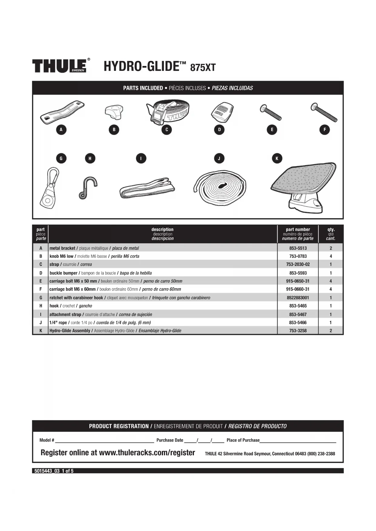 REPAIR OR REPLACEMENT OF A DEFECTIVE PRODUCT OR THE ISSUANCE OF A REFUND OR CREDIT (AS DETERMINED BY THULE) IS A PURCHASER’S EXCLUSIVE REMEDY UNDER THIS WARRANTY. DAMAGE TO A PURCHASER’S VEHICLE, CARGO AND/OR TO ANY OTHER PERSON OR PROPERTY IS EXCLUDED. THIS WARRANTY IS EXPRESSLY MADE IN LIEU OF ANY AND ALL OTHER WARRANTIES, EXPRESS OR IMPLIED, INCLUDING THE WAR- RANTIES OF MERCHANTABILITY AND FITNESS FOR A PARTICULAR PURPOSE. THULE’S SOLE LIABILITY TO ANY PURCHASER IS LIMITED TO THE REMEDY SET FORTH ABOVE. IN NO EVENT WILL THULE BE LIABLE FOR ANY LOST PROFITS, LOST SALES, OR FOR ANY CONSEQUEN- TIAL, DIRECT, INDIRECT, INCIDENTAL, SPECIAL, EXEMPLARY, OR PUNITIVE DAMAGES OR FOR ANY OTHER DAMAGES OF ANY KIND OR NATURE. SOME STATES DO NOT ALLOW THE EXCLUSION OR LIMITATION OF INCIDENTAL OR CONSEQUENTIAL DAMAGES, SO THE ABOVE LIMITATIONS MAY NOT BE APPLICABLE. THIS WARRANTY GIVES YOU SPECIFIC LEGAL RIGHTS, AND YOU MAY ALSO HAVE OTHER RIGHTS WHICH VARY FROM STATE TO STATE. THULE garantit tous les systèmes de support de la marque THULE pour voitures et ses accessoires fabriqués par THULE tant que le premier acheteur au détail détient le produit. Cette garantie prend fin si un acheteur transfert le produit à une personne. Selon les limites et les exclusions décrites dans cette garantie, THULE remédiera aux défauts de matériaux ou de maind’oeuvre en réparant ou en remplaçant, à sa discrétion, un produit défectueux sans frais de pièces ou de main d’oeuvre. De plus, THULE peut décider, à sa discrétion, de ne pas réparer ou remplacer un produit défectueux mais d’émettre un remboursement de l’acheteur égal au prix payé pour le produit, ou un crédit à utiliser pour l’achat d’un système de support de charge THULE neuf. Aucune garantie n’est émise pour les défauts causés par une usure normale, pour la rouille esthétique, pour les rayures, pour l’utilisation inégale du véhicule, pour toute modification de celuici, pour tout type de réparation, pour un système de support de charge autre que ceux autorisés par THULE. Aucune garantie n’est émise pour les défauts résultant de conditions hors du contrôle de THULE, notamment une mauvaise utilisation, une surcharge ou un assemblage ou montage non conformes aux instructions écrites ou directives de THULE incluses avec le produit ou mises à disposition de l’acheteur. Aucune garantie n’est émise pour les produits THULE achetés hors des États-Unis, du Canada ou du Mexique. Dans le cas où un produit serait défectueux, l’acheteur doit contacter soit le revendeur THULE chez lequel le produit a été acheté, soit le centre de service après-vente Thule. Si le revendeur ou le centre de service après-vente Thule n’est pas en mesure de corriger le défaut, l’acheteur doit contacter Thule par écrit ou par téléphone (voir les coordonnées en bas de cette page). Dans l’éventualité où un produit doit être renvoyé à THULE, un technicien THULE à l’adresse ou au numéro de téléphone indiqué ci-dessous fournira à l’acheteur l’adresse d’envoi appropriée et des instructions supplémentaires. Veuillez noter que l’acheteur sera responsable des frais d’envoi du produit à THULE et qu’une preuve d’achat sous la forme de l’original d’une facture ou d’un reçu d’achat et une description détaillée du défaut doivent être inclus dans l’envoi.