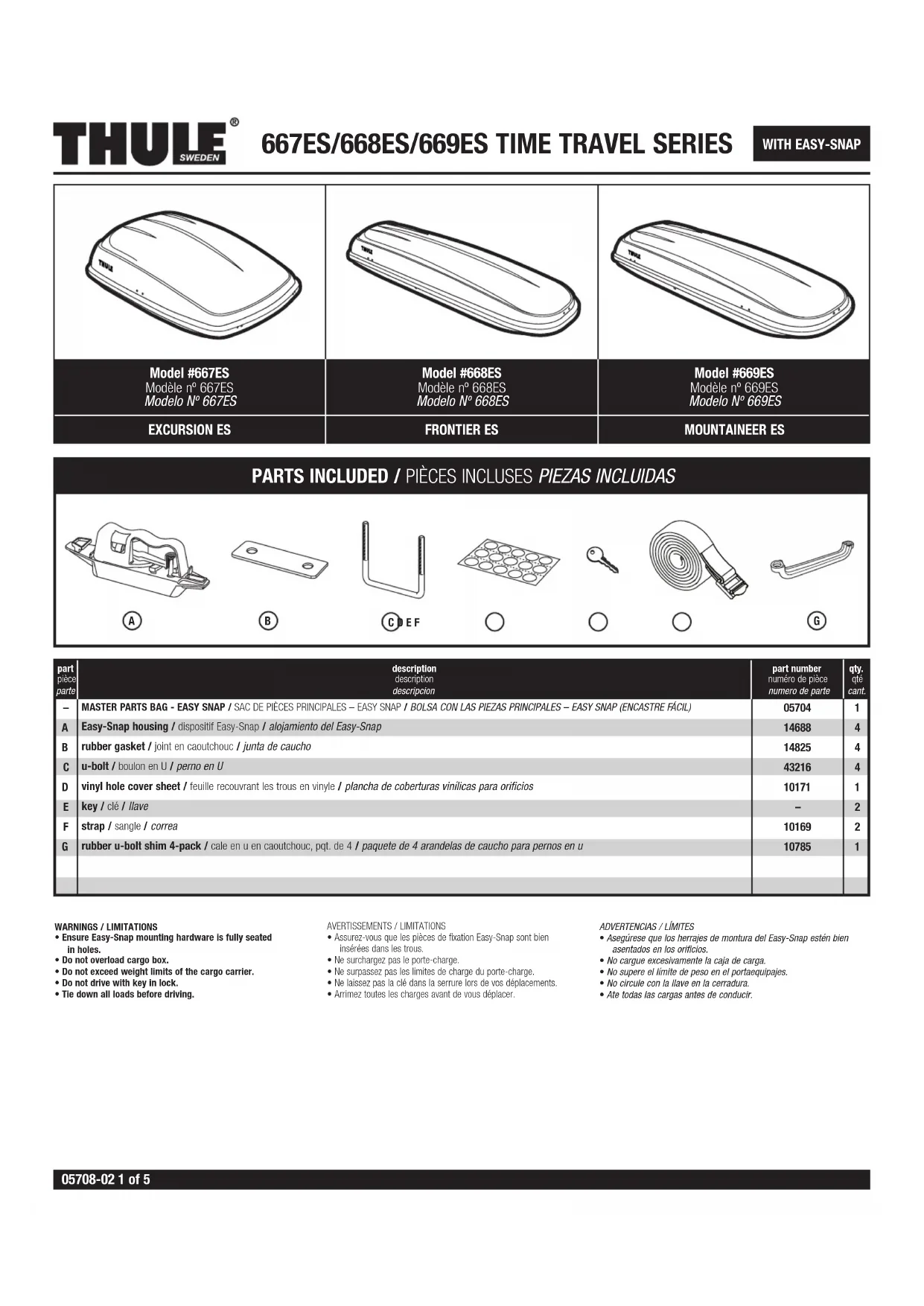 REPAIR OR REPLACEMENT OF A DEFECTIVE PRODUCT OR THE ISSUANCE OF A REFUND OR CREDIT (AS DETERMINED BY THULE) IS A PURCHASER’S EXCLUSIVE REMEDY UNDER THIS WARRANTY. DAMAGE TO A PURCHASER’S VEHICLE, CARGO AND/OR TO ANY OTHER PERSON OR PROPERTY IS EXCLUDED. THIS WARRANTY IS EXPRESSLY MADE IN LIEU OF ANY AND ALL OTHER WARRANTIES, EXPRESS OR IMPLIED, INCLUDING THE WARRANTIES OF MERCHANTABILITY AND FITNESS FOR A PARTICULAR PURPOSE. THULE’S SOLE LIABILITY TO ANY PURCHASER IS LIMITED TO THE REMEDY SET FORTH ABOVE. IN NO EVENT WILL THULE BE LIABLE FOR ANY LOST PROFITS, LOST SALES, OR FOR ANY CONSEQUENTIAL, DIRECT, INDIRECT, INCIDENTAL, SPECIAL, EXEMPLARY, OR PUNITIVE DAMAGES OR FOR ANY OTHER DAMAGES OF ANY KIND OR NATURE. SOME STATES DO NOT ALLOW THE EXCLUSION OR LIMITATION OF INCIDENTAL OR CONSEQUENTIAL DAMAGES, SO THE ABOVE LIMITATIONS MAY NOT BE APPLICABLE. THIS WARRANTY GIVES YOU SPECIFIC LEGAL RIGHTS, AND YOU MAY ALSO HAVE OTHER RIGHTS WHICH VARY FROM STATE TO STATE. THULE CAR RACK SYSTEMS LIMITED LIFETIME WARRANTY [EFFECTIVE JANUARY 1, 2006] Register online at www.thuleracks.com/register Register online at www.thuleracks.com/register THULE 42 Silvermine Road Seymour, Connecticut 06483 203 881-9600 THULE garantit tous les systèmes de support de la marque THULE pour voitures et ses accessoires fabriqués par THULE tant que le premier acheteur au détail détient le produit. Cette garantie prend fin si un acheteur transfert le produit à une personne. Selon les limites et les exclusions décrites dans cette garantie, THULE remédiera aux défauts de matériaux ou de maind’oeuvre en réparant ou en remplaçant, à sa discrétion, un produit défectueux sans frais de pièces ou de main d’oeuvre. De plus, THULE peut décider, à sa discré- tion, de ne pas réparer ou remplacer un produit défectueux mais d’émettre un remboursement de l’acheteur égal au prix payé pour le produit, ou un crédit à utiliser pour l’achat d’un système de support de charge THULE neuf. Aucune garantie n’est émise pour les défauts causés par une usure nor- male, pour la rouille esthétique, pour les rayures, pour l’utilisation inégale du véhicule, pour toute modification de celuici, pour tout type de répara- tion, pour un système de support de charge autre que ceux autorisés par THULE. Aucune garantie n’est émise pour les défauts résultant de conditions hors du contrôle de THULE, notamment une mauvaise utilisation, une surcharge ou un assemblage ou montage non conformes aux instruc- tions écrites ou directives de THULE incluses avec le produit ou mises à disposition de l’acheteur. Aucune garantie n’est émise pour les produits Thule achetés hors des États-Unis, du Canada ou du Mexique. Si un produit est défectueux, l’acheteur doit contacter le revendeur THULE auquel il a acheté le produit ou un centre de service Thule autorisé. Si le revendeur ou le centre de services Thule autorisé n’est pas en mesure de corriger le défaut, l’acheteur doit contacter THULE par écrit ou au téléphone à : THULE 42 Silvermine Road Seymour, Connecticut 06483 Attn: Customer Service 203 881-9600 Dans l’éventualité où un produit doit être renvoyé à THULE, un technicien THULE à l’adresse ou au numéro de téléphone indiqué ci-dessus fourni- ra à l’acheteur l’adresse d’envoi appropriée et des instructions supplé- mentaires. Veuillez noter que l’acheteur sera responsable des frais d’en- voi du produit à THULE et qu’une preuve d’achat sous la forme de l’orig- inal d’une facture ou d’un reçu d’achat et une description détaillée du défaut doivent être inclus dans l’envoi.