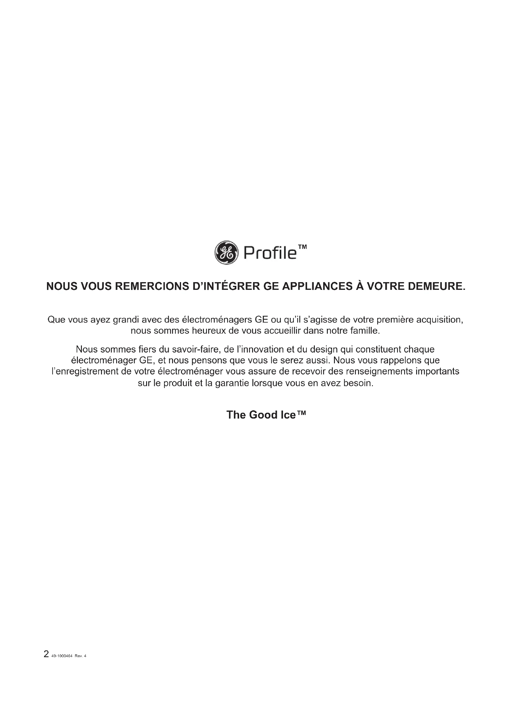 - Soutien Au Consommateur GE est une marque de commerce de General Electric Company. Fabriqué sous licence de marque.2 49-1000464 Rev. 4 NOUS VOUS REMERCIONS D’INTÉGRER GE APPLIANCES À VOTRE DEMEURE. Que vous ayez grandi avec des électroménagers GE ou qu’il s’agisse de votre première acquisition, nous sommes heureux de vous accueillir dans notre famille. Nous sommes fiers du savoir-faire, de l’innovation et du design qui constituent chaque électroménager GE, et nous pensons que vous le serez aussi. Nous vous rappelons que l’enregistrement de votre électroménager vous assure de recevoir des renseignements importants sur le produit et la garantie lorsque vous en avez besoin. The Good Ice™ ™49-1000464 Rev. 4 3 ATTENTION Pour réduire le risque de blessure lors de l’utilisation de votre Opal, observez les consignes de sécurité élémentaires suivantes Ŷ 1HUHWLUH]DXFXQHpWLTXHWWHDSSRVpHVXUODPDFKLQHjJODoRQVTXLprésente des renseignements sur la sécurité, les avertissements ou le produit. Ŷ 5LVTXHDVVRFLpjXQHFKDUJHORXUGH1RXVUHFRPPDQGRQVTXHGHX[SHUVRQQHVGpSODFHQWHWLQVWDOOHQWODPDFKLQHjJODoRQVDILQde prévenir les blessures. p. 18