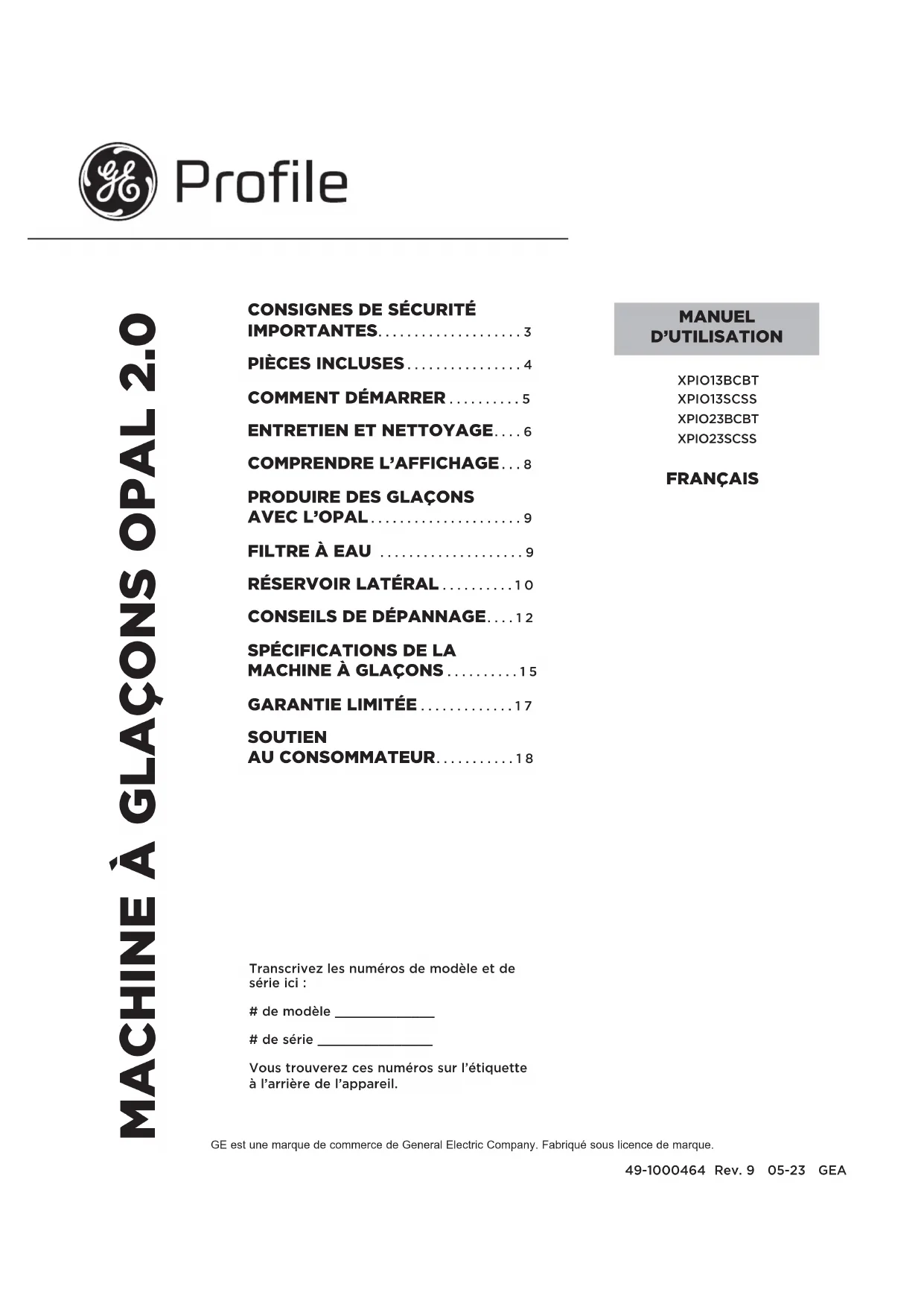 SOUTIEN AU CONSOMMATEUR ...........18 GE est une marque de commerce de General Electric Company. Fabriqué sous licence de marque.2 49-1000464 Rev. 9 NOUS VOUS REMERCIONS D’INTÉGRER GE APPLIANCES À VOTRE DEMEURE. Que vous ayez grandi avec des électroménagers GE ou qu’il s’agisse de votre première acquisition, nous sommes heureux de vous accueillir dans notre famille. Nous sommes fiers du savoir-faire, de l’innovation et du design qui constituent chaque électroménager GE, et nous pensons que vous le serez aussi. Nous vous rappelons que l’enregistrement de votre électroménager vous assure de recevoir des renseignements importants sur le produit et la garantie lorsque vous en avez besoin. The Good Ice™ ™49-1000464 Rev. 9 3 ATTENTION Pour réduire le risque de blessure lors de l’utilisation de votre Opal, observez les consignes de sécurité élémentaires suivantes Ŷ 1HUHWLUH]DXFXQHpWLTXHWWHDSSRVpHVXUODPDFKLQHjJODoRQVTXLprésente des renseignements sur la sécurité, les avertissements ou le produit. Ŷ 5LVTXHDVVRFLpjXQHFKDUJHORXUGH1RXVUHFRPPDQGRQVTXHGHX[SHUVRQQHVGpSODFHQWHWLQVWDOOHQWODPDFKLQHjJODoRQVDILQGHprévenir les blessures.