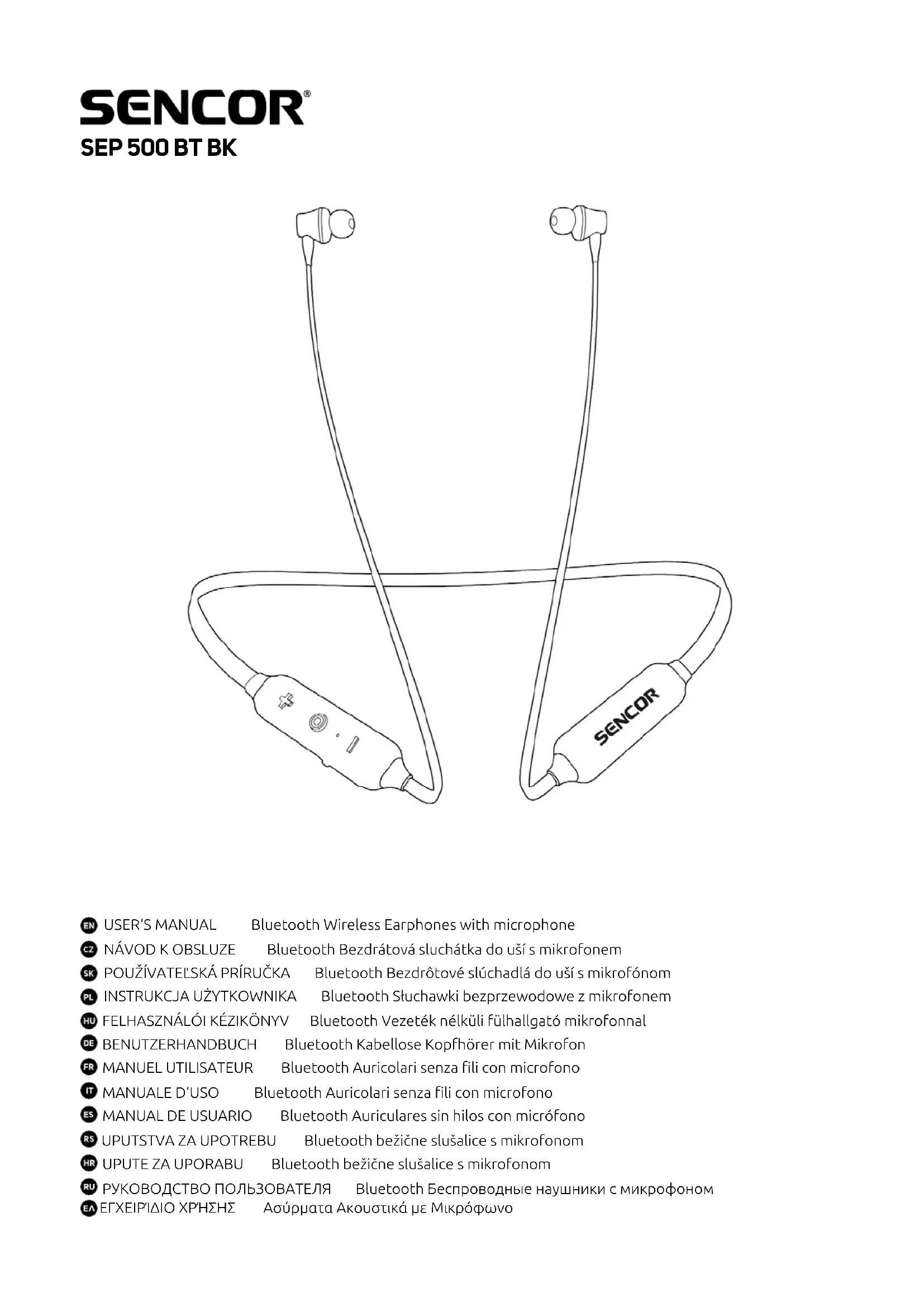 Tragen der Kopfhörer:Halsbügel hinter den Hals aufsetzen und Stöpsel in die Ohren stecken, damit diese gut im Gehörgang sitzen.Produktdatenblatt:Durchmesser des Wandlers: Ø 10 mmImpedanz: 32 Ω +/- 10 %Frequenzbereich: 20 Hz – 20 kHzEmpndlichkeit: 120 dB +/- 3 dB / 1 MW (Schalldruckpegel bei 1 kHz)Empndlichkeit des Mikrofons: -42 dB ± 3 dBAkku: Lithium-Polymer-Akkumulator, 80 mAhHaltezeit beim Abspielen von Musik: 6 Stunden mit 50% LautstärkeHaltezeit beim Telefongespräch: 6 Stunden mit 50% LautstärkeHaltezeit im Standby-Modus: 10 TageLadezeit: 2 StundenReichweite: 10 MeterBetriebstemperatur 0–40 °CSteckverbinder: Micro USBGewicht: 19 gSchutzart: IPX4Bluetooth v5.0Zubehör:1. Set mit größeren und kleineren Ohransätzen2. Micro USB Kabel3. GebrauchsanweisungEinschalten Abwechselndes Blinken blau/rotAusschalten Die Anzeige blinkt 3x rotKopplungsmodus Abwechselndes Blinken blau/rotVerbindung / Abspielen von MusikAnzeige blinkt alle 5 Sekunden blauHinweis auf niedrigen AkkustandAnzeige blinkt alle 60 Sekunden rotAuaden Anzeige leuchtet während des Ladevorganges rotVollständig aufgeladenDie Anzeige leuchtet blau. Die Anzeige erlischt nach 1 Stunde ab dem vollständigen AuadenInstructions et informations concernant la mise au rebut des matériaux d‘em-ballage usagésDébarrassez-vous de l‘emballage dans un centre public de collecte des déchets.Mise au rebut des appareils électriques et électroniques usagés Le symbole sur l‘appareil, ses accessoires ou son emballage indique qu‘ils ne peuvent pas être jetés avec les déchets ménagers. Merci de vous débarrasser de ce produit dans votre centre de collecte de déchets électriques et électroniques local. Dans certains pays d‘Europe, il est possible de rapporter les produits aux revendeurs en cas d‘achat d‘un nouveau produit. Le mise au rebut correcte de ce produit permet de préserver de précieuses ressources naturelles et évite les impacts négatifs sur l‘environnement et la santé publique résultant de la mauvaise élimination des déchets. Merci de consulter vos autorités locales ou le centre de collecte le plus proche pour obtenir plus de détails. La mise au rebut inappropriée de ce type de déchets peut tombée sous le coup de législations nationales et engendrer des amendes.Pour les entreprises de l‘union européenne Si vous souhaitez vous débarrasser d‘un appareil électrique ou électronique, collectez les informations nécessaires auprès de votre vendeur ou votre fournisseur.Mise au rebut dans les pays en dehors de la communauté européenne Si vous souhaitez vous débarrasser de ce produit, collectez les informations nécessaires concernant la méthode appropriée auprès du département gouvernemental local ou de votre vendeur. Cet appareil est conforme aux normes et réglementations de l‘union européenne relatives à la sécurité électromagnétique et électrique. Nous nous réservons le droit de modifi er le texte, le design ou les caractéristiques techniques de cet appareil sans notifi cation préalable. Le soussigné, FAST ČR, a.s., déclare que l‘équipement radioélectrique du type [SEP 500 BT BK] est conforme à la directive 2014/53/UE. Le texte complet de la déclaration UE de conformité est disponible à l‘adresse internet suivante: www.sencor.eu MANUEL D’UTILISATEUR Oreillettes Bluetooth collier Particularités : 1. Design ergonomique 2. Qualité sonore parfaite pour apprécier la musique 3. Ultra léger, seulement 19g 4. Confortable pour un port toute la journée 5. Contrôle adapté et communications mains-libres 6. Système magnétique anti-perte 7. Adapté au sport avec une résistance à l’eau IPX4 8. Jusqu’à 5 heures d’autonomieNous vous remercions d’avoir choisi nos derniers écouteurs Bluetooth, veuillez lire attentivement le présent Manuel d’utilisateur avant d’utiliser ces écouteurs et conservez-le pour une consultation future.Avant l’utilisation, veuillez lire toutes les Instructions de sécurité pour vous assurer d’un usage sûr et approprié.Instructions de sécurité : Veuillez respecter la réglementation du pays ou de la région où vous conduisez.Ne démontez et ne modiez les écouteurs sous aucun prétexte, risque d’endommagement ou de brûlure.En cas de problème de qualité, veuillez envoyer les écouteurs à un centre de maintenance spécialisé pour réparation.Veuillez garder l’équipement et ses accessoires hors de portée des enfants et des animaux.Des températures extrêmes causeront une déformation de l’équipement, une réduction de la capacité de charge et une réduction de la durée de vie.Veuillez ne pas plonger l’appareil dans l’eau. L’appareil est uniquement résistant à la projection. La garantie expire en cas de dommage par immersion dans l’eau.Vous risquez des dommages auditifs en écoutant à fort volume sur des périodes prolongées. Il est recommandé de se contenter du volume minimal nécessaire pour parler et écouter de la musique confortablement.Instructions d’utilisationFonctions cléInterrupteur