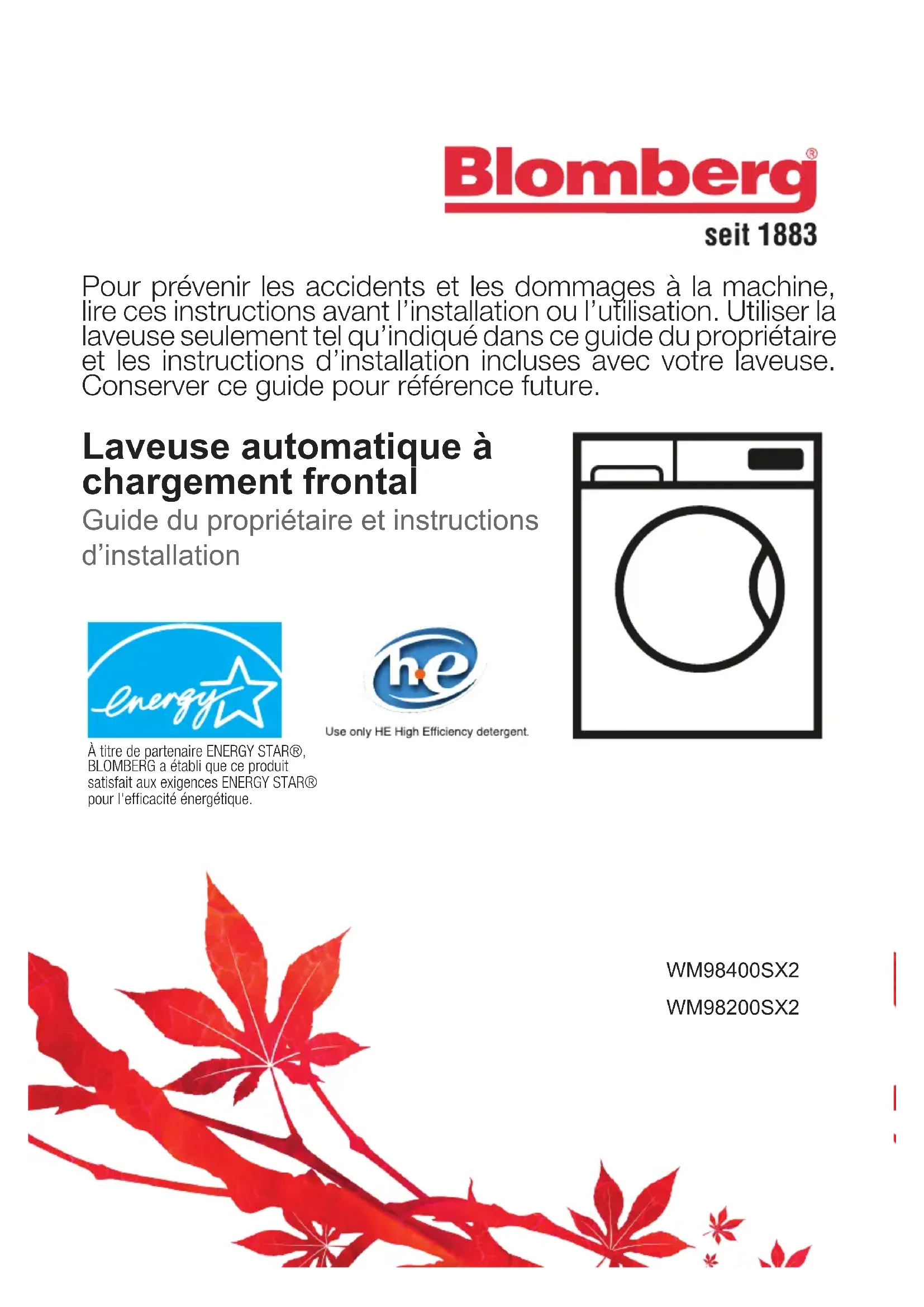 WM98400SX2 WM98200SX2 Laveuse automatique à chargement frontal Guide du propriétaire et instructions d’installation Pour prévenir les accidents et les dommages à la machine, lire ces instructions avant l’installation ou l’utilisation. Utiliser la laveuse seulement tel qu’indiqué dans ce guide du propriétaire et les instructions d’installation incluses avec votre laveuse. Conserver ce guide pour référence future. À titre de partenaire ENERGY STAR®, BLOMBERG a établi que ce produit satisfait aux exigences ENERGY STAR® pour l'efficacité énergétique.2 / French Laveuse automatique à chargement frontal Veuillez lire ce guide en premier! Cher client, Nous espérons que votre produit qui a été fabriqué dans des installations modernes et qui a passé à travers une procédure de contrôle de qualité très stricte vous donnera d'excellents résultats. Donc, nous vous recommandons de lire attentivement et complètement ce document avant d'utiliser votre produit et nous vous recommandons aussi de le garder pour consultation future. Ce guide vous... ...aidera à utiliser votre laveuse d'une façon rapide et sécuritaire.