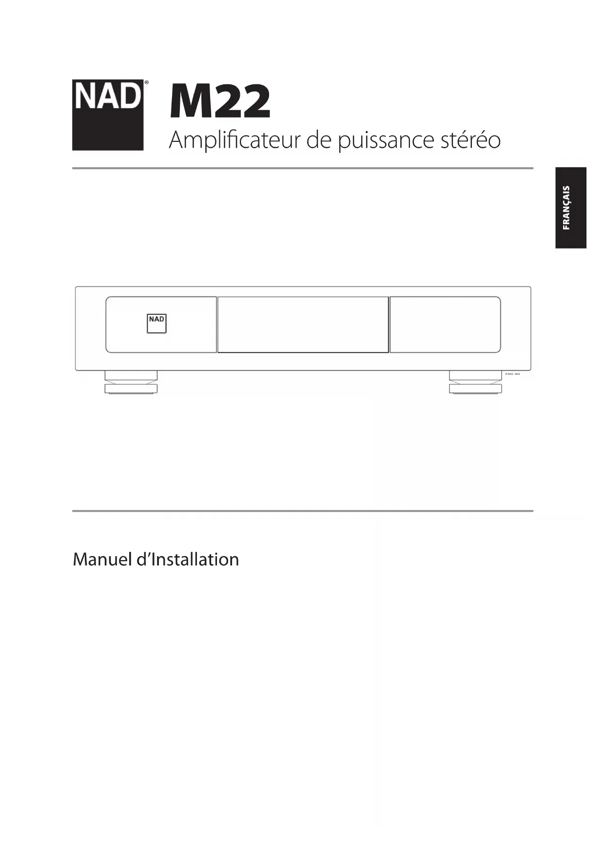INTRODUCTION POUR COMMENCER CONTENU DE L’EMBALLAGEVous trouverez dans l’emballage de votre M22• Un cordon d’alimentation secteur amovible• Quatre pattes magnétiques• clé mémoire USB • chion de nettoyage• Guide d’installation rapideGUIDE DE CONFIGURATION RAPIDESi vous ne pouvez simplement pas attendre avant d’explorer les performances de votre nouveau NAD M22, la lecture du guide de CONFIGURATION RAPIDE ci-dessous est fortement conseillée pour vous aider à démarrer.Assurez-vous que le M22 est débranché avant de faire des raccordements. Il est également recommandé d’éteindre ou de débrancher tous les dispositifs associés pendant que vous établissez ou coupez un quelconque signal ou que vous réalisez un branchement secteur. Réglez la commande de volume de la source externe au niveau minimum. La source externe peut être un préampli, un processeur, un ampli ou tout autre dispositif.1 Réglez le commutateur SELECT (Sélectionner) à BALANCED (Entrée diérentielle) ou à SINGLE-ENDED (Extrémité unique). Il est important que la sélection de l’ENTRÉE AUDIO ANALOGIQUE (ANALOG AUDIO INPUT) soit la même pour les canaux L (gauche) et R (droit). 2 Connectez la sortie audio analogique de votre source externe à l’entrée BALANCED (Entrée diérentielle) ou à SINGLE-ENDED (Extrémité unique) du panneau arrière du M22. 3 Connectez les haut-parleurs applicables aux bornes SPEAKERS (HAUT-PARLEURS) LEFT (GAUCHE) et RIGHT (DROIT) du M22. 4 Assurez-vous que l’extrémité femelle du cordon d’alimentation fourni est solidement branchée à la prise CA du M22 et que l’extrémité mâle est branchée dans la prise de courant.5 Mettez la source externe en marche avant le M22. 6 Mettez l’interrupteur POWER (Alimentation) du M22 à ON (Marche). Le M22 se met en mode de veille comme l’indique le témoin d’état jaune de l’indicateur d’alimentation. 7 Appuyez sur le bouton o (Veille) pour passer le M22 du mode de veille au mode de marche. L’indicateur d’alimentation passe du jaune au blanc brillant. Le M22 est prêt à fonctionner.8 Réglez la commande de volume de la source externe au niveau d’écoute désiré. CONSERVEZ L’EMBALLAGEVeuillez conserver le carton ainsi que tous les éléments de calage et de protection utilisés pour vous livrer le M22. Que vous déménagiez ou que vous deviez transporter votre M22, c’est de loin l’emballage le plus sûr vous permettant de le faire. Nous avons vu par ailleurs trop d’éléments parfaits endommagés lors du transport par manque d’un conteneur d’emballage adéquat, donc, conserver cet emballage!NOTES CONCERNANT L’INSTALLATION• Posez l’appareil sur une surface, stable, plane et horizontale. • Évitez de placer l’appareil dans une armoire fermée qui est mal aérée, car cela peut nuire au rendement et à la abilité du M22.• Évitez les rayons directs du soleil et les sources de chaleur et d’humidité. • Assurer une bonne ventilation. • Ne posez pas l’appareil sur une surface molle, comme une moquette. • Pour obtenir les meilleures performances, utilisez des câbles de haut-parleurs d’une épaisseur égale ou supérieure au calibre 16 (1,5mm²) ou plus. • Si l’appareil doit rester inutilisé pendant un certain temps, débranchez le cordon d’alimentation de la prise de secteur murale.• Utilisez un chion sec pour le nettoyage.NE RETIREZ PAS LE COUVERCLE. À L’INTÉRIEUR, IL N’Y A AUCUN ÉLÉMENT RÉPARABLE PAR L’UTILISATEUR.FILS NUS ET BROCHESAVERTISSEMENT: Les bornes repérées par ce symbole sont sous tension secteur et sont dangereux. Le câblage électrique relié à ces bornes nécessite une installation par une personne formée, ou alors l’utilisation de ls ou de cordons spécialement conçus et fabriqués.Les ls nus et les broches s’insèrent dans le trou diamétral percé dans la tige de la borne. Desserrer la bague jusqu’à ce que le trou dans la tige soit visible. Insérer la broche ou le l nu dans le trou, puis xer le câble en vissant la bague de la borne. Veillez à ce qu’aucun l nu des câbles des haut-parleurs ne touche le panneau arrière ou une autre prise. S’assurer que la longueur dénudée ou la longueur de la broche ne dépasse pas 1/2” (1cm) et qu’il n’y a aucun brin libre.INSTALLATION DES PATTESLes pattes magnétiques fournies peuvent facilement être installées en les alignant et en les xant aux patins correspondants. Reportez-vous à l’illustration ci-dessous. ^FRANÇAIS