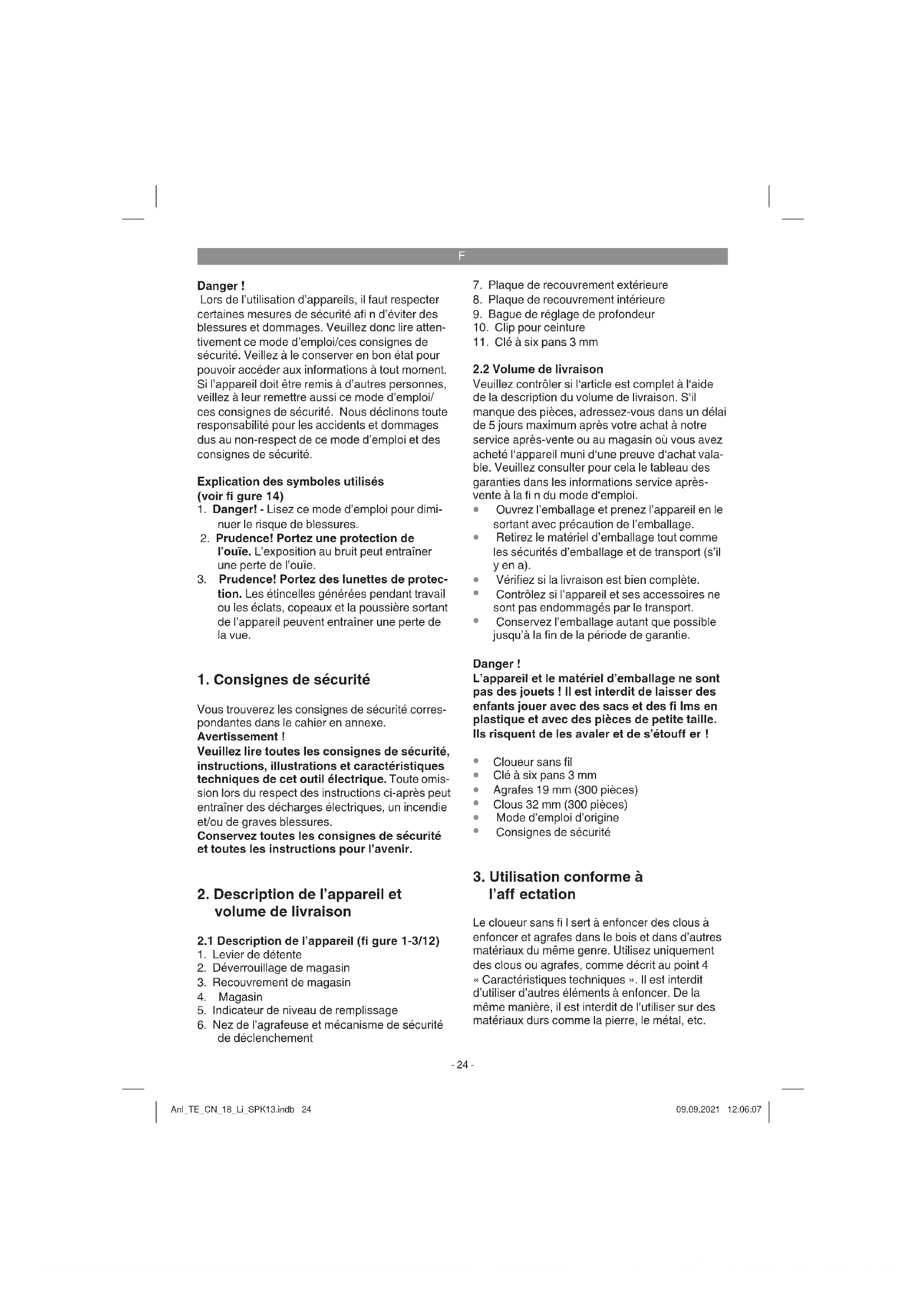 l’aff ectation Le cloueur sans fi l sert à enfoncer des clous à enfoncer et agrafes dans le bois et dans d’autres matériaux du même genre. Utilisez uniquement des clous ou agrafes, comme décrit au point 4 « Caractéristiques techniques ». Il est interdit d’utiliser d’autres éléments à enfoncer. De la même manière, il est interdit de l’utiliser sur des matériaux durs comme la pierre, le métal, etc. Anl_TE_CN_18_Li_SPK13.indb 24Anl_TE_CN_18_Li_SPK13.indb 24 09.09.2021 12:06:0709.09.2021 12:06:07F