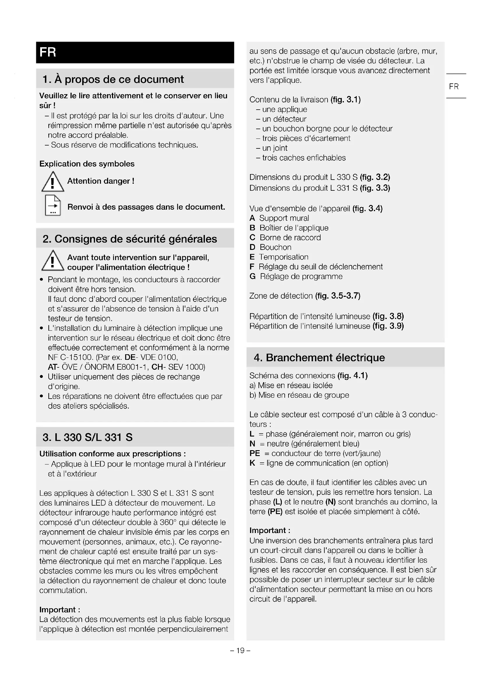 Utilisation conforme aux prescriptions: – Applique à LED pour le montage mural à l'intérieur et à l'extérieur Les appliques à détection L330 S et L331 S sont des luminaires LED à détecteur de mouvement. Le détecteur infrarouge haute performance intégré est composé d'un détecteur double à 360° qui détecte le rayonnement de chaleur invisible émis par les corps en mouvement (personnes, animaux, etc.). Ce rayonne- ment de chaleur capté est ensuite traité par un sys- tème électronique qui met en marche l'applique. Les obstacles comme les murs ou les vitres empêchent la détection du rayonnement de chaleur et donc toute commutation. Important: La détection des mouvements est la plus fiable lorsque l'applique à détection est montée perpendiculairement au sens de passage et qu'aucun obstacle (arbre, mur, etc.) n'obstrue le champ de visée du détecteur. La portée est limitée lorsque vous avancez directement vers l'applique. Contenu de la livraison (fig.3.1) – une applique – un détecteur – un bouchon borgne pour le détecteur – trois pièces d'écartement – un joint – trois caches enfichables Dimensions du produit L330 S (fig.3.2) Dimensions du produit L331 S (fig.3.3) Vue d'ensemble de l'appareil (fig.3.4) A Support mural B Boîtier de l'applique C Borne de raccord D Bouchon E Temporisation F Réglage du seuil de déclenchement G Réglage de programme Zone de détection (fig.3.5-3.7) Répartition de l’intensité lumineuse (fig.3.8) Répartition de l’intensité lumineuse (fig.3.9)