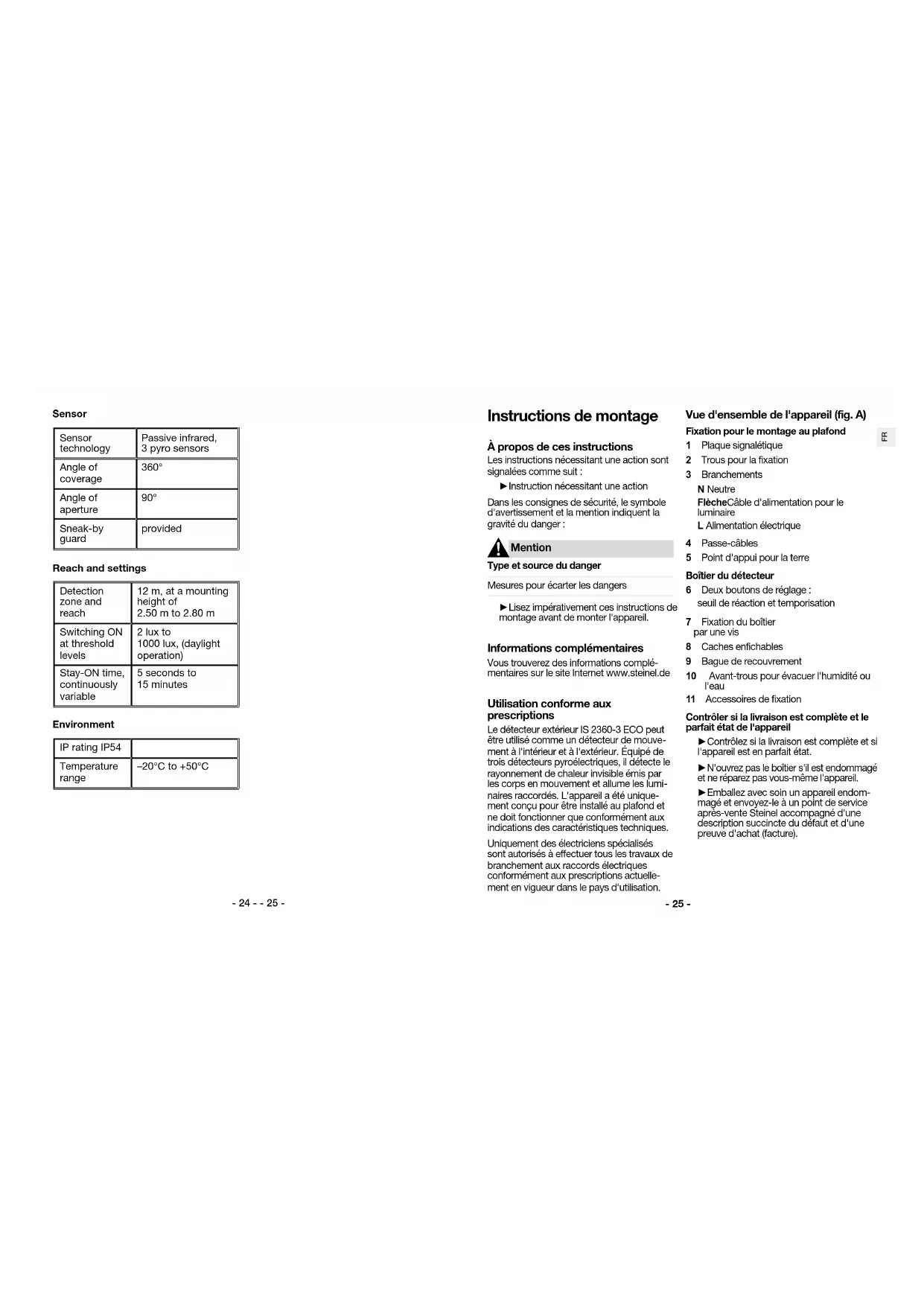 ment en vigueur dans le pays d'utilisation. Vue d'ensemble de l'appareil (fig. A) Fixation pour le montage au plafond 1 Plaque signalétique 2 Trous pour la fixation 3 Branchements N Neutre Flèche Câble d'alimentation pour le luminaire LAlimentation électrique 4 Passe-câbles 5 Point d'appui pour la terre Boîtier du détecteur 6 Deux boutons de réglage : seuil de réaction et temporisation 7 Fixation du boîtier par une vis 8 Caches enfichables 9 Bague de recouvrement 10 Avant-trous pour évacuer l'humidité ou l'eau 11 Accessoires de fixation Contrôler si la livraison est complète et le parfait état de l'appareil ►Contrôlez si la livraison est complète et si l'appareil est en parfait état. ►N'ouvrez pas le boîtier s'il est endommagé et ne réparez pas vous-même l'appareil. ►Emballez avec soin un appareil endom- magé et envoyez-le à un point de service après-vente Steinel accompagné d'une description succincte du défaut et d'une preuve d'achat (facture).- 26 - - 27 -