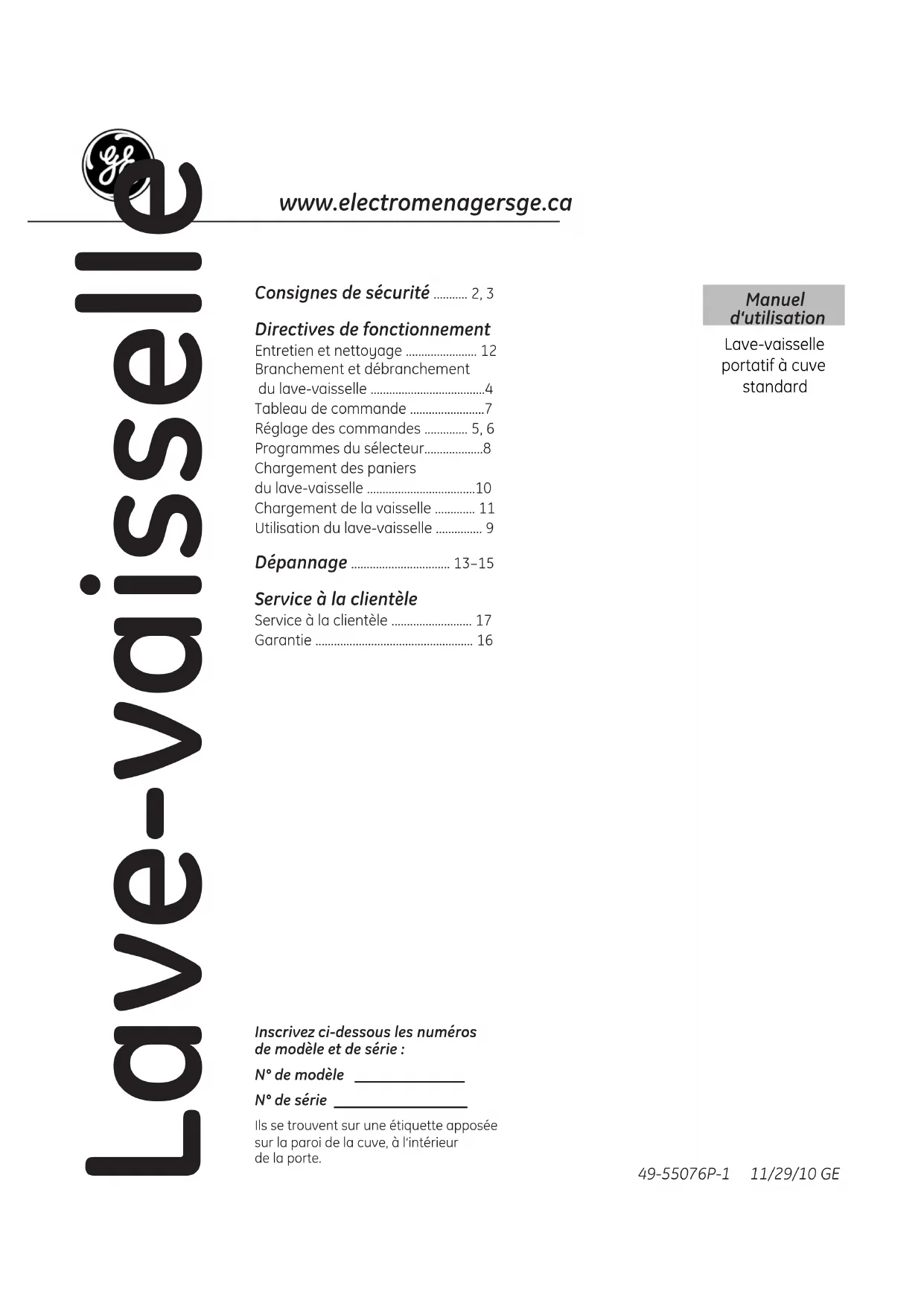 - Notes. Printed in the United States Printed on Recycled Paperwww.electromenagersge.ca Manuel d‘utilisation Lave-vaisselle 49-55076P-1 11/29/10 GE Consignes de sécurité p. 2