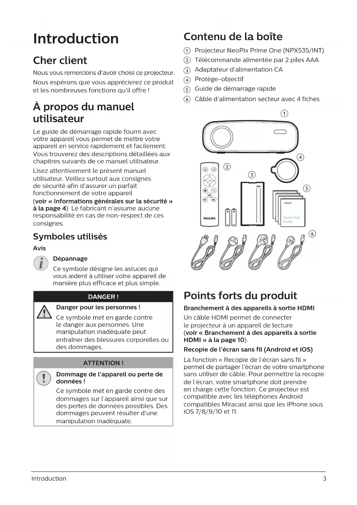 - Manuel utilisateur Enregistrez votre produit et obtenez de l’aide sur www.philips.com/support Home projector NeoPix Prime OneIntroduction 3 Cher client p. 3