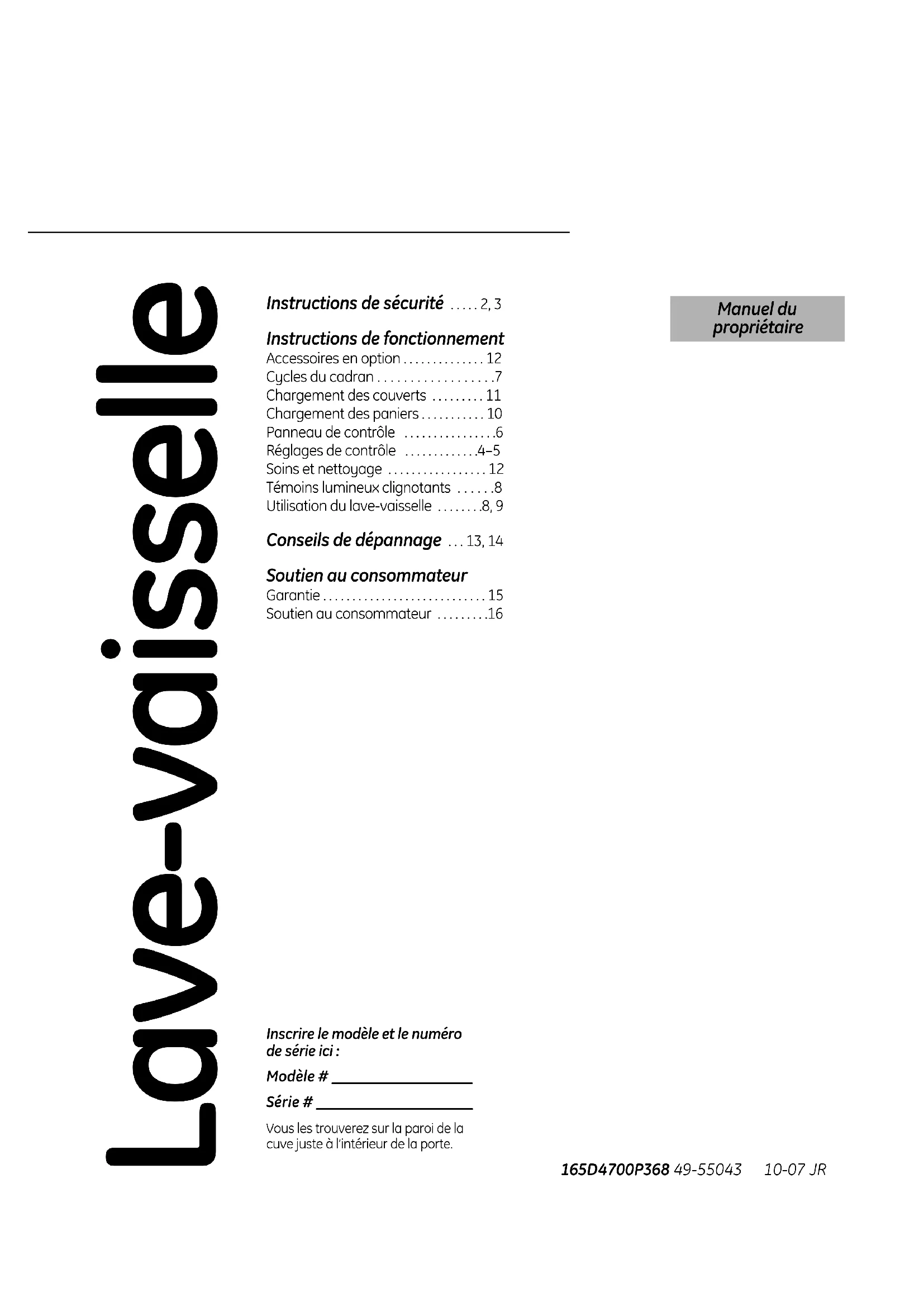 Eau extrêmement dure Faible température d’eau d’entrée. Lave-vaisselle surchargé Mauvais chargement Détergent en poudre humide ou vieux Distributeur d’agent de rinçage vide Trop peu de détergent15 Soutien au consommateurConseils de dépannage Instructions de fonctionnement Instructions de sécurité Ce qui n’est pas couvert : Pour une période de : Nous remplacerons : Un an Toute pièce du lave-vaisselle qui se casse à cause d’un vice de matériau ou de main-d’oeuvre. à partir de la date Au cours de cette année de garantie limitée, nous fournirons, gratuitement, toute la main- d’achat initial d’oeuvre et le service à la maison nécessaires pour remplacer la pièce défectueuse. ■ Tout déplacement de service chez vous pour vous apprendre à utiliser votre lave-vaisselle. ■ Toute mauvaise installation. Si vous avez un problème d’installation, appelez votre revendeur ou un installateur. Vous êtes responsable de fournir une bonne alimentation électrique, un bon échappement et tout autre branchement nécessaire. ■ Toute panne du produit s’il a été malmené, mal usé ou utilisé à une autre fin que celle prévue ou utilisé commercialement. ■ Tout remplacement des fusibles de la maison ou tout rebranchement des disjoncteurs. ■ Tout dommage occasionné par un accident, un incendie, une inondation ou un acte de Dieu. ■ Tout dommage subi après la livraison. Agrafez le reçu d’achat ici. Pour obtenir le service sous garantie, vous devrez fournir la preuve de l’achat original. Garantie sur les lave-vaisselle. Toutes les réparations sous garantie seront effectuées par nos centres de réparation ou nos réparateurs autorisés. Appelez le 1.800.561.3344. Veuillez fournir le numéro de série et le numéro de modèle lorsque vous appelez pour obtenir le service. LE GARANT N’EST PAS RESPONSABLE DES DOMMAGES INDIRECTS. Garant : MABE CANADA INC. EXCLUSION DE GARANTIES IMPLICITES – Votre seul et unique recours est la réparation du produit selon les dispositions de cette Garantie limitée. Toutes les garanties implicites, incluant les garanties de commercialité et d’adéquation à un usage spécifique, sont limitées à une année ou à la période la plus courte autorisée par la législation. Cette garantie est valable pour le premier propriétaire et tout autre propriétaire du produit s’il acheté pour utilisation domestique au Canada. Le service à domicile sous garantie sera fourni là où il est disponible et dans les régions que Mabe considère que l’offre de service est raisonnable.16 Imprimé aux États-Unis Imprimé sur du papier recyclé Soutien au consommateur. Sites Web appareil électroménager www.electromenagersge.ca Vous avez une question ou vous avez besoin d’aide pour votre appareil électroménager? Contactez-nous par Internet au site www.electromenagersge.ca 24 heures par jour, tous les jours de l’année. Service de réparations 1.800.561.3344 Service de réparations est tout près de vous. Pour faire réparer votre électroménager, il suffit de nous téléphoner. Studio de conception réaliste Sur demande, nous pouvons fournir une brochure sur l’aménagement d’une cuisine pour les personnes à mobilité réduite. Écrivez: Directeur, Relations avec les consommateurs, Mabe Canada Inc. Bureau 310, 1 Factory Lane Moncton, N.B. E1C 9M3 Prolongation de garantie www.electromenagersge.ca Achetez un contrat d’entretien avant que votre garantie n’expire et bénéficiez d’un rabais substantiel. Ainsi le service après-vente sera toujours là après expiration de la garantie. Visitez notre site Web ou appelez-nous au 1.800.461.3636. Pièces et accessoires Ceux qui désirent réparer eux-mêmes leurs électroménagers peuvent recevoir pièces et accessoires directement à la maison (cartes VISA, MasterCard et Discover acceptées). Les directives stipulées dans le présent manuel peuvent être effectuées par n’importe quel utilisateur. Les autres réparations doivent généralement être effectuées par un technicien qualifié. Soyez prudent, car une réparation inadéquate peut affecter le fonctionnement sécuritaire de l’appareil. Commandez en ligne, 24 heures par jour ou par téléphone au 1.800.661.1616 durant les heures normales d’ouverture. Contactez-nous Si vous n’êtes pas satisfait du service après-vente dont vous avez bénéficié : Premièrement, communiquez avec les gens qui ont réparé votre appareil. Ensuite, si vous n’êtes toujours pas satisfait envoyez tous les détails–numéro de téléphone compris–au : Directeur, Relations avec les consommateurs, Mabe Canada Inc. Bureau 310, 1 Factory Lane Moncton, N.B. E1C 9M3 Inscrivez votre appareil électroménager www.electromenagersge.ca Inscrivez votre appareil électroménager en direct, aussitôt que possible. Cela améliorera nos communications et notre service après-vente. Vous pouvez également nous envoyer par la poste le formulaire d’inscription joint à votre documentation.