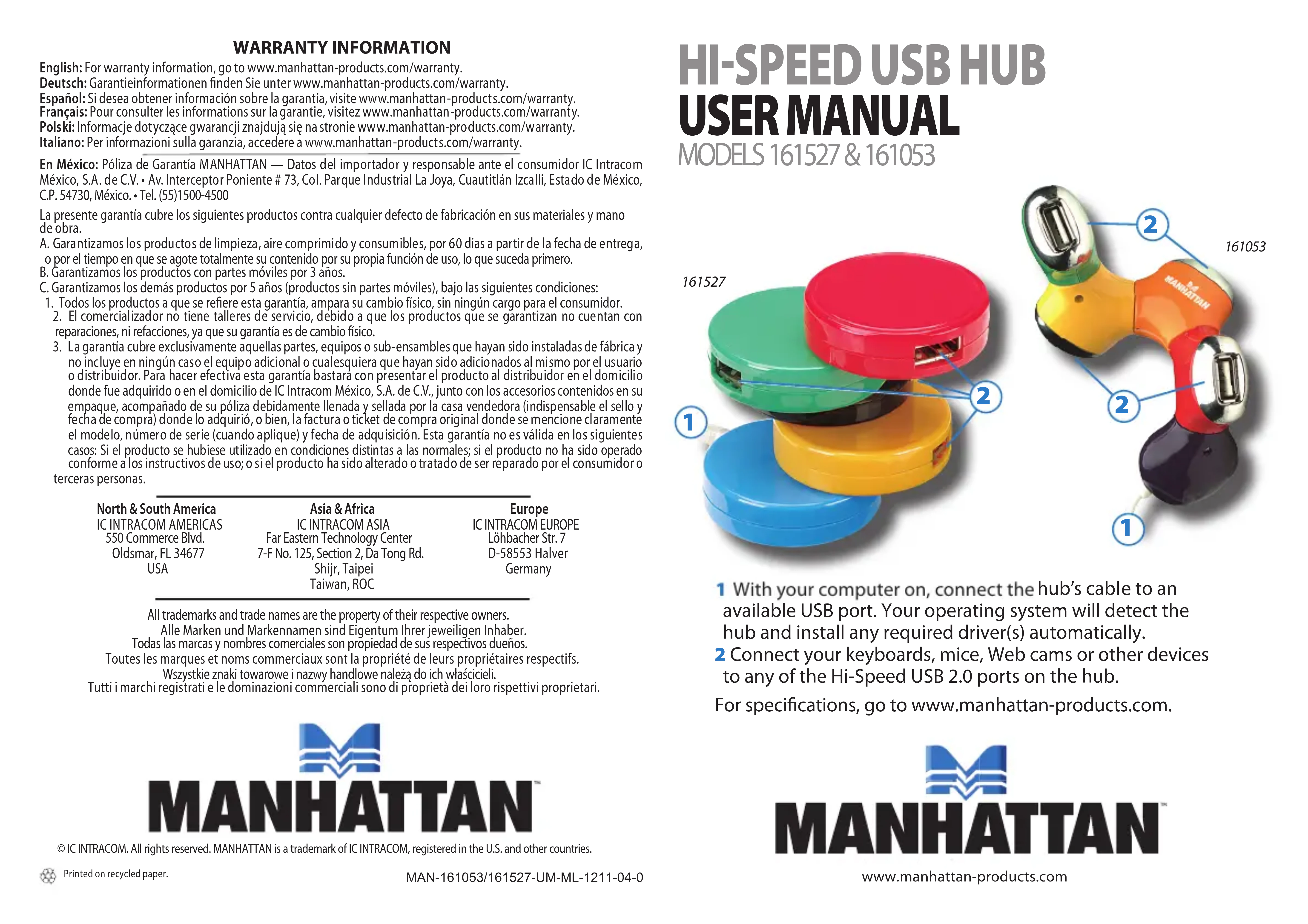 Collegate tastiere, mouse, Web cam o altre periferiche a una delle porte disponibili. Per ulteriori specifiche, visita il sito www.manhattan-products.com. Français: Hub USB haut débit 1 Connectez le Hub à un port USB de votre ordinateur. Le système d’exploitation détecte le dispositif automatiquement et installe le pilote nécessaire.
