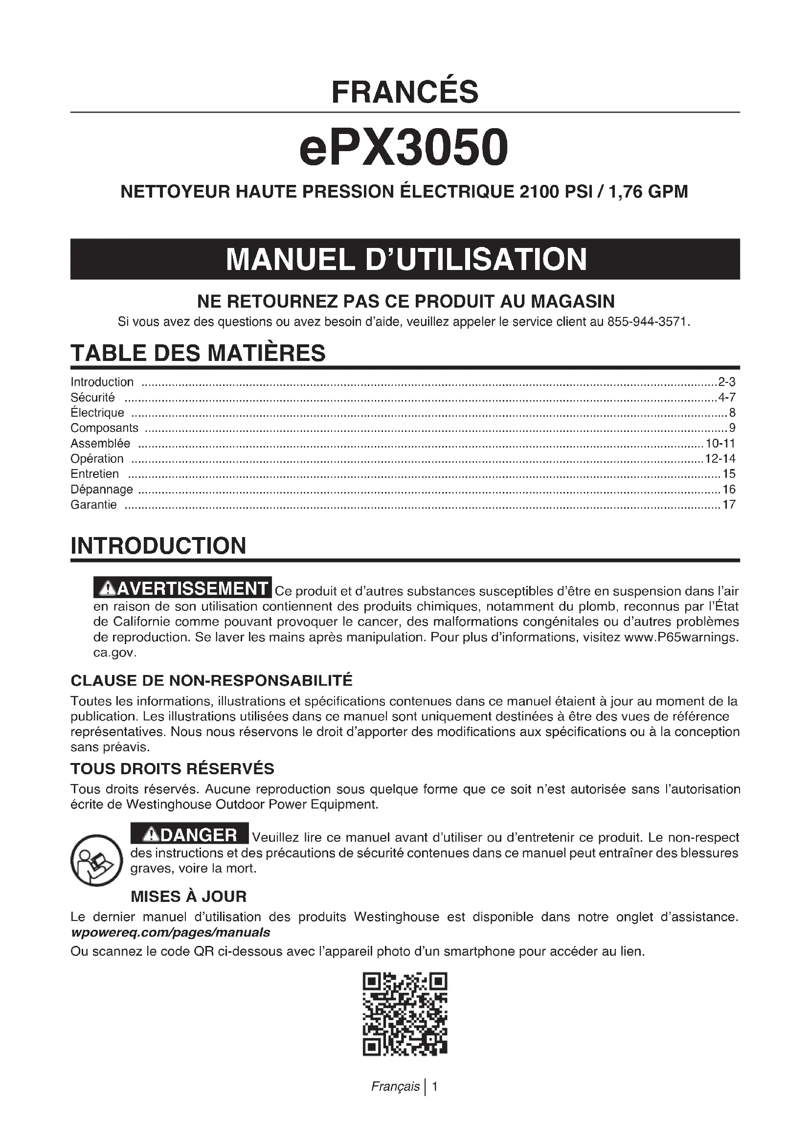 Tous droits réservés. Aucune reproduction sous quelque forme que ce soit n’est autorisée sans l’autorisation écrite de Westinghouse Outdoor Power Equipment. DANGER Veuillez lire ce manuel avant d’utiliser ou d’entretenir ce produit. Le non-respect des instructions et des précautions de sécurité contenues dans ce manuel peut entraîner des blessures graves, voire la mort. MISES À JOUR Le dernier manuel d’utilisation des produits Westinghouse est disponible dans notre onglet d’assistance. wpowereq.com/pages/manualsOu scannez le code QR ci-dessous avec l’appareil photo d’un smartphone pour accéder au lien. FRANCÉS ePX3050