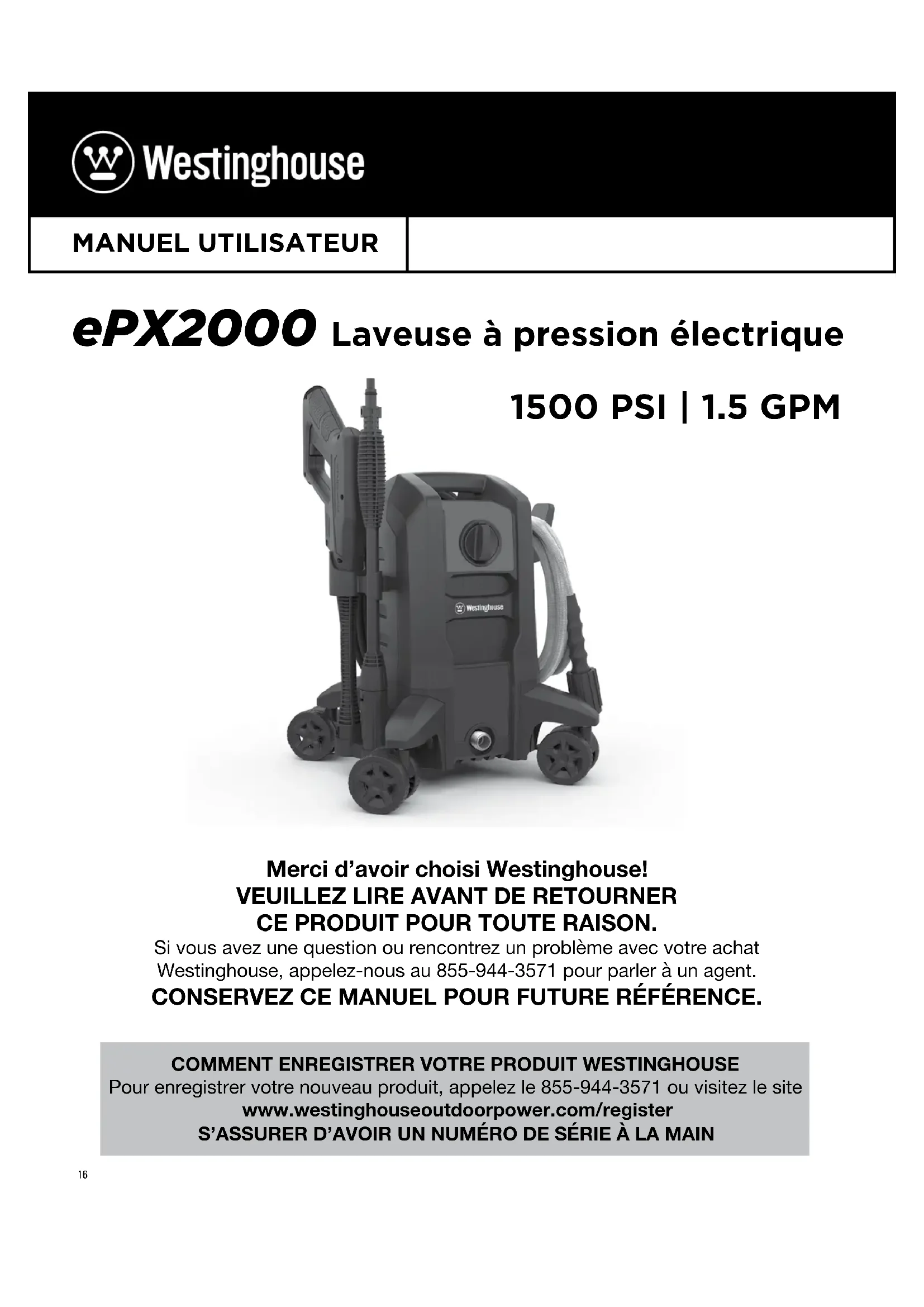 Pour garantir une couverture de garantie sans problème, il est important que vous enregistriez votre nettoyeur haute pression électrique Westinghouse en ligne à la dirección www.wpowereq.com, par téléphone automatique au 1-855-944-3571 ou en remplissant et en retournant l'enregistrement de la garantie. carte fournie avec nettoyeur haute pression. L'enregistrement de votre garantie confirme la couverture de votre garantie et fournit un lien direct entre vous et Westinghouse s'il s'avère nécessaire de vous contacter.