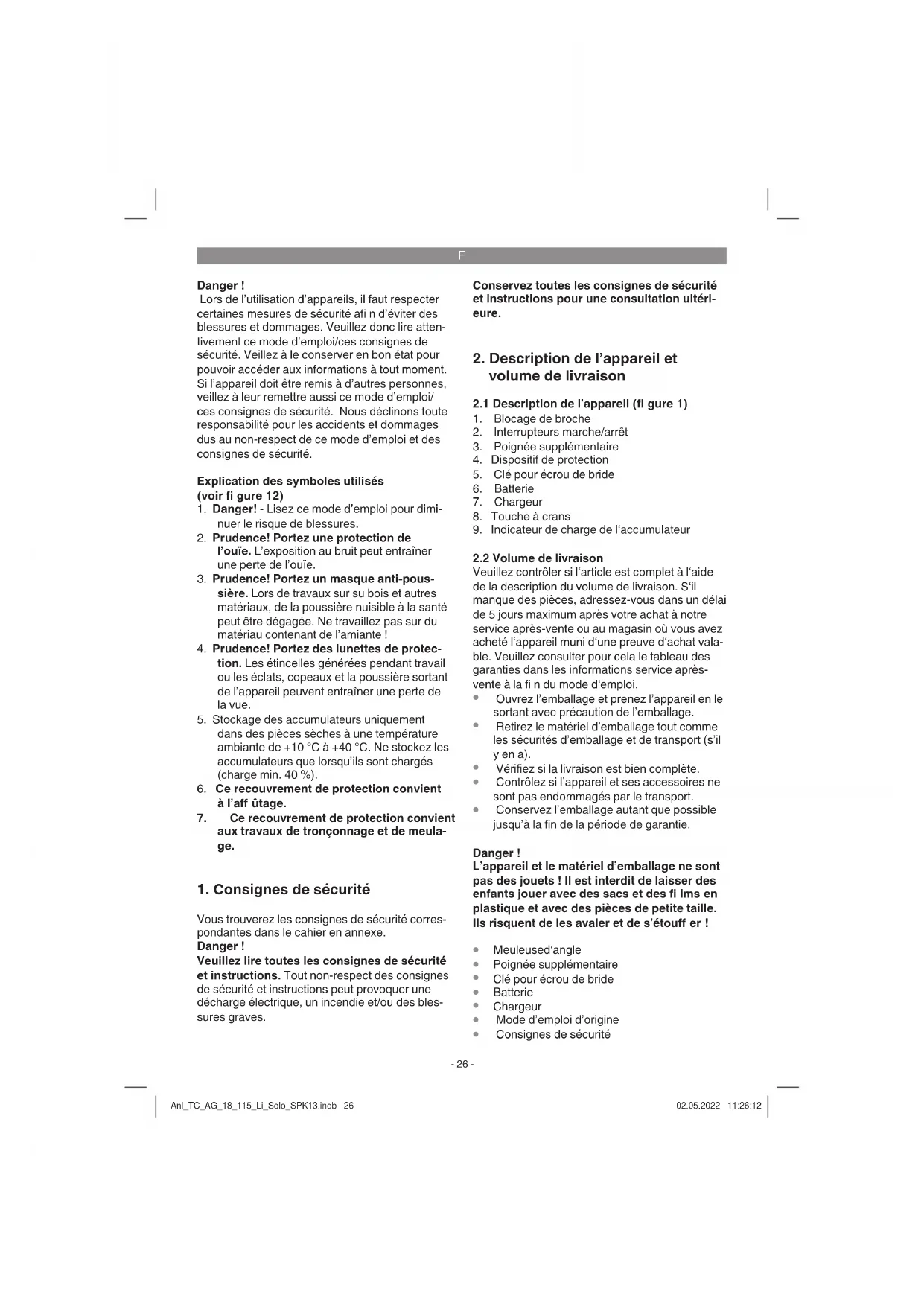 Danger ! Lors de l’utilisation d’appareils, il faut respecter certaines mesures de sécurité afi n d’éviter des blessures et dommages. Veuillez donc lire atten- tivement ce mode d’emploi/ces consignes de sécurité. Veillez à le conserver en bon état pour pouvoir accéder aux informations à tout moment. Si l’appareil doit être remis à d’autres personnes, veillez à leur remettre aussi ce mode d’emploi/ ces consignes de sécurité. Nous déclinons toute responsabilité pour les accidents et dommages dus au non-respect de ce mode d’emploi et des consignes de sécurité. Explication des symboles utilisés (voir fi gure 12)