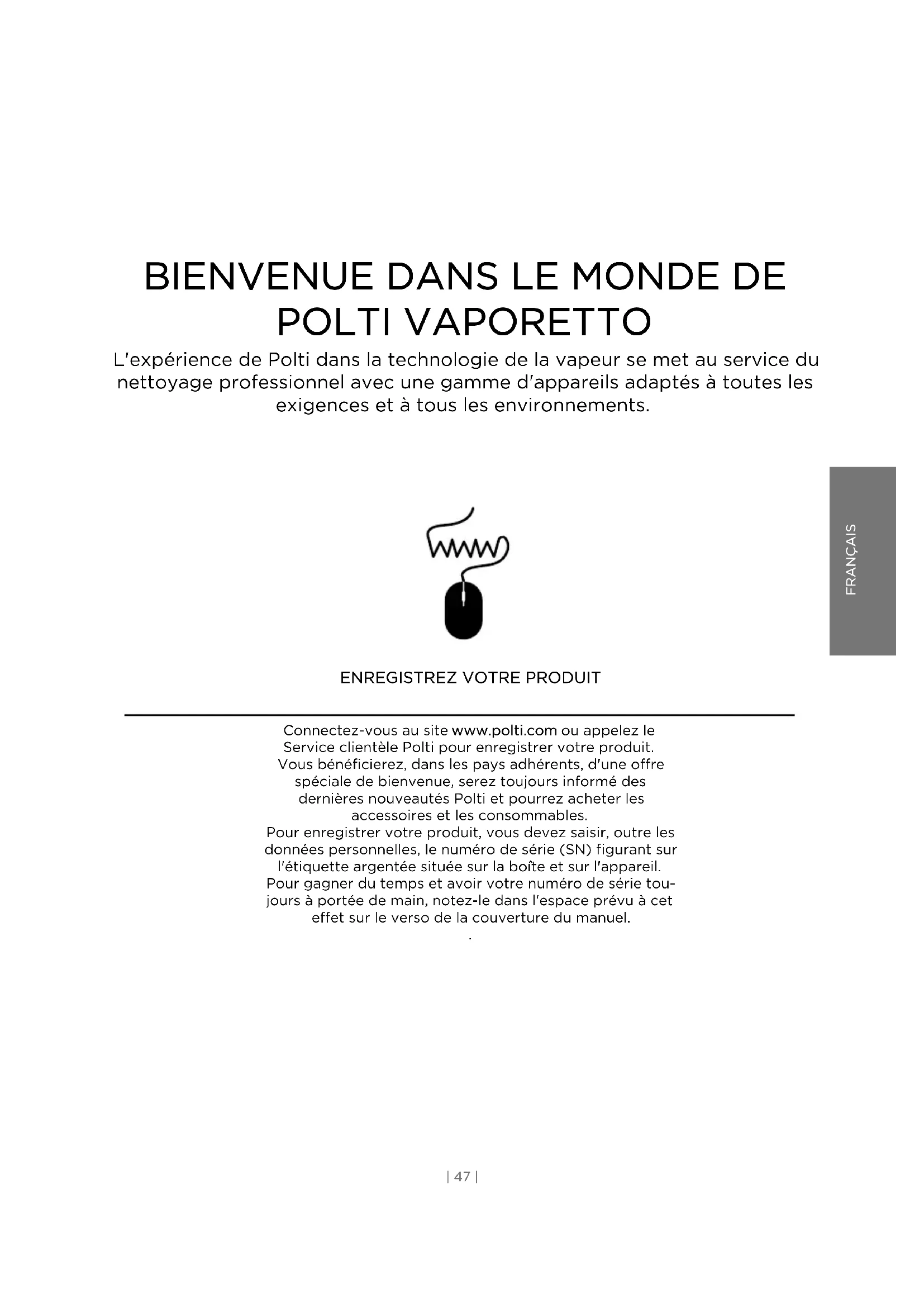 Connectez-vous au site www.polti.com ou appelez le Service clientèle Polti pour enregistrer votre produit. Vous bénéficierez, dans les pays adhérents, d'une offre spéciale de bienvenue, serez toujours informé des dernières nouveautés Polti et pourrez acheter les accessoires et les consommables. Pour enregistrer votre produit, vous devez saisir, outre les données personnelles, le numéro de série (SN) figurant sur l'étiquette argentée située sur la boîte et sur l'appareil. Pour gagner du temps et avoir votre numéro de série tou- jours à portée de main, notez-le dans l'espace prévu à cet effet sur le verso de la couverture du manuel. .LÉGENDE