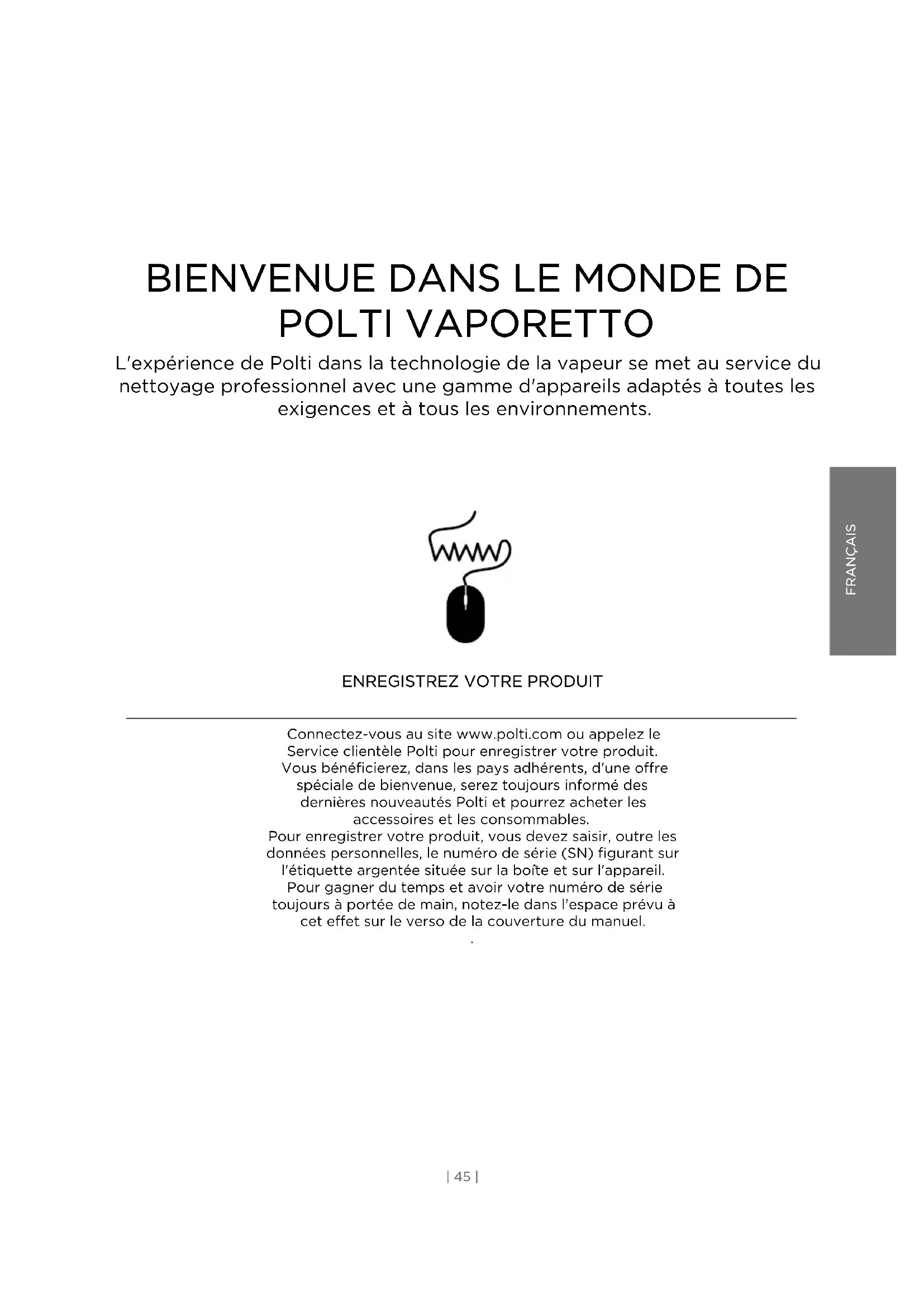 Connectez-vous au site www.polti.com ou appelez le Service clientèle Polti pour enregistrer votre produit. Vous bénéficierez, dans les pays adhérents, d'une offre spéciale de bienvenue, serez toujours informé des dernières nouveautés Polti et pourrez acheter les accessoires et les consommables. Pour enregistrer votre produit, vous devez saisir, outre les données personnelles, le numéro de série (SN) figurant sur l'étiquette argentée située sur la boîte et sur l'appareil. Pour gagner du temps et avoir votre numéro de série toujours à portée de main, notez-le dans l'espace prévu à cet effet sur le verso de la couverture du manuel. .LÉGENDE
