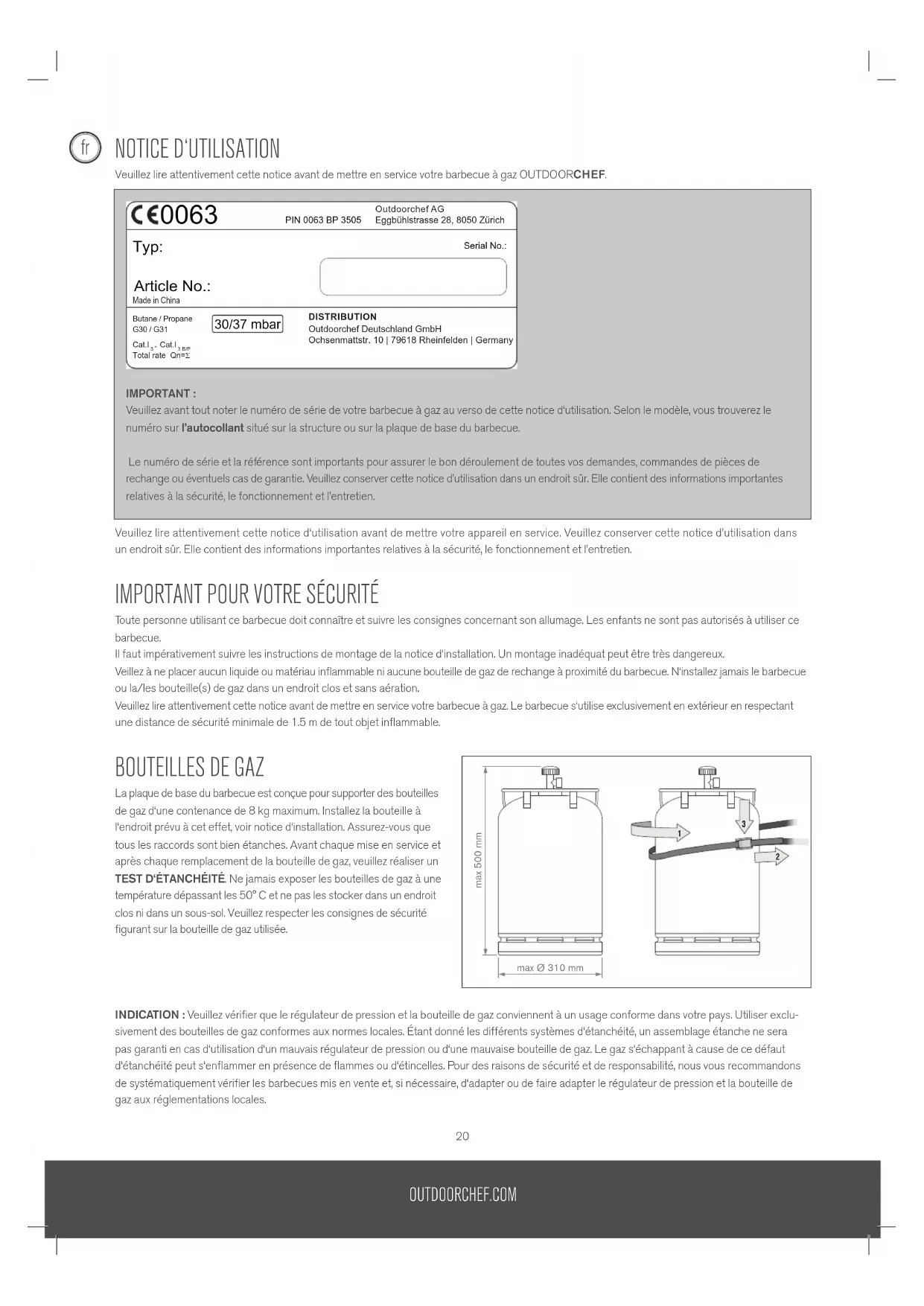 IMPORTANT : Veuillez avant tout noter le numéro de série de votre barbecue à gaz au verso de cette notice d‘utilisation. Selon le modèle, vous trouverez le numéro sur l’autocollant situé sur la structure ou sur la plaque de base du barbecue. Le numéro de série et la référence sont importants pour assurer le bon déroulement de toutes vos demandes, commandes de pièces de rechange ou éventuels cas de garantie. Veuillez conserver cette notice d’utilisation dans un endroit sûr. Elle contient des informations importantes relatives à la sécurité, le fonctionnement et l’entretien. Total rate Qn=Σ Typ: PIN 0063 BP 3505Outdoorchef AGEggbühlstrasse 28, 8050 Zürich