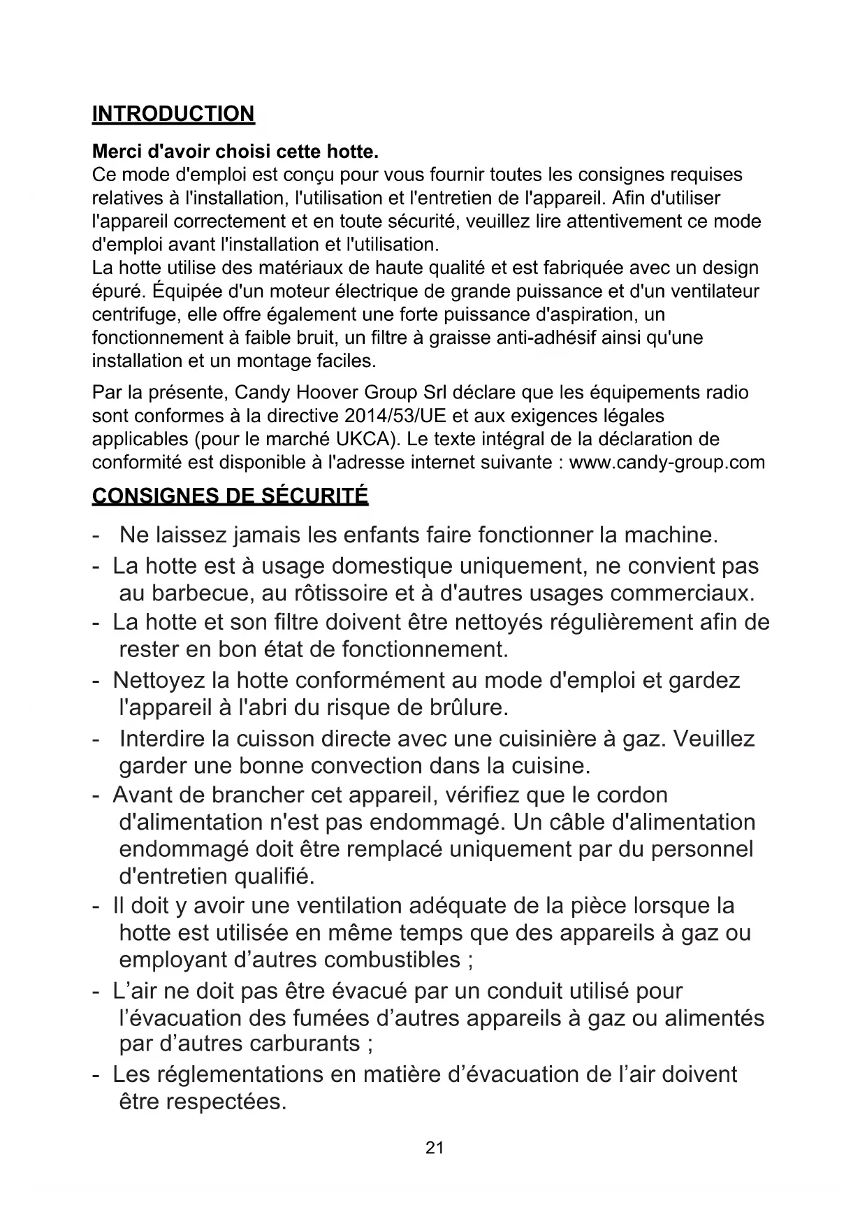 INTRODUCTION Merci d'avoir choisi cette hotte. Ce mode d'emploi est conçu pour vous fournir toutes les consignes requises relatives à l'installation, l'utilisation et l'entretien de l'appareil. Afin d'utiliser l'appareil correctement et en toute sécurité, veuillez lire attentivement ce mode d'emploi avant l'installation et l'utilisation. La hotte utilise des matériaux de haute qualité et est fabriquée avec un design épuré. Équipée d'un moteur électrique de grande puissance et d'un ventilateur centrifuge, elle offre également une forte puissance d'aspiration, un fonctionnement à faible bruit, un filtre à graisse anti-adhésif ainsi qu'une installation et un montage faciles. Par la présente, Candy Hoover Group Srl déclare que les équipements radio sont conformes à la directive 2014/53/UE et aux exigences légales applicables (pour le marché UKCA). Le texte intégral de la déclaration de conformité est disponible à l'adresse internet suivante : www.candy-group.com