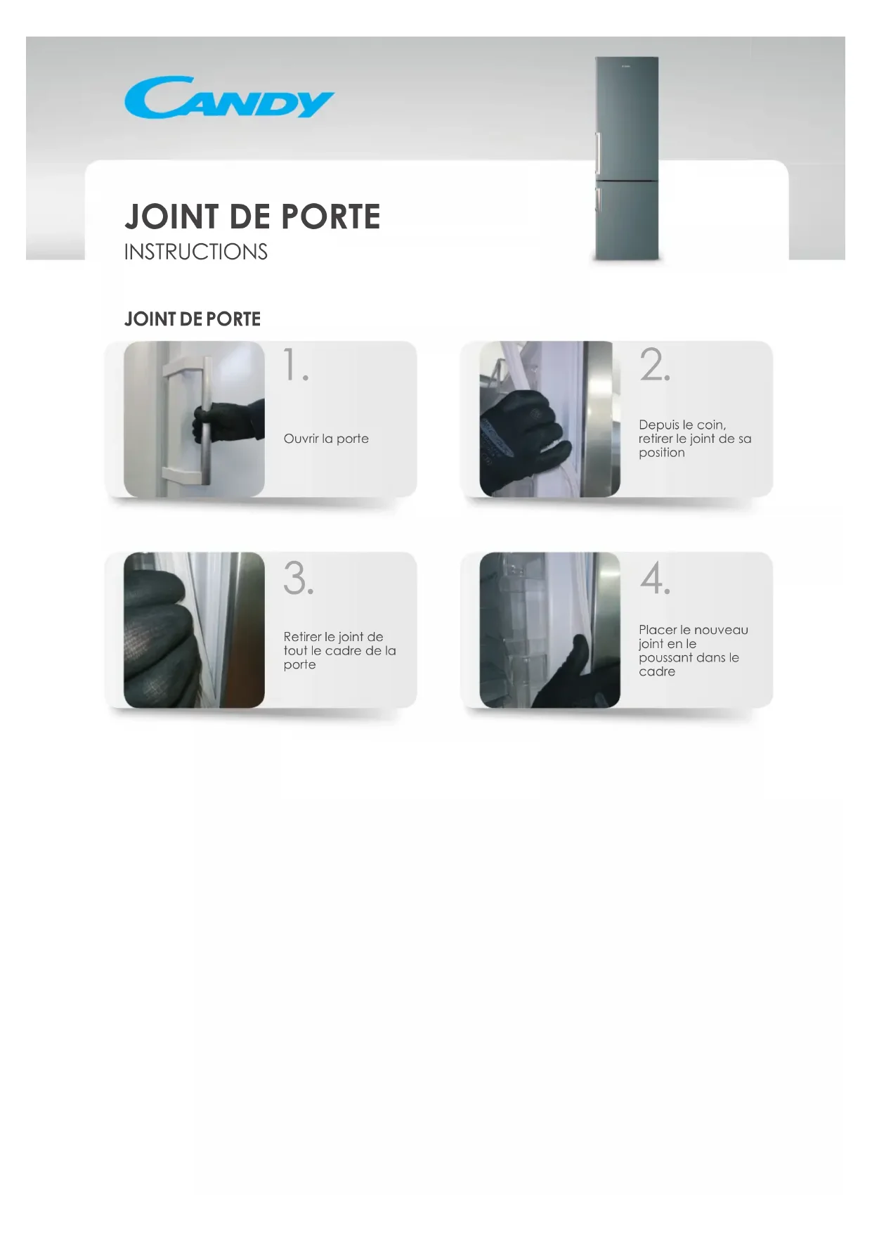 Placer le nouveau joint en le poussant dans le cadre 4.Retirer la charnière supérieureRetirer la porte du réfrigérateur en la tirant vers le haut Retirer la charnière du milieu Retirer la charnière inférieureRetirer les agrafes protectrices du côté opposé Fixer la charnière inférieure sur le côté opposé Mettre la porte du congélateur en position