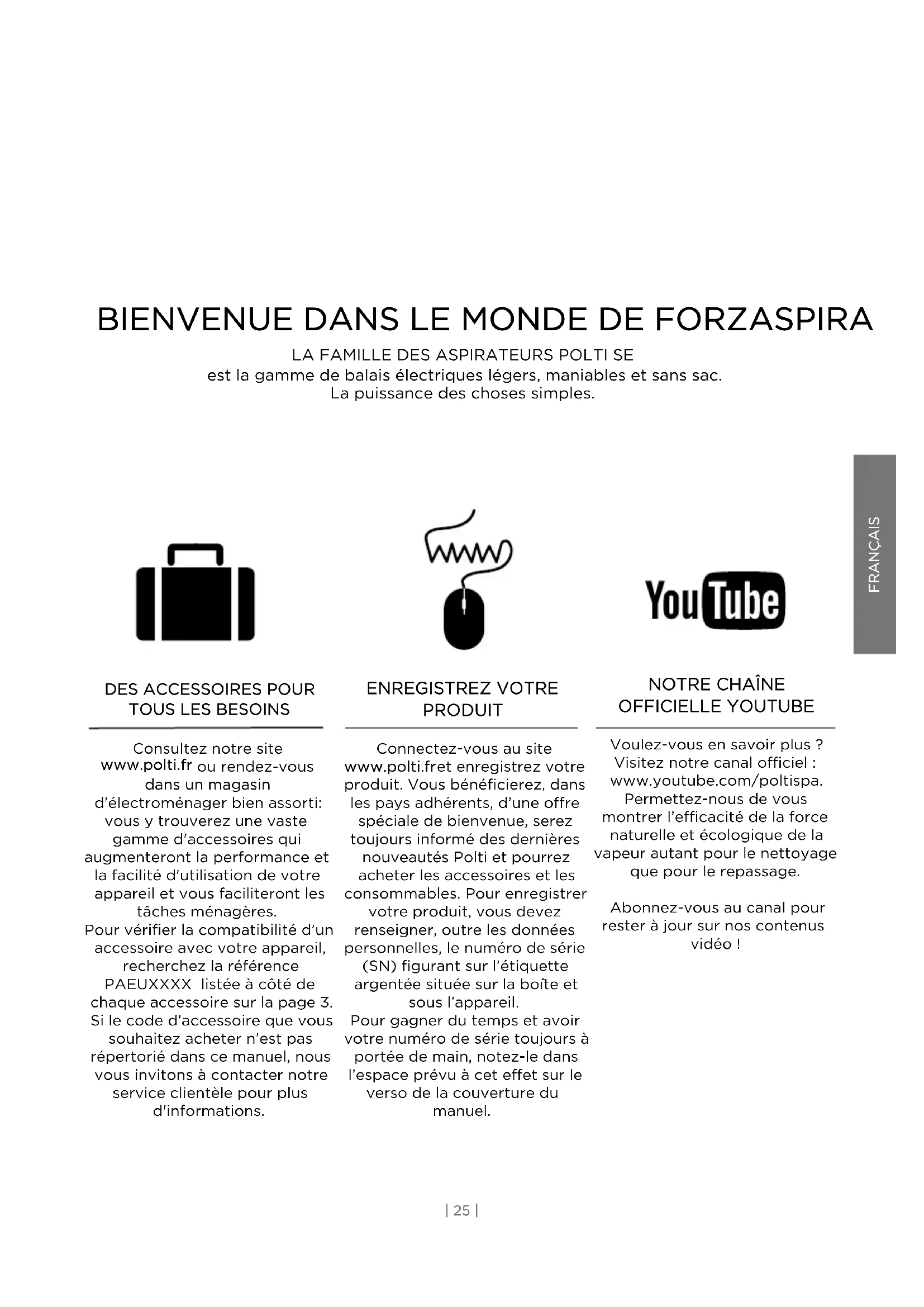 OFFICIELLE YOUTUBE Voulez-vous en savoir plus? Visitez notre canal officiel: www.youtube.com/poltispa. Permettez-nous de vous montrer l’efficacité de la force naturelle et écologique de la vapeur autant pour le nettoyage que pour le repassage. Abonnez-vous au canal pour rester à jour sur nos contenus vidéo! ENREGISTREZ VOTRE PRODUIT Connectez-vous au site www.polti.fr et enregistrez votre produit. Vous bénéficierez, dans les pays adhérents, d’une offre spéciale de bienvenue, serez toujours informé des dernières nouveautés Polti et pourrez acheter les accessoires et les consommables. Pour enregistrer votre produit, vous devez renseigner, outre les données personnelles, le numéro de série (SN) figurant sur l’étiquette argentée située sur la boîte et sous l’appareil. Pour gagner du temps et avoir votre numéro de série toujours à portée de main, notez-le dans l’espace prévu à cet effet sur le verso de la couverture du manuel.PRÉCAUTIONS D’EMPLOI IMPORTANTES ATTENTION ! AVANT D’UTILISER L’APPAREIL, LIRE