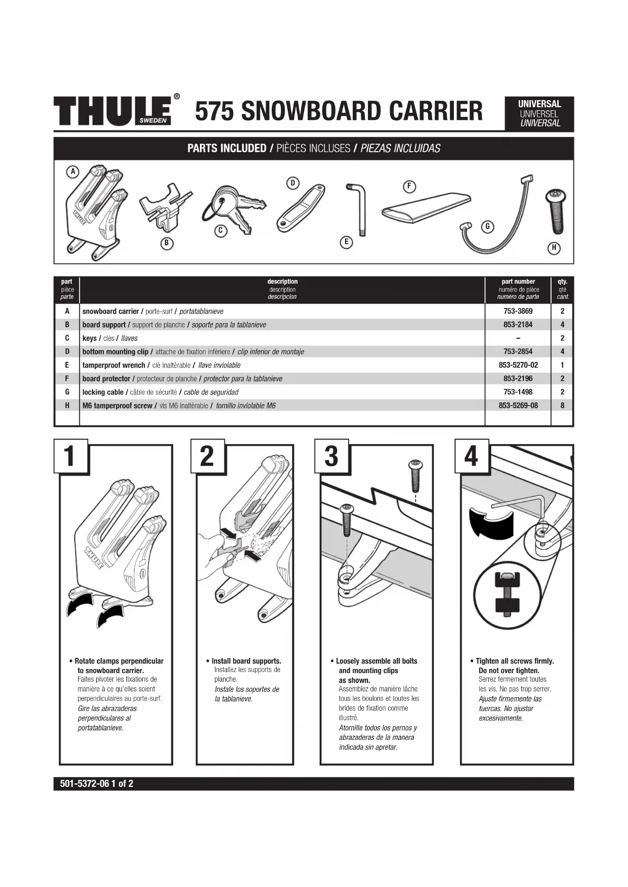 REPAIR OR REPLACEMENT OF A DEFECTIVE PRODUCT OR THE ISSUANCE OF A REFUND OR CREDIT (AS DETERMINED BY THULE) IS A PURCHASER’S EXCLUSIVE REMEDY UNDER THIS WARRANTY. DAMAGE TO A PURCHASER’S VEHICLE, CARGO AND/OR TO ANY OTHER PERSON OR PROPERTY IS EXCLUDED. THIS WARRANTY IS EXPRESSLY MADE IN LIEU OF ANY AND ALL OTHER WARRANTIES, EXPRESS OR IMPLIED, INCLUDING THE WARRANTIES OF MERCHANTABILITY AND FITNESS FOR A PARTICULAR PURPOSE. THULE’S SOLE LIABILITY TO ANY PURCHASER IS LIMITED TO THE REMEDY SET FORTH ABOVE. IN NO EVENT WILL THULE BE LIABLE FOR ANY LOST PROFITS, LOST SALES, OR FOR ANY CONSEQUENTIAL, DIRECT, INDIRECT, INCIDENTAL, SPECIAL, EXEMPLARY, OR PUNITIVE DAMAGES OR FOR ANY OTHER DAMAGES OF ANY KIND OR NATURE. SOME STATES DO NOT ALLOW THE EXCLUSION OR LIMITATION OF INCIDENTAL OR CONSEQUENTIAL DAMAGES, SO THE ABOVE LIMITATIONS MAY NOT BE APPLICABLE. THIS WARRANTY GIVES YOU SPECIFIC LEGAL RIGHTS, AND YOU MAY ALSO HAVE OTHER RIGHTS WHICH VARY FROM STATE TO STATE. THULE CAR RACK SYSTEMS LIMITED LIFETIME WARRANTY [EFFECTIVE JANUARY 1, 2006] Register online at www.thuleracks.com/register Register online at www.thuleracks.com/register THULE 42 Silvermine Road Seymour, Connecticut 06483 203 881-9600 THULE garantit tous les systèmes de support de la marque THULE pour voitures et ses accessoires fabriqués par THULE tant que le premier acheteur au détail détient le produit. Cette garantie prend fin si un acheteur transfert le produit à une personne. Selon les limites et les exclusions décrites dans cette garantie, THULE remédiera aux défauts de matériaux ou de maind’oeuvre en réparant ou en remplaçant, à sa discrétion, un produit défectueux sans frais de pièces ou de main d’oeuvre. De plus, THULE peut décider, à sa discré- tion, de ne pas réparer ou remplacer un produit défectueux mais d’émettre un remboursement de l’acheteur égal au prix payé pour le produit, ou un crédit à utiliser pour l’achat d’un système de support de charge THULE neuf. Aucune garantie n’est émise pour les défauts causés par une usure nor- male, pour la rouille esthétique, pour les rayures, pour l’utilisation iné- gale du véhicule, pour toute modification de celuici, pour tout type de réparation, pour un système de support de charge autre que ceux autorisés par THULE. Aucune garantie n’est émise pour les défauts résultant de conditions hors du contrôle de THULE, notamment une mauvaise utilisation, une surcharge ou un assemblage ou montage non conformes aux instruc- tions écrites ou directives de THULE incluses avec le produit ou mises à disposition de l’acheteur. Aucune garantie n’est émise pour les produits Thule achetés hors des États-Unis, du Canada ou du Mexique. Si un produit est défectueux, l’acheteur doit contacter le revendeur THULE auquel il a acheté le produit ou un centre de service Thule autorisé. Si le revendeur ou le centre de services Thule autorisé n’est pas en mesure de corriger le défaut, l’acheteur doit contacter THULE par écrit ou au téléphone à : THULE 42 Silvermine Road Seymour, Connecticut 06483 Attn: Customer Service 203 881-9600 Dans l’éventualité où un produit doit être renvoyé à THULE, un technicien THULE à l’adresse ou au numéro de téléphone indiqué ci-dessus fourni- ra à l’acheteur l’adresse d’envoi appropriée et des instructions supplé- mentaires. Veuillez noter que l’acheteur sera responsable des frais d’en- voi du produit à THULE et qu’une preuve d’achat sous la forme de l’orig- inal d’une facture ou d’un reçu d’achat et une description détaillée du défaut doivent être inclus dans l’envoi.