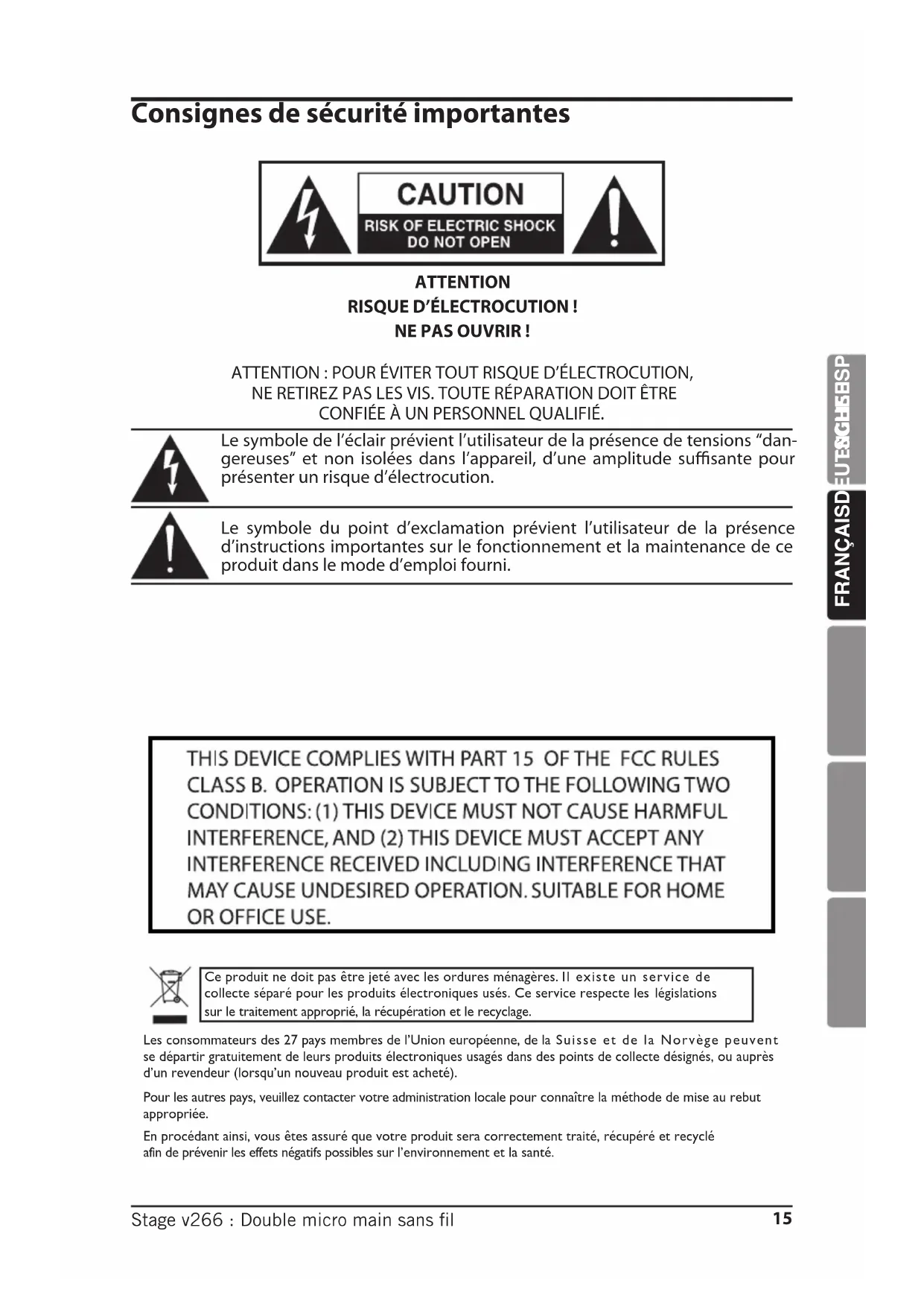 Ce produit ne doit pas être jeté avec les ordures ménagères. Il existe un service de collecte séparé pour les produits électroniques usés. Ce service respecte les législations sur le traitement approprié, la récupération et le recyclage. Les consommateurs des 27 pays membres de l’Union européenne, de la Suisse et de la Norvège peuvent se départir gratuitement de leurs produits électroniques usagés dans des points de collecte désignés, ou auprès d’un revendeur (lorsqu’un nouveau produit est acheté). Pour les autres pays, veuillez contacter votre administration locale pour connaître la méthode de mise au rebut appropriée. En procédant ainsi, vous êtes assuré que votre produit sera correctement traité, récupéré et recyclé afin de prévenir les effets négatifs possibles sur l’environnement et la santé. Consignes de sécurité importantes ATTENTION : POUR ÉVITER TOUT RISQUE D’ÉLECTROCUTION, NE RETIREZ PAS LES VIS. TOUTE RÉPARATION DOIT ÊTRE CONFIÉE À UN PERSONNEL QUALIFIÉ. Le symbole de l’éclair prévient l’utilisateur de la présence de tensions “dan- gereuses” et non isolées dans l’appareil, d’une amplitude susante pour présenter un risque d’électrocution. Le symbole du point d’exclamation prévient l’utilisateur de la présence d’instructions importantes sur le fonctionnement et la maintenance de ce produit dans le mode d’emploi fourni. ATTENTION RISQUE D’ÉLECTROCUTION !
