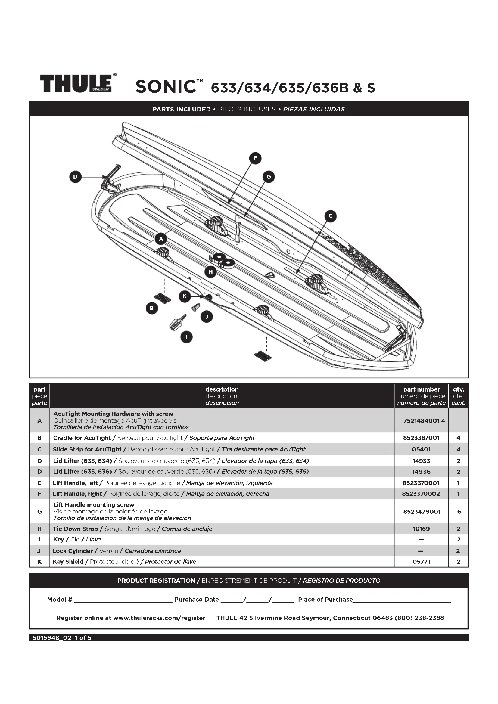 DAMAGES, SO THE ABOVE LIMITATIONS MAY NOT BE APPLICABLE. THIS WARRANTY GIVES YOU SPECIFIC LEGAL RIGHTS, AND YOU MAY ALSO HAVE OTHER RIGHTS WHICH VARY FROM STATE TO STATE. THULE garantit tous les systèmes de support de la marque THULE pour voitures et ses accessoires fabriqués par THULE tant que le premier acheteur au détail détient le produit. Cette garantie prend fin si un acheteur transfert le produit à une personne. Selon les limites et les exclusions décrites dans cette garantie, THULE remédiera aux défauts de matériaux ou de maind’oeuvre en réparant ou en remplaçant, à sa discrétion, un produit défectueux sans frais de pièces ou de main d’oeuvre. De plus, THULE peut décider, à sa discrétion, de ne pas réparer ou remplacer un produit défectueux mais d’émettre un remboursement de l’acheteur égal au prix payé pour le produit, ou un crédit à utiliser pour l’achat d’un système de support de charge THULE neuf. Aucune garantie n’est émise pour les défauts causés par une usure normale, pour la rouille esthétique, pour les rayures, pour l’utilisation inégale du véhicule, pour toute modification de celuici, pour tout type de réparation, pour un système de support de charge autre que ceux autorisés par THULE. Aucune garantie n’est émise pour les défauts résultant de conditions hors du contrôle de THULE, notamment une mauvaise utilisation, une surcharge ou un assemblage ou montage non conformes aux instructions écrites ou directives de THULE incluses avec le produit ou mises à disposition de l’acheteur. Aucune garantie n’est émise pour les produits THULE achetés hors des États-Unis, du Canada ou du Mexique. Dans le cas où un produit serait défectueux, l’acheteur doit contacter soit le revendeur THULE chez lequel le produit a été acheté, soit le centre de service après-vente Thule. Si le revendeur ou le centre de service après-vente Thule n’est pas en mesure de corriger le défaut, l’acheteur doit contacter Thule par écrit ou par téléphone (voir les coordonnées en bas de cette page). Dans l’éventualité où un produit doit être renvoyé à THULE, un technicien THULE à l’adresse ou au numéro de téléphone indiqué ci-dessous fournira à l’acheteur l’adresse d’envoi appropriée et des instructions supplémentaires. Veuillez noter que l’acheteur sera responsable des frais d’envoi du produit à THULE et qu’une preuve d’achat sous la forme de l’original d’une facture ou d’un reçu d’achat et une description détaillée du défaut doivent être inclus dans l’envoi.