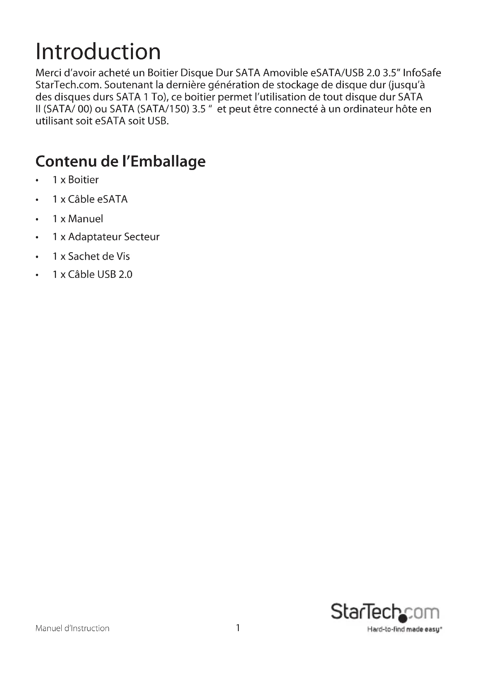 Introduction Merci d’avoir acheté un Boitier Disque Dur SATA Amovible eSATA/USB 2.0 3.5” InfoSafe StarTech.com. Soutenant la dernière génération de stockage de disque dur (jusqu’à des disques durs SATA 1 To), ce boitier permet l’utilisation de tout disque dur SATA II (SATA/ 00) ou SATA (SATA/150) 3.5 “ et peut être connecté à un ordinateur hôte en utilisant soit eSATA soit USB. Contenu de l’Emballage