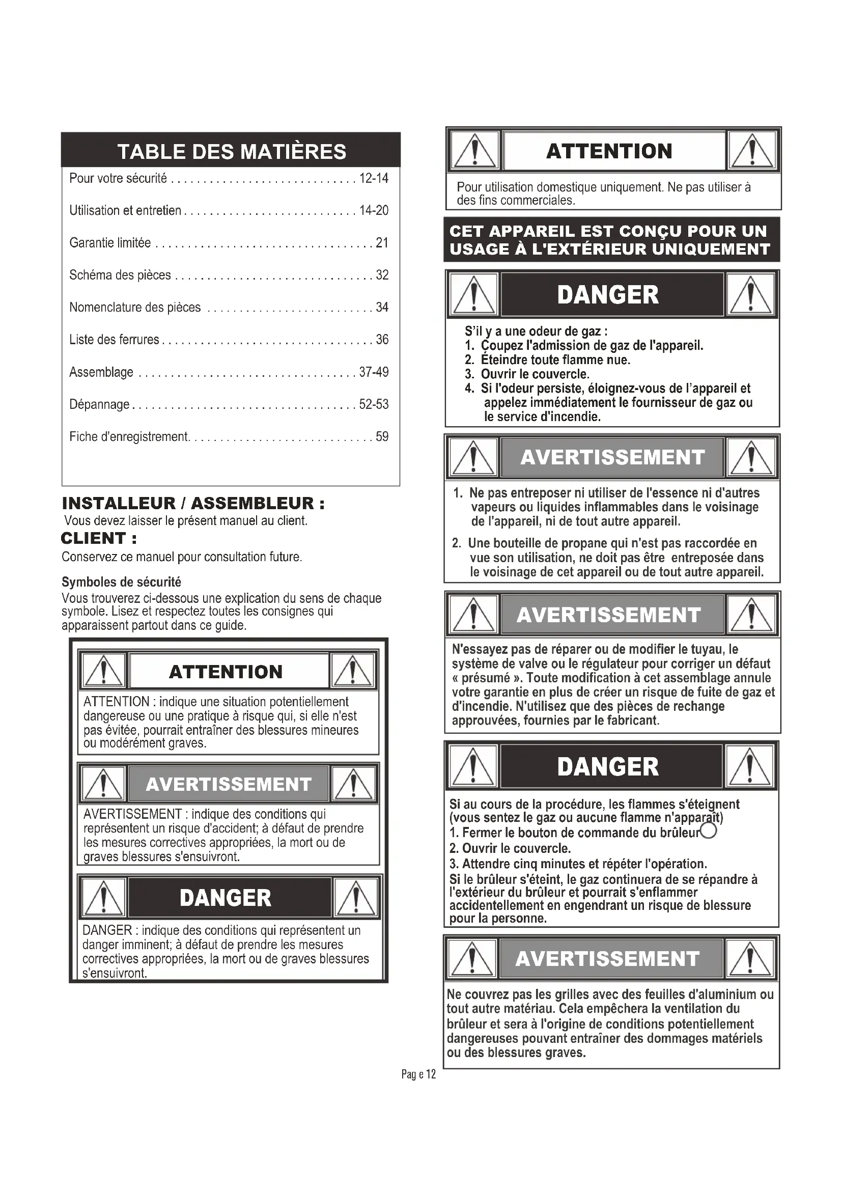 - -53 Fiche d'enregistrement AVERTISSEMENT 1. Ne pas entreposer ni utiliser de l'essence ni d'autres vapeurs ou liquides inflammables dans le voisinage de l'appareil, ni de tout autre appareil. 2. Une bouteille de propane qui n'est pas raccordée en vue son utilisation, ne doit pas être entreposée dans le voisinage de cet appareil ou de tout autre appareil. DANGER S’il y a une odeur de gaz : 1. Coupez l'admission de gaz de l'appareil.2. Éteindre toute flamme nue.3. Ouvrir le couvercle.4. Si l'odeur persiste, éloignez-vous de l’appareil et appelez immédiatement le fournisseur de gaz ou le service d'incendie.N'essayez pas de réparer ou de modifier le tuyau, le système de valve ou le régulateur pour corriger un défaut « présumé ». Toute modification à cet assemblage annule votre garantie en plus de créer un risque de fuite de gaz et d'incendie. N'utilisez que des pièces de rechange approuvées, fournies par le fabricant. AVERTISSEMENT CET APPAREIL EST CONÇU POUR UN USAGE À L'EXTÉRIEUR UNIQUEMENT DANGER Si au cours de la procédure, les flammes s'éteignent (vous sentez le gaz ou aucune flamme n'apparaît)1. Fermer le bouton de commande du brûleur 2. Ouvrir le couvercle.3. Attendre cinq minutes et répéter l'opération. Si le brûleur s'éteint, le gaz continuera de se répandre à l'extérieur du brûleur et pourrait s'enflammer accidentellement en engendrant un risque de blessure pour la personne. ATTENTION Pour utilisation domestique uniquement. Ne pas utiliser à des fins commerciales. AVERTISSEMENT Ne couvrez pas les grilles avec des feuilles d'aluminium outout autre matériau. Cela empêchera la ventilation du brûleur et sera à l'origine de conditions potentiellement dangereuses pouvant entraîner des dommages matériels ou des blessures graves.Pag e 13 Lire et respecter toutes les consignes de sécurité, les instructions d'assemblage et les directives d'emploi et d'entretien avant d'essayer d'assembler cet appareil ou de l'utiliser pour la cuisson. Ne pas suivre toutes les instructions du fabricant pourrait causer des préjudices physiques graves et des dommages matériels. Certaines pièces peuvent être munies de bords coupantsl. Portez des gants de protection au besoin. AVERTISSEMENT ATTENTION ATTENTION ATTENTION Incendies de Graisse ATTENTION Utiliser des pots de plus de 6 quarts de la capacité pourrait dépasser le poids limite du plateau brûleur latéral ou Côté plateauce qui entraîne la défaillance du gril panier composants. AVERTISSEMENT CALIFORNIA PROPOSITION 65 p. 59