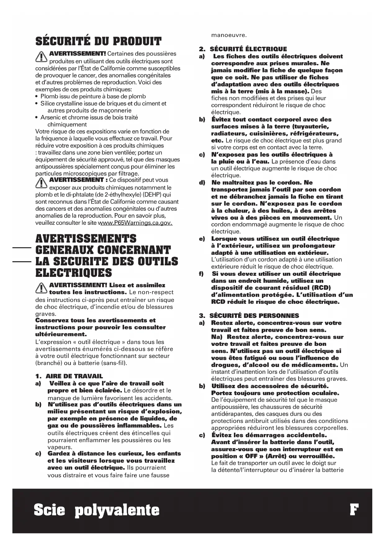 a) Restez alerte, concentrez-vous sur votre travail et faites preuve de bon sens. Na) Restez alerte, concentrez-vous sur votre travail et faites preuve de bon sens. N’utilisez pas un outil électrique si vous êtes fatigué ou sous l’influence de drogues, d’alcool ou de médicaments. Un instant d’inattention lors de l’utilisation d’outils électriques peut entraîner des blessures graves. b) Utilisez des accessoires de sécurité. Portez toujours une protection oculaire. De l’équipement de sécurité tel que le masque antipoussière, les chaussures de sécurité antidérapantes, des casques durs ou des protections antibruit utilisés dans des conditions appropriées réduiront les blessures corporelles. c) Évitez les démarrages accidentels. Avant d’insérer la batterie dans l’outil, assurez-vous que son interrupteur est en position « OFF » (Arrêt) ou verrouillée. Le fait de transporter un outil avec le doigt sur la détente/l’interrupteur ou d’insérer la batterie1514 Scie polyvalente F dans un outil dont la détente est en position « ON » (Marche) peut causer un accident. d) Retirer les clés de réglage avant de mettre l’outil sous tension. Une clé restée attachée à une partie mobile de l’outil pourrait entraîner des blessures corporelles. e) Ne vous penchez pas trop en avant. Maintenez un bon appui et restez en équilibre en tout temps. Une bonne stabilité vous permet de mieux réagir à une situation inattendue. f) Habillez-vous convenablement. Ne portez ni vêtements flottants ni bijoux. Gardez les cheveux, les vêtements et les gants éloignés des pièces en mouvement. Les vêtements flottants, les bijoux ou les cheveux longs risquent d’être happés par des pièces en mouvement. g) Si un sac de récupération de la poussière est fourni avec un connecteur pour aspirateur, assurez vous qu’il est correctement relié et utilisé de façon appropriée. L’utilisation de ce système réduit les dangers physiques et physiologiques liés à la poussière. h) Ne laissez pas les habitudes acquises par une utilisation fréquente d’outils relâcher notre vigilance et ignorer les principes de sécurité des outils. Une utilisation négligente peut causer des blessures graves en une fraction de seconde.