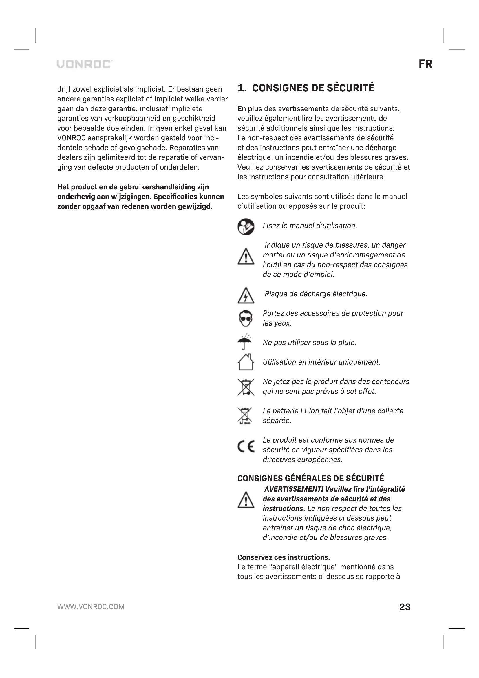 - Des pièces détachées non d’origine ont été utilisées Ceci constitue l’unique garantie accordée par la so- ciété explicitement ou implicitement. Il n’existe au- cune autre garantie, explicite ou implicite, qui peut s’étendre au delà du contenu ici présent, y compris les garanties marchandes ou d’adaptation à des fins particulières. En aucun cas VONROC ne sera tenu responsable de dommages accidentels ou consécu- tifs. Les solutions proposées par les revendeurs de- vront se limiter à la réparation ou le remplacement des éléments ou pièces non conformes. Le produit et le manuel d’utilisation sont sujets à modifications. Les spécifications peuvent changer sans préavis.30