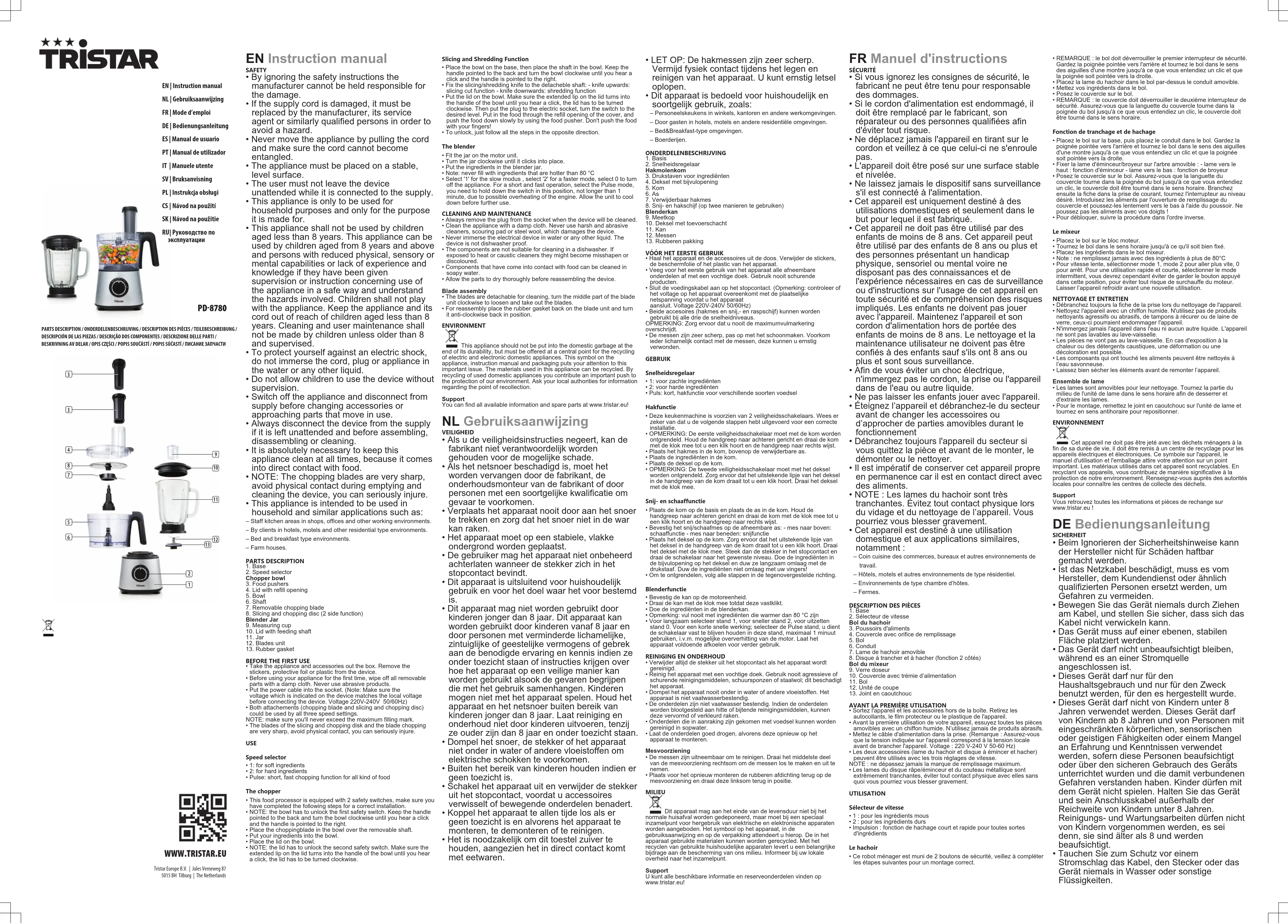 - Cet appareil est destiné à une utilisation domestique et aux applications similaires, notamment: – Coin cuisine des commerces, bureaux et autres environnements detravail.– Hôtels, motels et autres environnements de type résidentiel.– Environnements de type chambre d’hôtes.– Fermes.DESCRIPTION DES PIÈCES1. Base2. Sélecteur de vitesseBol du hachoir3. Poussoirs d'aliments4. Couvercle avec orifice de remplissage5. Bol6. Conduit7. Lame de hachoir amovible8. Disque à trancher et à hacher (fonction 2 côtés)Bol du mixeur9. Verre doseur10. Couvercle avec trémie d’alimentation11. Bol12. Unité de coupe13. Joint en caoutchoucAVANT LA PREMIÈRE UTILISATION• Sortez l'appareil et les accessoires hors de la boîte.Retirez lesautocollants, le film protecteur ou le plastique de l'appareil.• Avant la première utilisation de votre appareil, essuyez toutes les piècesamovibles avec un chiffon humide. N’utilisez jamais de produits abrasifs.• Mettez le câble d'alimentation dans la prise.(Remarque : Assurez-vousque la tension indiquée sur l'appareil correspond à la tension localeavant de brancher l'appareil.Voltage : 220 V-240 V 50-60 Hz)• Les deux accessoires (lame du hachoir et disque à émincer et hacher)peuvent être utilisés avec les trois réglages de vitesse.NOTE: ne dépassez jamais la marque de remplissage maximum.• Les lames du disque râpe/éminceur et du couteau métallique sontextrêmement tranchantes, éviter tout contact physique avec elles sansquoi vous pourriez vous blesser gravement.UTILISATIONSélecteur de vitesse• 1: pour les ingrédients mous• 2: pour les ingrédients durs• Impulsion: fonction de hachage court et rapide pour toutes sortesd'ingrédientsLe hachoir• Ce robot ménager est muni de 2 boutons de sécurité, veillez à compléterles étapes suivantes pour un montage correct.• REMARQUE: le bol doit déverrouiller le premier interrupteur de sécurité.Gardez la poignée pointée vers l'arrière et tournez le bol dans le sensdes aiguilles d'une montre jusqu'à ce que vous entendiez un clic et quela poignée soit pointée vers la droite.• Placez la lame du hachoir dans le bol par-dessus le conduit amovible.• Mettez vos ingrédients dans le bol.• Posez le couvercle sur le bol.• REMARQUE: le couvercle doit déverrouiller le deuxième interrupteur desécurité. Assurez-vous que la languette du couvercle tourne dans lapoignée du bol jusqu'à ce que vous entendiez un clic, le couvercle doitêtre tourné dans le sens horaire.Fonction de tranchage et de hachage• Placez le bol sur la base, puis placez le conduit dans le bol. Gardez lapoignée pointée vers l'arrière et tournez le bol dans le sens des aiguillesd'une montre jusqu'à ce que vous entendiez un clic et que la poignéesoit pointée vers la droite.• Fixer la lame d'éminceur/broyeur sur l'arbre amovible : - lame vers lehaut : fonction d'éminceur - lame vers le bas : fonction de broyeur• Posez le couvercle sur le bol. Assurez-vous que la languette ducouvercle tourne dans la poignée du bol jusqu'à ce que vous entendiezun clic, le couvercle doit être tourné dans le sens horaire. Branchezensuite la fiche dans la prise de courant, tournez l'interrupteur au niveaudésiré. Introduisez les aliments par l'ouverture de remplissage ducouvercle et poussez-les lentement vers le bas à l'aide du poussoir. Nepoussez pas les aliments avec vos doigts!• Pour débloquer, suivre la procédure dans l'ordre inverse.Le mixeur• Placez le bol sur le bloc moteur.• Tournez le bol dans le sens horaire jusqu'à ce qu'il soit bien fixé.• Placez les ingrédients dans le bol mixeur.• Note : ne remplissez jamais avec des ingrédients à plus de 80°C• Pour vitesse lente, sélectionner mode 1, mode 2 pour aller plus vite, 0pour arrêt. Pour une utilisation rapide et courte, sélectionner le modeintermittent, vous devrez cependant éviter de garder le bouton appuyédans cette position, pour éviter tout risque de surchauffe du moteur.Laisser l’appareil refroidir avant une nouvelle utilisation.NETTOYAGE ET ENTRETIEN• Débranchez toujours la fiche de la prise lors du nettoyage de l'appareil.• Nettoyez l'appareil avec un chiffon humide. N'utilisez pas de produitsnettoyants agressifs ou abrasifs, de tampons à récurer ou de laine deverre, ceux-ci pourraient endommager l'appareil.• N'immergez jamais l'appareil dans l'eau ni aucun autre liquide. L'appareilne sont pas lavables au lave-vaisselle.• Les pièces ne vont pas au lave-vaisselle. En cas d'exposition à lachaleur ou des détergents caustiques, une déformation ou unedécoloration est possible.• Les composants qui ont touché les aliments peuvent être nettoyés àl’eau savonneuse.• Laissez bien sécher les éléments avant de remonter l’appareil.Ensemble de lame• Les lames sont amovibles pour leur nettoyage. Tournez la partie dumilieu de l'unité de lame dans le sens horaire afin de desserrer etd'extraire les lames.• Pour le montage, remettez le joint en caoutchouc sur l'unité de lame ettournez en sens antihoraire pour repositionner.ENVIRONNEMENTCet appareil ne doit pas être jeté avec les déchets ménagers à lafin de sa durée de vie, il doit être remis à un centre de recyclage pour lesappareils électriques et électroniques. Ce symbole sur l'appareil, lemanuel d'utilisation et l'emballage attire votre attention sur un pointimportant. Les matériaux utilisés dans cet appareil sont recyclables. Enrecyclant vos appareils, vous contribuez de manière significative à laprotection de notre environnement. Renseignez-vous auprès des autoritéslocales pour connaître les centres de collecte des déchets.SupportVous retrouvez toutes les informations et pièces de rechange surwww.tristar.eu! DEBedienungsanleitung SICHERHEIT