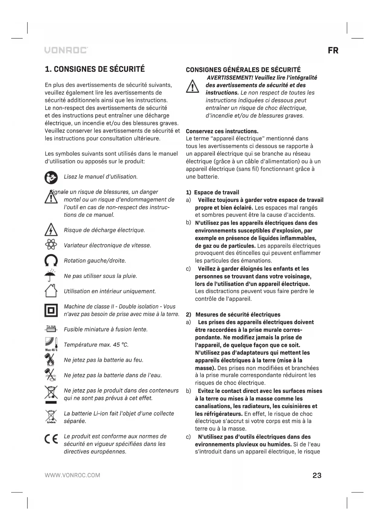Avant le nettoyage et l’entretien, mettez toujours la machine hors tension et retirez la batterie de la machine. Nettoyez le corps de la machine régulièrement au moyen d’un chiffon doux, de préférence après chaque utilisation. Vérifiez que les ouvertures d’aération ne sont pas obstruées ni sales. Utilisez un chiffon doux légèrement humidifié avec de la mousse de savon pour nettoyer les taches persistantes. N’utilisez pas de produits de nettoyage tels que l’essence, l’alcool, l’ammoniac, etc.; ces produits peuvent endommager les parties synthétiques. ENVIRONNEMENT Les équipements électroniques ou électriques défectueux ou destinés à être mis au rebut doivent être déposés aux points de recyclage appropriés. Uniquement pour les pays de l’UE Ne jetez pas les outils électriques avec les déchets domestiques. Selon la Directive européenne 2012/19/CE relative aux déchets d’équipements électriques et électroniques et sa mise en œuvre dans le droit national, les outils électriques hors d’usage doivent être collectés séparément et mis au rebut de manière écologique. GARANTIE Les produits VONROC sont développés aux plus hau- ts standards de qualité et ils sont garantis contre les défauts de pièces et de main d’oeuvre pendant la durée légale stipulée à partir de la date d’achat d’o- rigine du produit. En cas d’une quelconque panne du produit pendant cette durée qui serait due à un défaut matériel et/ou de main d’oeuvre, contactez directement VONROC. Les circonstances suivantes ne sont pas prises en charge par la garantie: