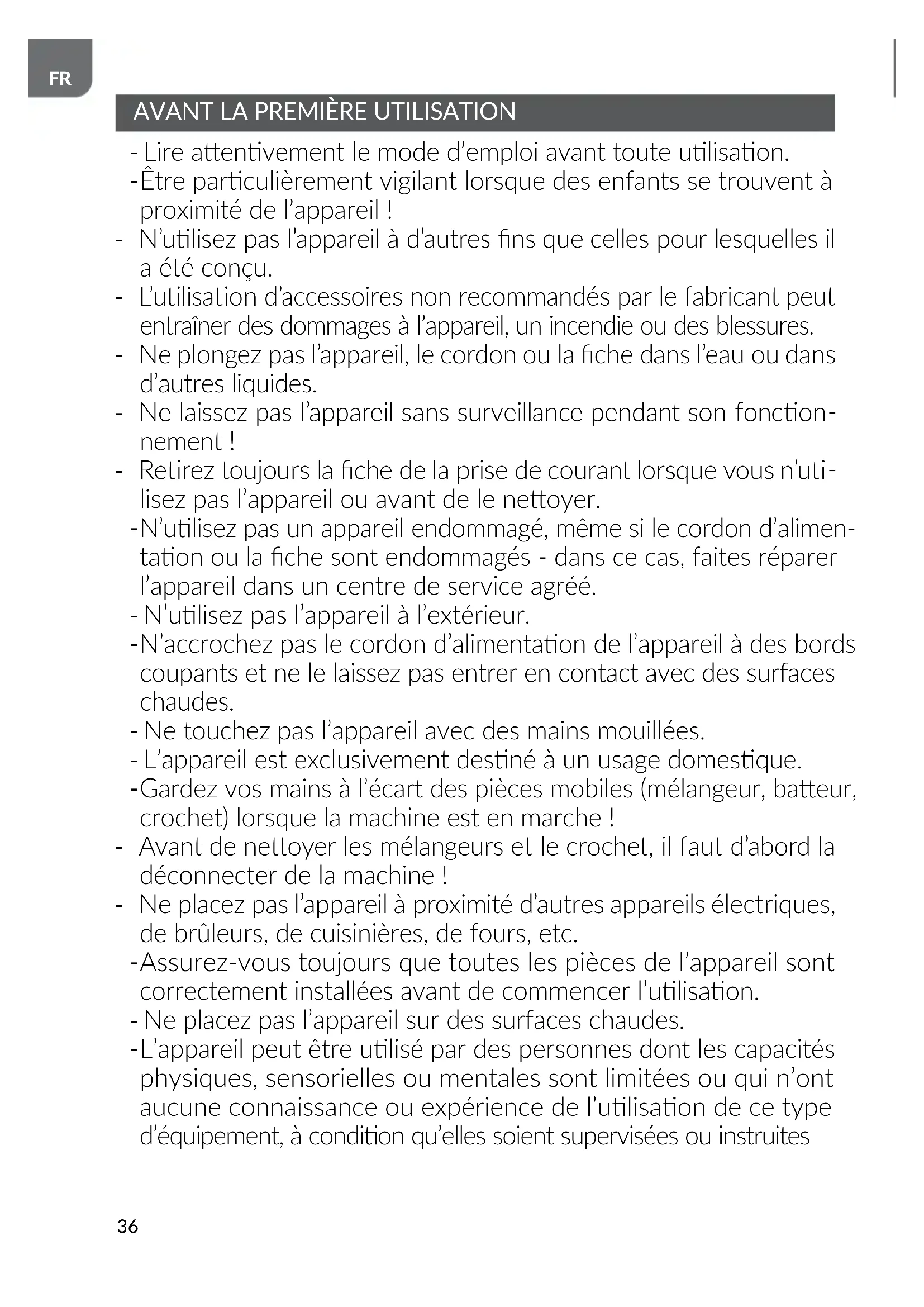Gardez vos mains à l’écart des pièces mobiles (mélangeur, baeur, crochet) lorsque la machine est en marche ! - Avant de neoyer les mélangeurs et le crochet, il faut d’abord la déconnecter de la machine ! - Ne placez pas l’appareil à proximité d’autres appareils électriques, de brûleurs, de cuisinières, de fours, etc.