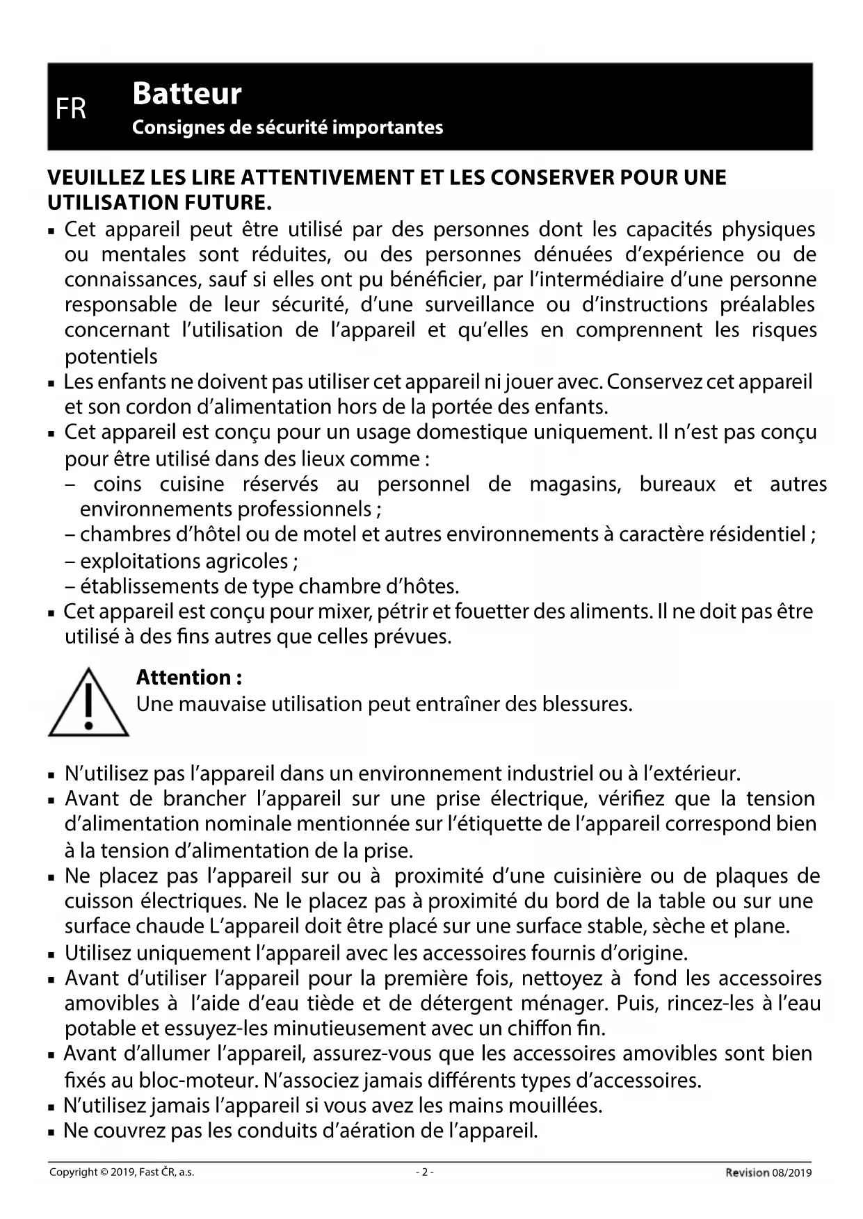 Copyright © 2019, Fast ČR, a.s. ■ Ne faites pas fonctionner l’appareil sans charge. Une mauvaise utilisation de l’appareil peut aecter de façon négative sa durée de vie. ■ Ne démarrez l’appareil qu’après avoir submergé le fouet, les batteurs ou les crochets pétrisseurs dans le récipient avec les ingrédients. Pour éviter que les aliments n’éclaboussent, conservez les accessoires submergés dans le récipient avec les ingrédients tant que l’appareil est en marche. ■ Évitez tout contact avec les parties en rotation de l’appareil. Pendant le mélange, ne placez pas les mains, ni de fourchettes ou tout autre ustensile dans le bol avec les ingrédients, et tenez vos cheveux, vêtements, etc. àune distance susante des parties en rotation de l’appareil Si une fourchette ou un autre ustensile tombe dans le récipient au cours du mélange, éteignez immédiatement l’appareil. ■ Soyez particulièrement prudent lors de la manipulation d’aliments et de liquides chauds. La vapeur chaude ou les éclaboussures d’aliments et de liquides chauds peuvent vous ébouillanter. Pour des raisons de sécurité, il est recommandé de laisser les liquides chauds refroidir avant de les mélanger. Ne mélangez jamais d’aliments et de liquides chauds directement sur une plaque de cuisson allumée. ■ Si vous venez de traiter des aliments chauds, les accessoires amovibles peuvent être chauds après utilisation. ■ Si les ingrédients se collent aux accessoires en rotation ou àl’intérieur des parois du récipient, éteignez l’appareil et débranchez-le de l’alimentation. Assurez-vous que les pièces en rotation sont àl’arrêt complet et retirez les accessoires. Nettoyez les parois du récipient et les accessoires àl’aide d’une spatule en plastique. Puis, remontez l’appareil, branchez-le àune prise et poursuivez le mélange. ■ Ne laissez pas l’appareil fonctionner de façon continue pendant plus de 10 minutes. Avant de le rallumer, laissez-le refroidir. ■ Éteignez toujours l’appareil et débranchez-le de la prise de courant si vous ne l’utilisez pas et si vous le laissez sans surveillance, avant de l’assembler, le désassembler, le nettoyer, le déplacer ou de changer les accessoires. Avant le démontage ou le remplacement d’accessoires mobiles au cours du fonctionnement, assurez-vous que les pièces en rotation sont àl’arrêt complet. ■ Maintenez l’appareil propre. Nettoyez-le conformément aux consignes du chapitre Nettoyage et entretien. Ne submergez pas le bloc-moteur et le cordon d’alimentation dans l’eau ou tout autre liquide, et ne lavez pas ces pièces àl’eau courante. Les accessoires amovibles sont conçus pour rester peu de temps en contact avec la nourriture (ycompris les boissons), àsavoir 4 heures max. Pour prévenir l’endommagement de leur surface, ne les laissez pas submergés, par exemple dans l’eau pendant des périodes de temps prolongées. ■ Assurez-vous que la che d’alimentation n’entre pas en contact avec des parties humides. Ne placez pas d’objets lourds sur le cordon d’alimentation. Assurez-vous que le cordon d’alimentation ne pende pas d’un bord de la table ou qu’il n’entre pas en contact avec une surface chaude.08/2019