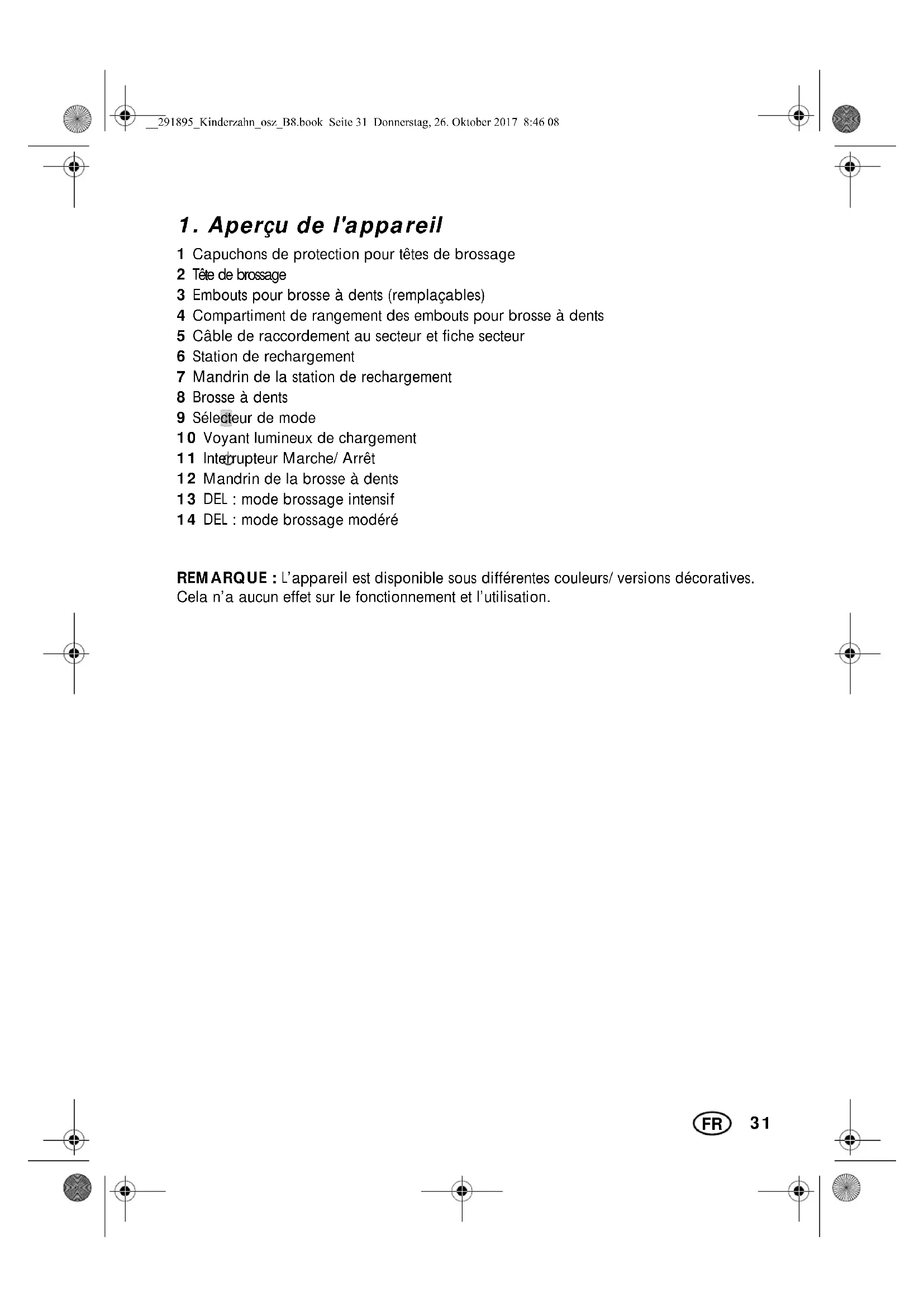 1 Capuchons de protection pour têtes de brossage 2 Tête de brossage 3 Embouts pour brosse à dents (remplaçables) 4 Compartiment de rangement des embouts pour brosse à dents 5 Câble de raccordement au secteur et fiche secteur 6 Station de rechargement 7 Mandrin de la station de rechargement 8 Brosse à dents 9 Sélecteur de mode 10 Voyant lumineux de chargement 11 Interrupteur Marche/Arrêt 12 Mandrin de la brosse à dents 13 DEL : mode brossage intensif 14 DEL : mode brossage modéré REMARQUE : L’appareil est disponible sous différentes couleurs/versions décoratives. Cela n’a aucun effet sur le fonctionnement et l’utilisation. BBB.LQGHU]DKQBRV]B%ERRN6HLWH'RQQHUVWDJ2NWREHU32