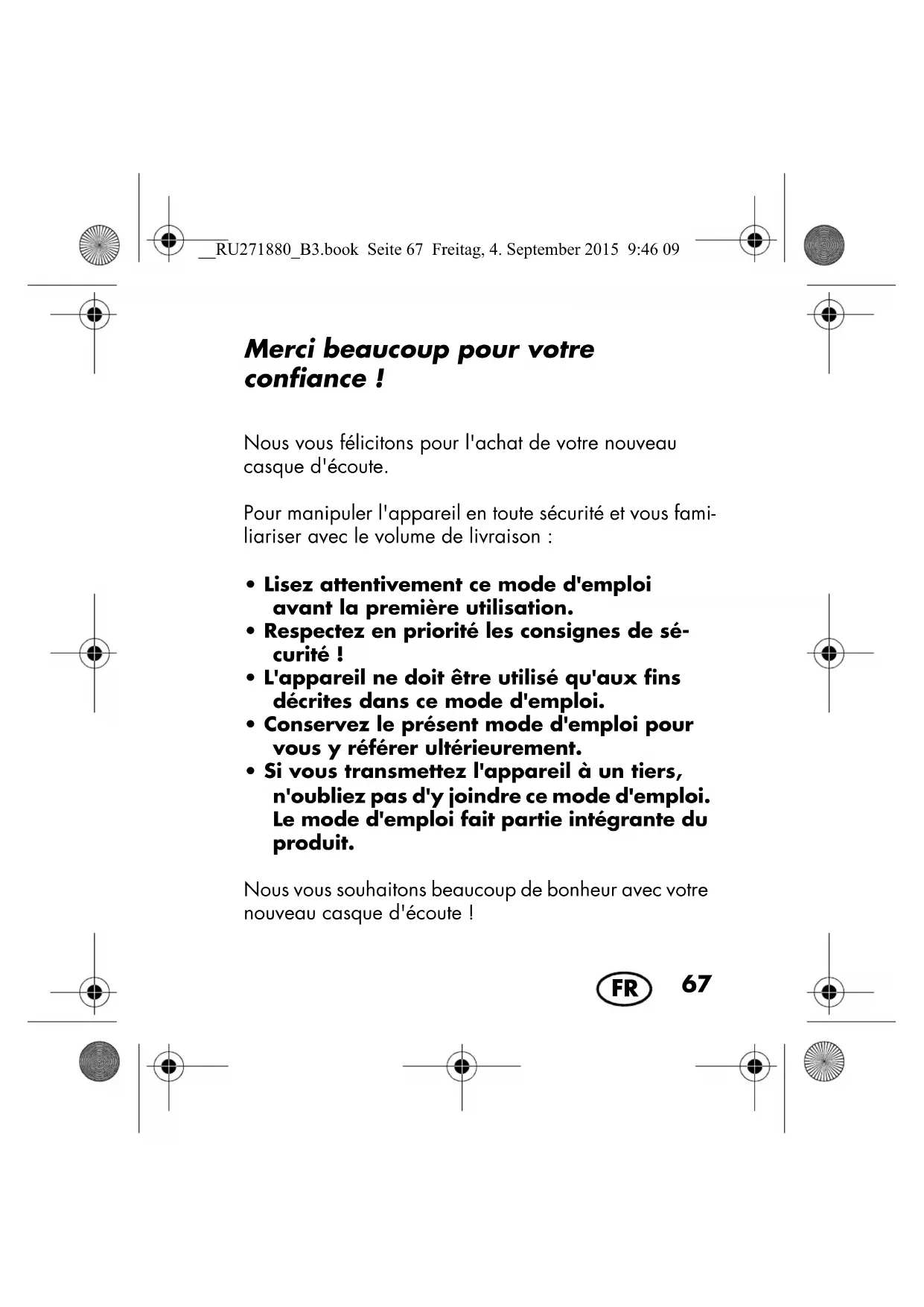 - Si vous transmettez l'appareil à un tiers, n'oubliez pas d'y joindre ce mode d'emploi. Le mode d'emploi fait partie intégrante du produit. Nous vous souhaitons beaucoup de bonheur avec votre nouveau casque d'écoute !