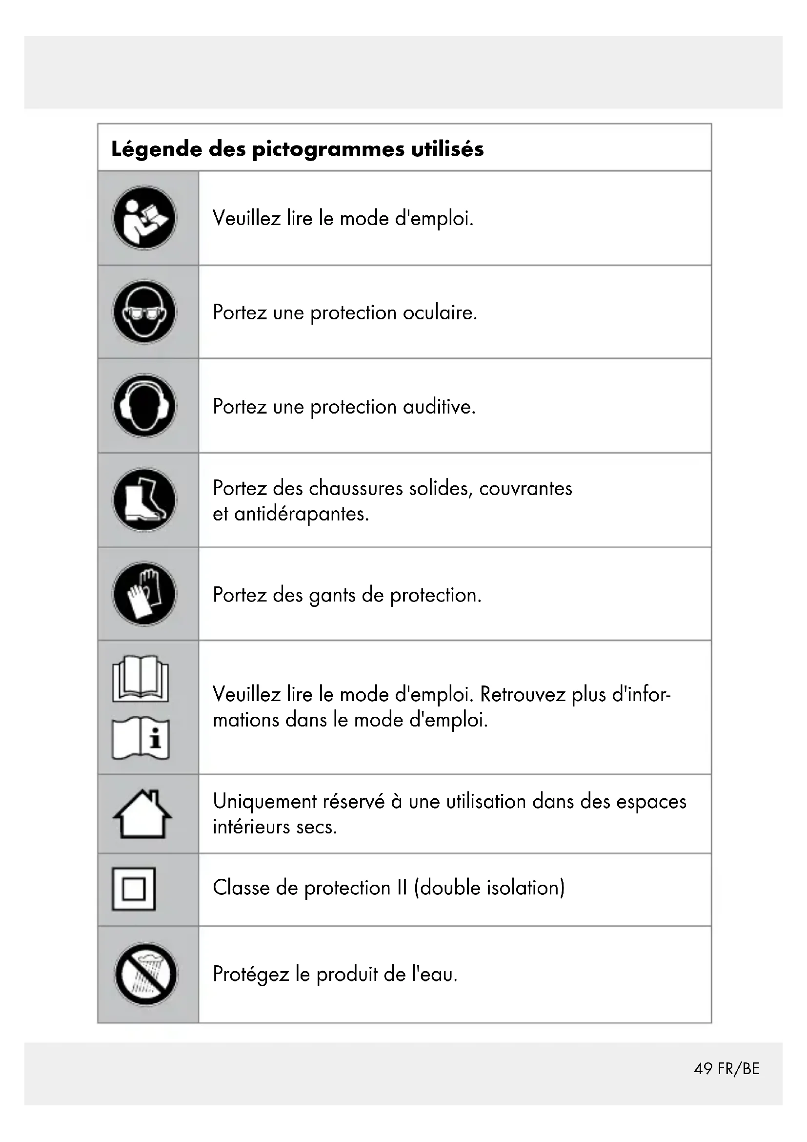 Incertitude K = 1,5m / s 253 FR/BE Remarque: Le niveau de vibration indiqué dans ces instructions a été mesurée conformément à une procédure de mesure normalisée, et peut être utilisé pour comparer les dispositifs. La valeur d‘émission vi- bratoire indiquée peut également être utilisée pour évaluer l‘exposition. Le niveau de vibrations varie en fonction de l‘usage de l‘outil élec- trique et peut, dans certains cas, excéder les valeurs indiquées dans ces instructions. La charge due aux vibrations pourrait être sous-estimée, si l‘outil électrique est utilisé régulièrement de cette manière. Essayez de réduire au maximum l‘exposition aux vibrations. L‘exposition aux vibra- tions peut être réduite, par exemple, grâce au port de gants lors de l‘utilisation de l‘outil et en limitant la durée du travail. Ainsi, tous les composants du cycle de fonctionnement sont à prendre en compte (par exemple les périodes durant lesquelles l‘outil électrique est éteint, et celles où le produit est certes allumé, mais fonctionne en l‘absence de charge). Avertissements de sécurité généraux pour l’outil Lire tous les avertissements de sécurité et toutes les inst- ructions. Ne pas suivre les avertissements et instructions peut donner lieu à un choc électrique, un incendie et / ou une blessure sérieuse !54 FR/BE Conserver tous les avertissements et toutes les instructions pour pouvoir s’y reporter ultérieurement. Le terme «outil» dans les avertissements fait référence à votre outil électrique alimenté par le secteur (avec cordon d’alimentation) ou votre outil fonctionnant sur batterie (sans cordon d’alimentation). Sécurité de la zone de travail a) Conserver la zone de travail propre et bien éclairée. Les zones en désordre ou sombres sont propices aux accidents. b) Ne pas faire fonctionner les outils électriques en atmos- phère explosive, par exemple en présence de liquides inflammables, de gaz ou de poussières. Les outils électriqu