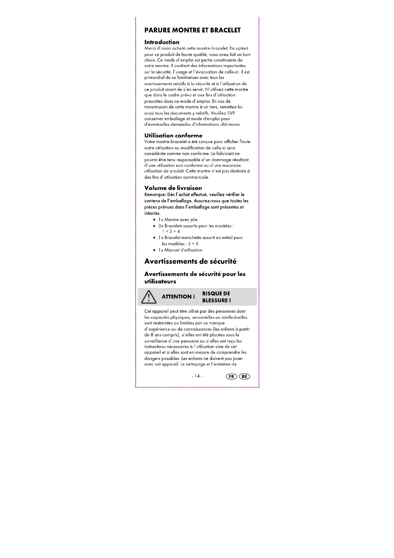 Introduction Merci d’avoir acheté cette montre-bracelet. En optant pour ce produit de haute qualité, vous avez fait un bon choix. Ce mode d’emploi est partie constituante de votre montre. Il contient des informations importantes sur la sécurité, l’usage et l’évacuation de celle-ci. Il est primordial de se familiariser avec tous les avertissements relatifs à la sécurité et à l’utilisation de ce produit avant de s’en servir. N’utilisez cette montre que dans le cadre prévu et aux fins d’utilisation prescrites dans ce mode d’emploi. En cas de transmission de cette montre à un tiers, remettez-lui aussi tous les documents y relatifs. Veuillez SVP conserver emballage et mode d'emploi pour d'éventuelles demandes d'informations ultérieures. Utilisation conforme Votre montre-bracelet a été conçue pour afficher.Toute autre utilisation ou modification de celle-ci sera considérée comme non conforme. Le fabricant ne pourra être tenu responsable d’un dommage résultant d’une utilisation non conforme ou d’une mauvaise utilisation du produit. Cette montre n’est pas destinée à des fins d’utilisation commerciale. Volume de livraison Remarque: Dès l’achat effectué, veuillez vérifier le contenu de l’emballage. Assurez-vous que toutes les pièces prévues dans l’emballage sont présentes et intactes. 1x Montre avec pile 3x Bracelets assortis pour les modèles : 1 + 2 + 4 1x Bracelet manchette assorti en métal pour les modèles : 3 + 5 1x Manuel d'utilisation Avertissements de sécurité Avertissements de sécurité pour les utilisateurs
