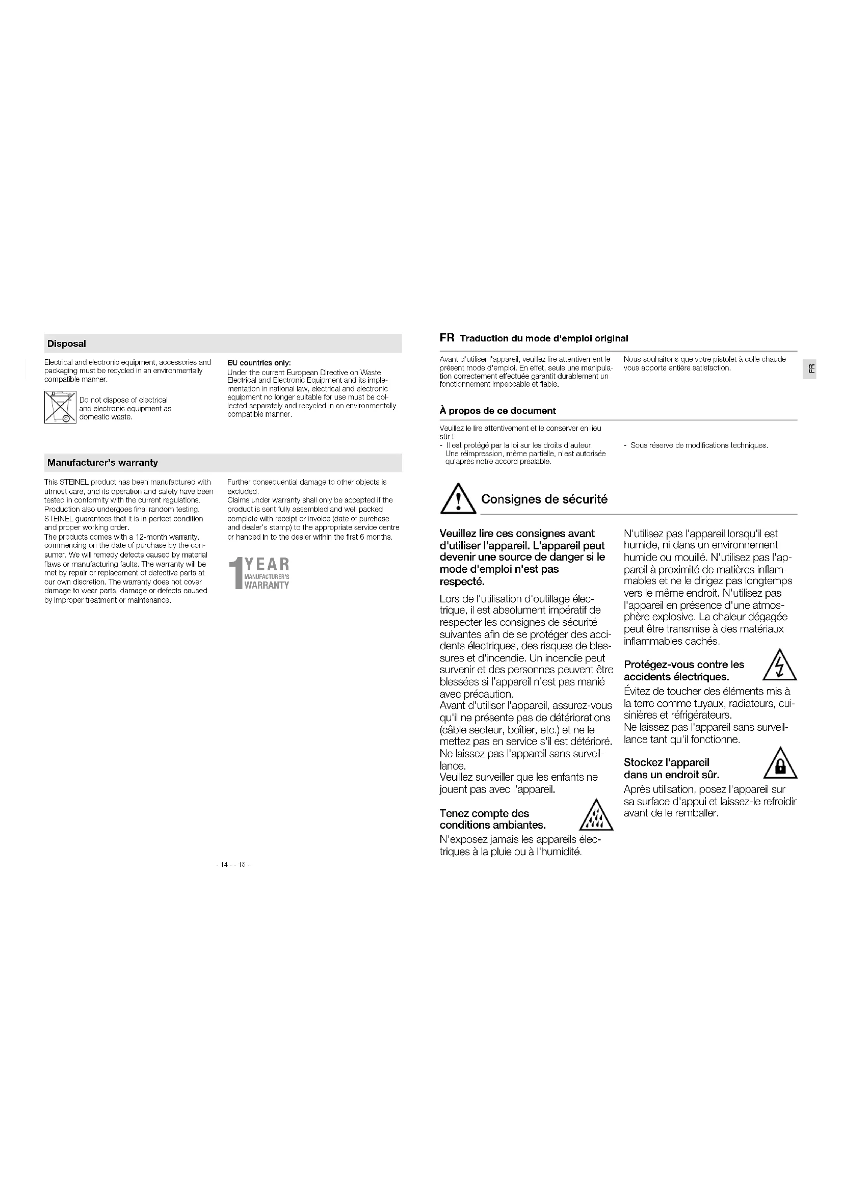 - en fonction de la température et de la viscosité de la colle ** pendant un collage qui dure 30 s / 60 s de pause Autres fonctions du GluePRO400LCD Fonction LOC (Lockable Override Control) Le modèle GluePRO400LCD est équipé de la fonc- tion LOC (Lockable Override Control) pour éviter tout déréglage effectué par inadvertance des réglages sé- lectionnés. Pour obtenir de plus amples informations sur le réglage de la fonction LOC, veuillez contacter notre service après-vente au n° +33/3/20 30 34 00. Mode Repos Le mode Repos fait baisser automatiquement la température dans le corps de chauffe à une tempé- rature à régler après une durée réglable à souhait. La dernière pression sur le bouton est alors ici décisive. Vous reconnaîtrez le mode Repos à la DEL ou à l’écran clignotant en bleu. Cette fonction est désacti- vée départ usine. Pour obtenir de plus amples infor- mations sur le mode Repos, veuillez contacter notre service après-vente au n° +33/3/20 30 34 00. Autres fonctions du GluePRO400LCD- 20 - - 21 - Achage Chauage Causes Solutions«- - -» Fonction LOC (Lockable Override Control) activéeDésactivez la fonction LOC. (Voir « Autres fonctions du GluePRO 400 LCD »)« Err. » Chaud Dépassement de la température maximaleLaissez le pistolet à colle chaude refroidir. Éteignez et rallumez le pistolet à colle chaude.« Err. » Froid Rupture ou court-circuit de la sondeRemplacez le corps de chaue. Pour cela, veuillez contacter votre spécialiste du service après-vente.Un clignotement rapide de la DEL signale une erreur de fonctionnement du GluePRO 300.Si le message d’erreur s’affiche pendant plus de 5minutes, veuillez contacter votre spécialiste du service après-vente. Messages d’erreur et messages indiquant l’état du GluePRO 400 LCD Message d’erreur sur le GluePRO 300 Garantie du fabricant Ce produit STEINEL a été fabriqué avec le plus grand soin. Son fonctionnement et sa sécurité ont été contrôlés suivant des procédures fiables et il a été soumis à un contrôle final par sondage.STEINEL garantit un état et un fonctionnement irréprochables.La durée de garantie est de 12 mois et débute au jour de la vente au consommateur. Nous remédions aux défauts provenant d’un vice de matière ou de construction. La garantie sera assurée à notre dis-crétion par réparation ou échange des pièces dé-fectueuses. La garantie ne s’applique ni aux pièces d’usure, ni aux dommages et défauts dus à une utili-sation ou à une maintenance incorrecte.Les dommages consécutifs causés à d’autres objets sont exclus de la garantie.La garantie ne s’applique que si l’appareil non démonté est retourné au point de service après-vente le plus proche, dans un emballage adéquat, accompagné d’une facture ou d’un ticket de caisse portant la date d’achat et le cachet du vendeur ou s’il est remis au vendeur dans les 6 premiers mois de la garantie.