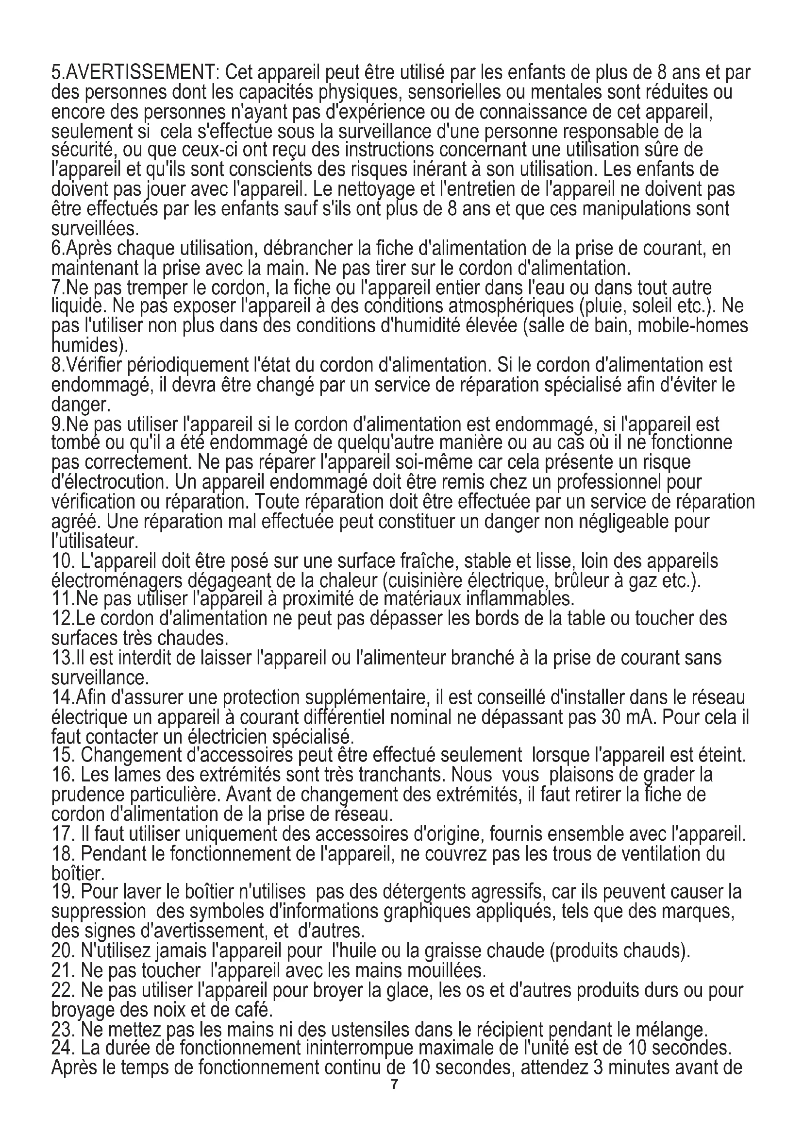 Après le temps de fonctionnement continu de 10 secondes, attendez 3 minutes avant de 6.Après chaque utilisation, débrancher la fiche d'alimentation de la prise de courant, en maintenant la prise avec la main. Ne pas tirer sur le cordon d'alimentation. 8.Vérifier périodiquement l'état du cordon d'alimentation. Si le cordon d'alimentation est endommagé, il devra être changé par un service de réparation spécialisé afin d'éviter le danger. 5.AVERTISSEMENT: Cet appareil peut être utilisé par les enfants de plus de 8 ans et par des personnes dont les capacités physiques, sensorielles ou mentales sont réduites ou encore des personnes n'ayant pas d'expérience ou de connaissance de cet appareil, seulement si cela s'effectue sous la surveillance d'une personne responsable de la sécurité, ou que ceux-ci ont reçu des instructions concernant une utilisation sûre de l'appareil et qu'ils sont conscients des risques inérant à son utilisation. Les enfants de doivent pas jouer avec l'appareil. Le nettoyage et l'entretien de l'appareil ne doivent pas être effectués par les enfants sauf s'ils ont plus de 8 ans et que ces manipulations sont surveillées. 11.Ne pas utiliser l'appareil à proximité de matériaux inflammables. 12.Le cordon d'alimentation ne peut pas dépasser les bords de la table ou toucher des surfaces très chaudes.